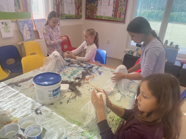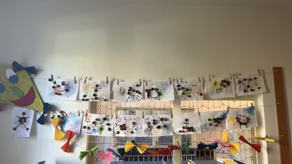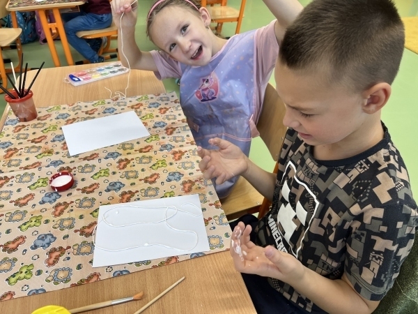 V pátek nás čekalo nejvíc vyrábění. S lepidlem a šňůrkou jsme vytvářeli na papír tvary, které nám připomínají buď hory, nebo moře. Byla to zábava – i když umýt ruce od lepidla a neslepit se navzájem dalo někdy zabrat!