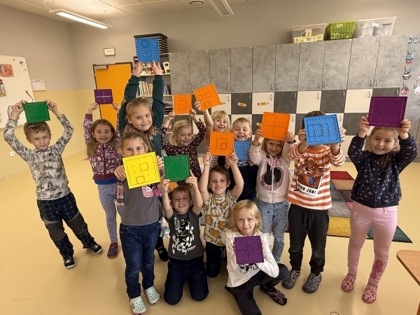 Tento týden jsme se opět věnovali geometrickým útvarům. Zjistili jsme, že všechny útvary můžou různě rotovat – třeba trojúhelník nemusí mít "špičku" jen nahoře, ale klidně i dole. Zkoušeli jsme si práci s geoboardy, na kterých jsme nakonec tvořili čtverce. Zopakovali jsme si porovnávání, naučili se nové číslice a pokračovali ve sčítání. Také jsme byli na návštěvě u čtvrťáků, kteří měli třídu plnou zvířátek. Se spolužáky z 1. A jsme se vydali na procházku. Ale hlavně nás navštívil Pepa z českého jazyka a připravil nám v knihovně nové učebnice! Z těch jsme se naučili naše první písmeno – O.