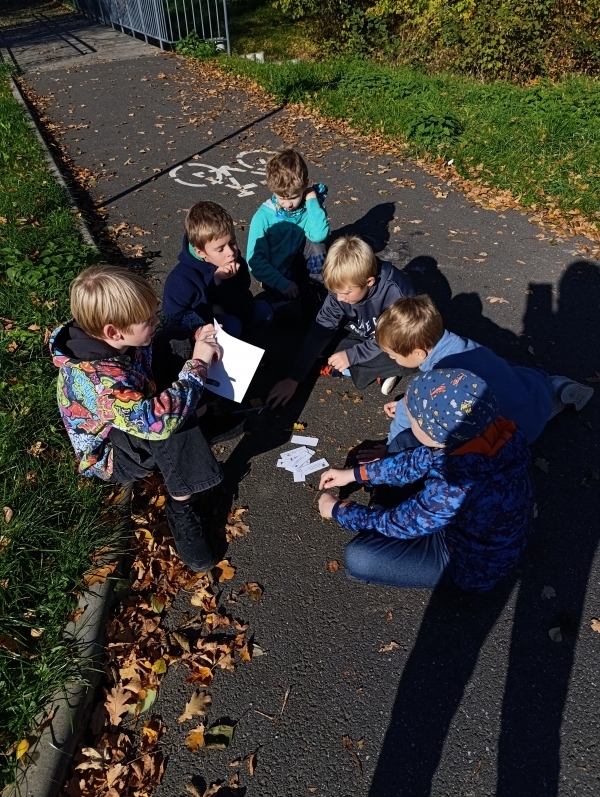Krásné počasí nás vylákalo ven ke společnému plnění úkolů. Páťáci se vžili do role učitelů a pomocníků. Dávali svým spolužákům otázky týkající se podzimu, nachystali jim "běhavku", připravili vystřihování a lepení podzimních plodů, určili, které plody, listy či barvy mají v okolí najít. Žáci rozdělení do smíšených skupin si se vším hravě poradili, užili si nezvyklou spolupráci i příjemný podzimní den.