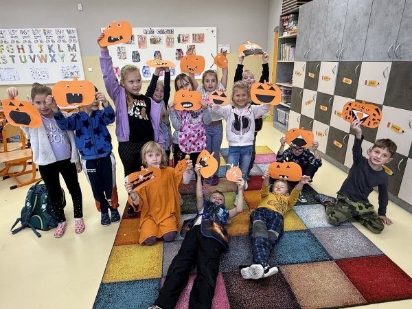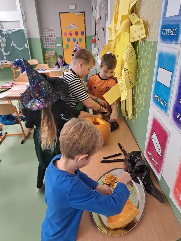 Společně jsme si dlabali dýni, která krásně ozdobila naší třídu Každá skupinka pracovala s nadšením a vznikla spousta originálních výtvorů. Kromě toho si děti vyzkoušely i halloweenské pracovní listy, kde luštily hádanky, počítaly strašidelné příklady a hledaly chyby v textu.