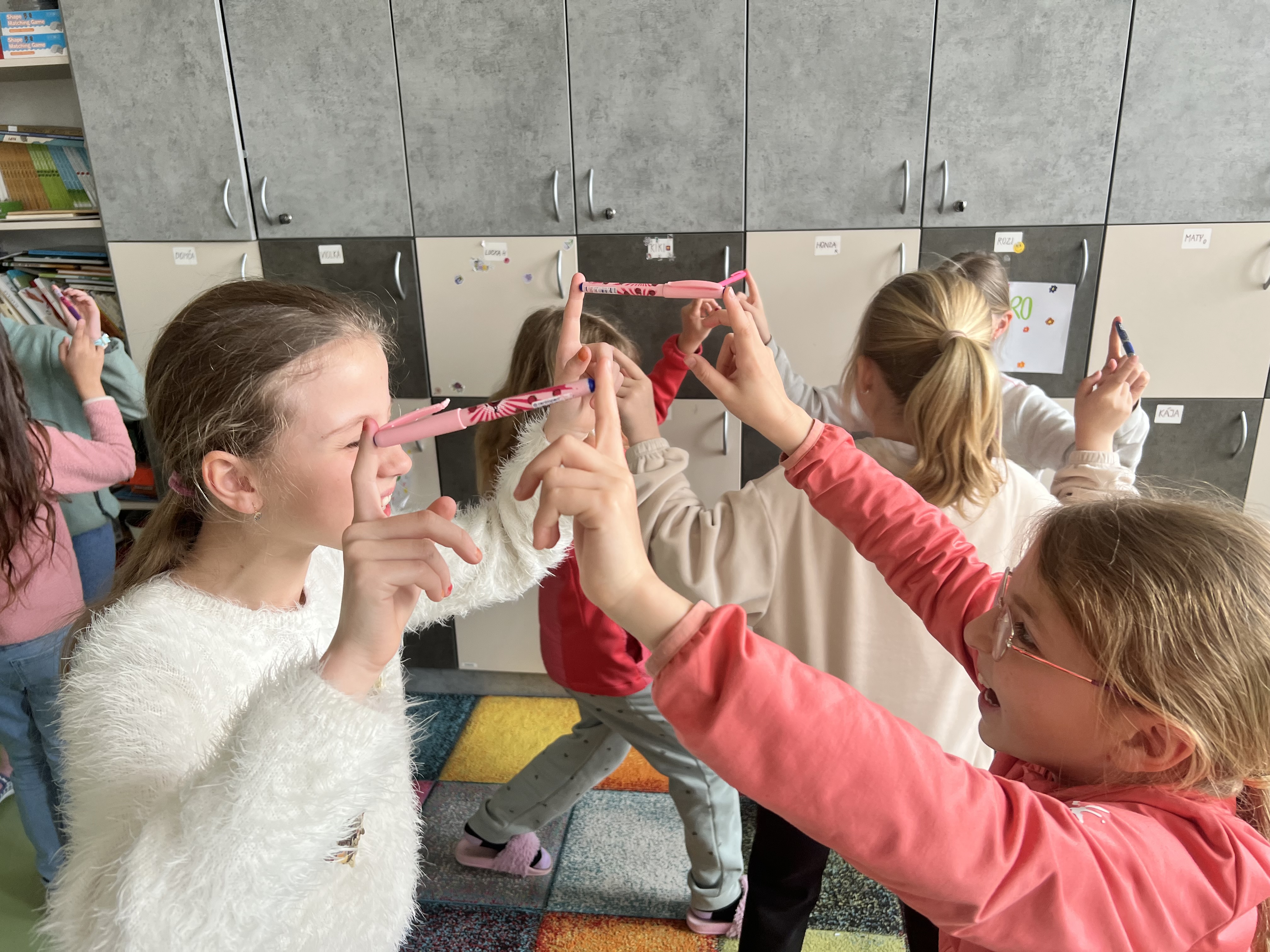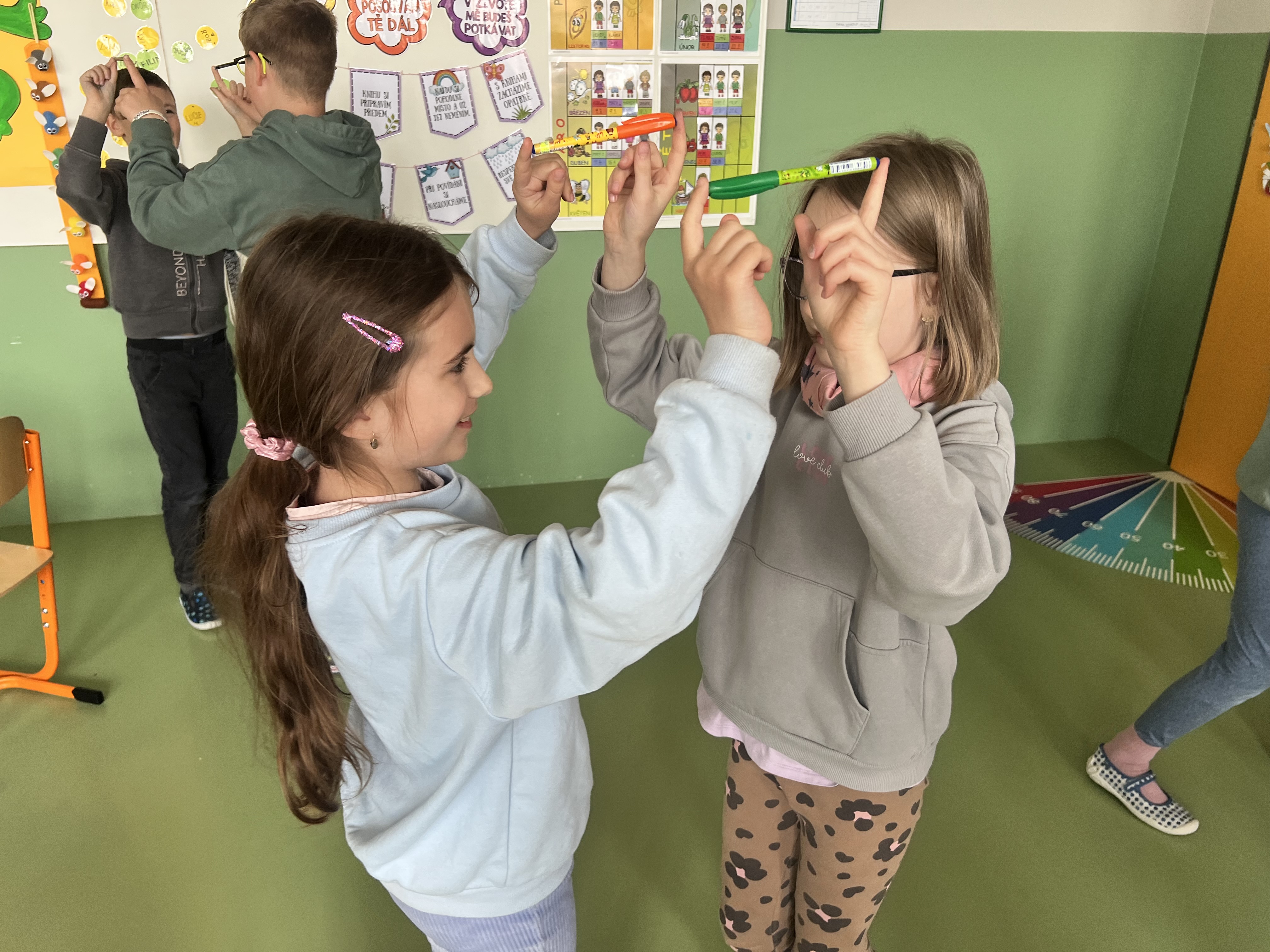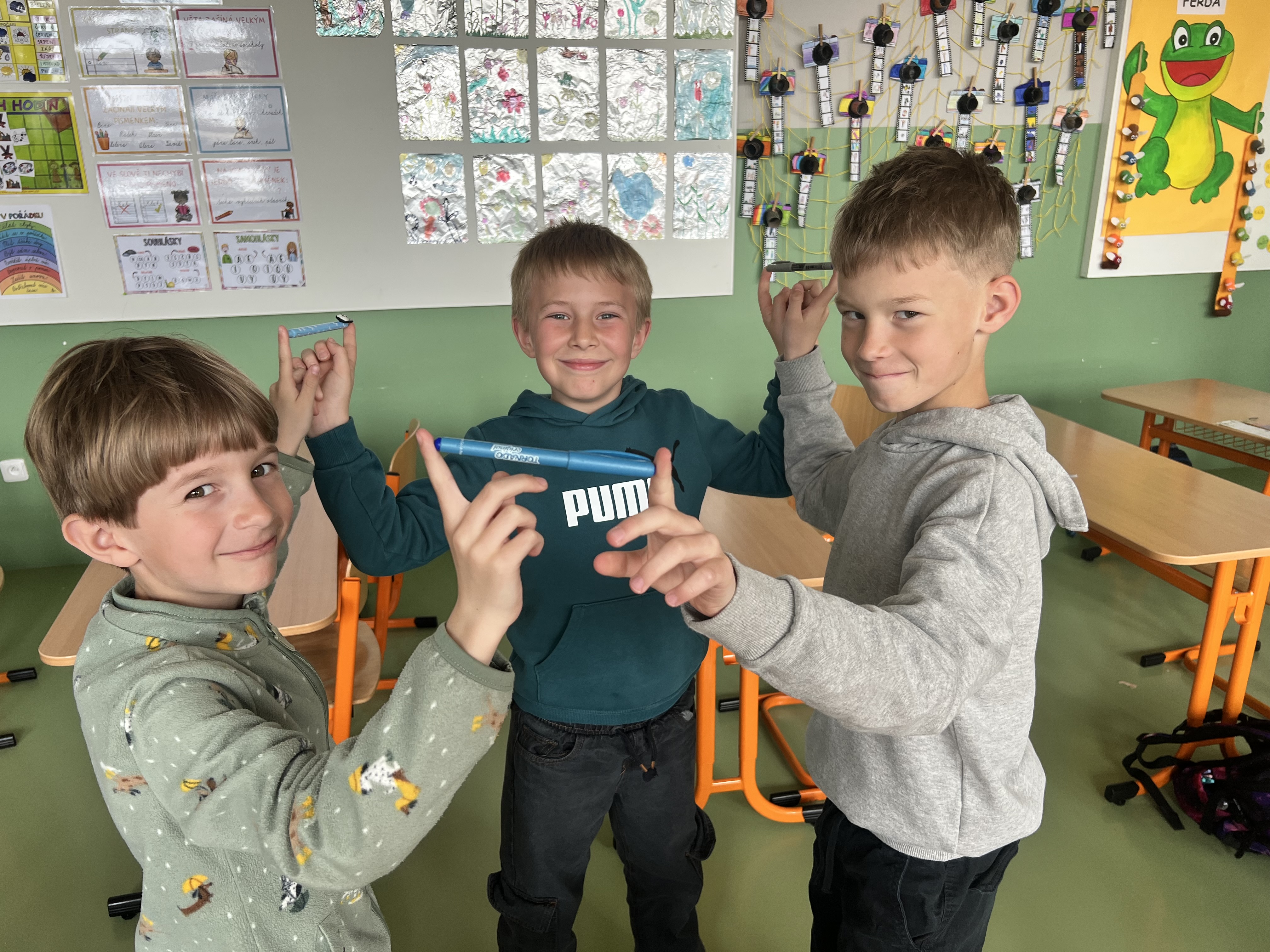 Pracovali jsme ve dvojicích a trojicích. Každý z dvojice či trojice držel jedním prstem společně fix, pero či propisku a snažil se domluvou a v rytmu hudby sladit své kroky do "tance". Ze začátku se nám pomůcky několikrát rozpadly, ale brzy jsme přišli na to, jak na to.