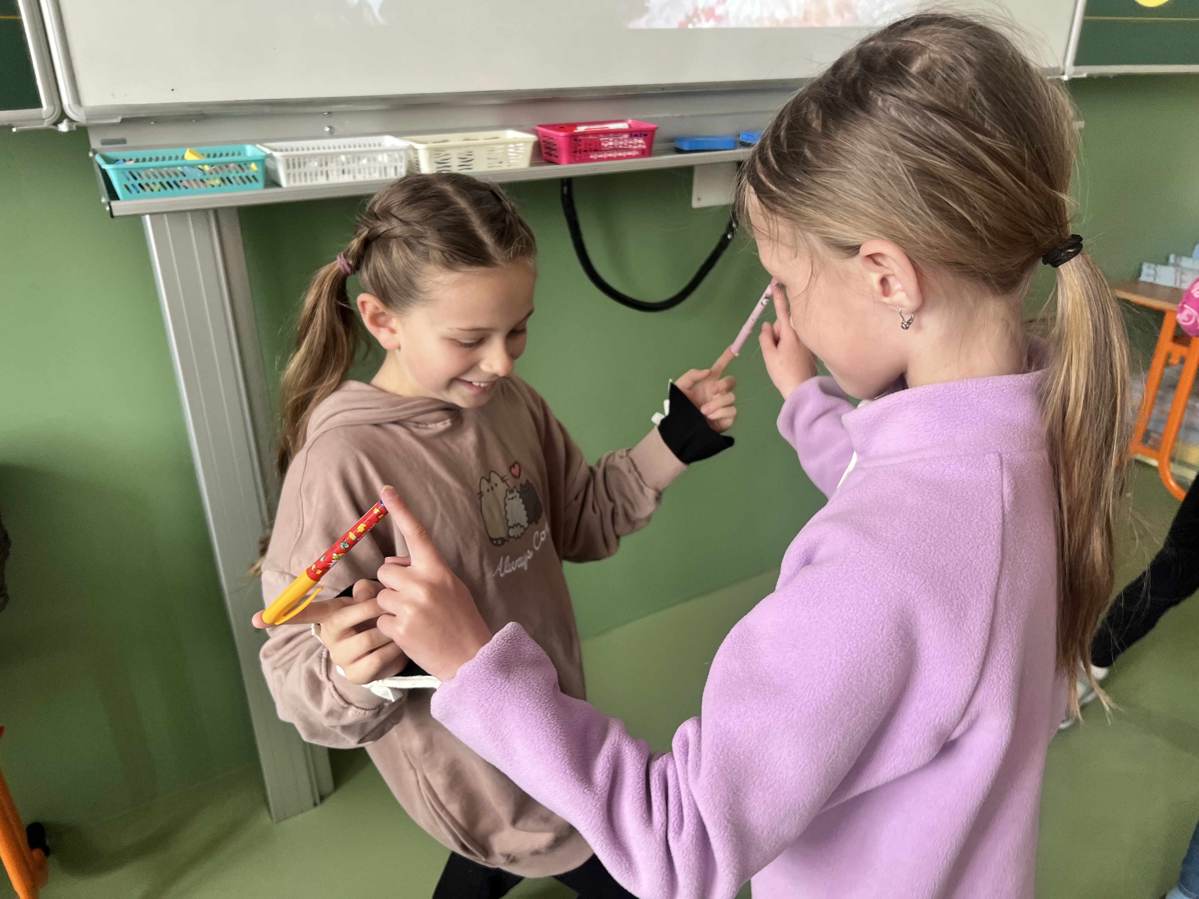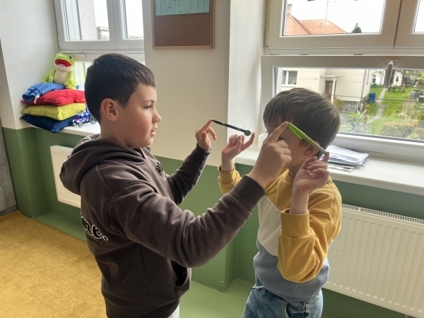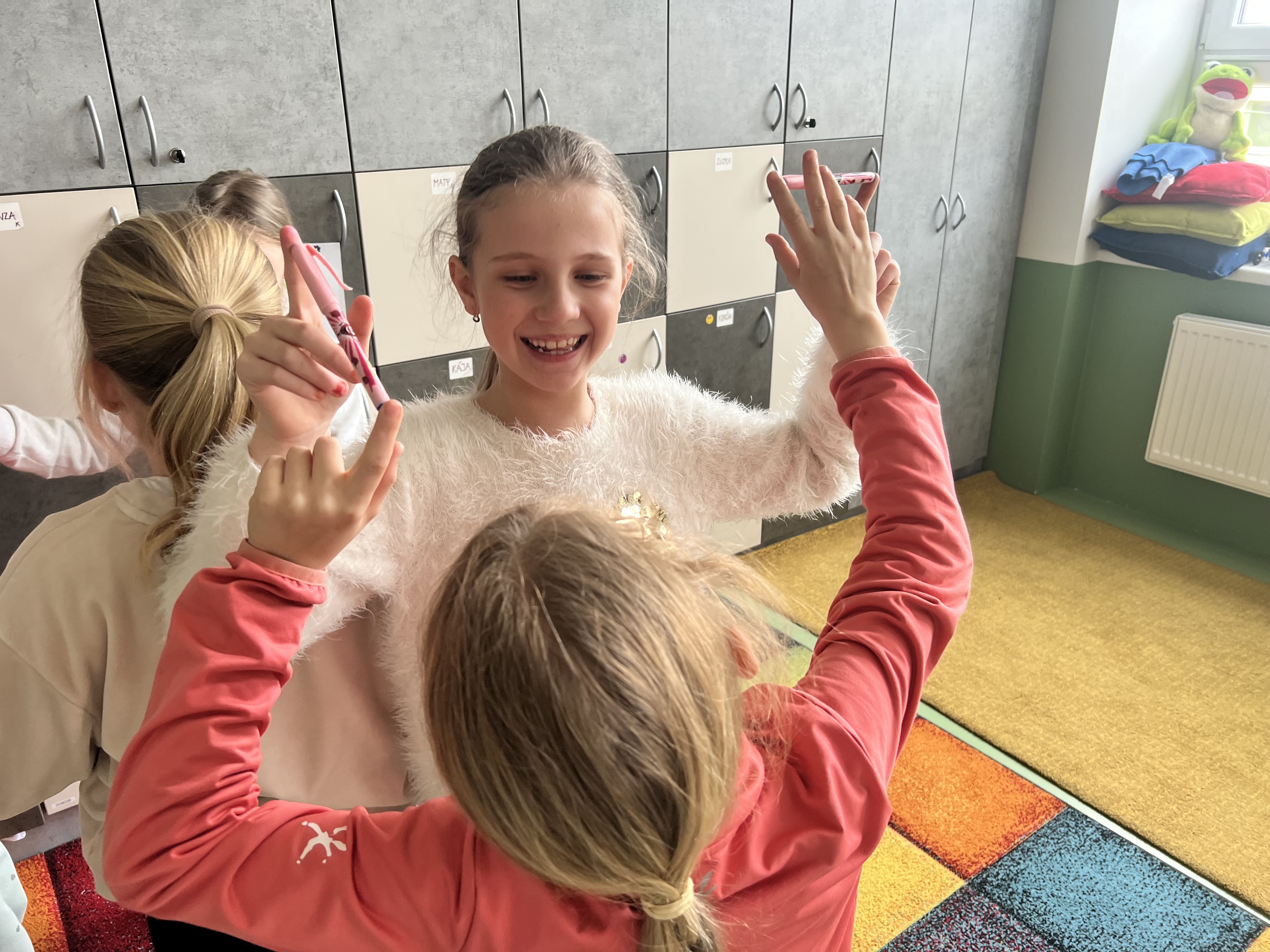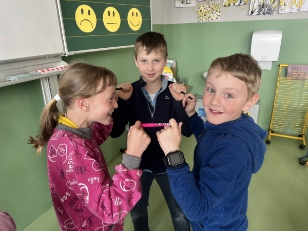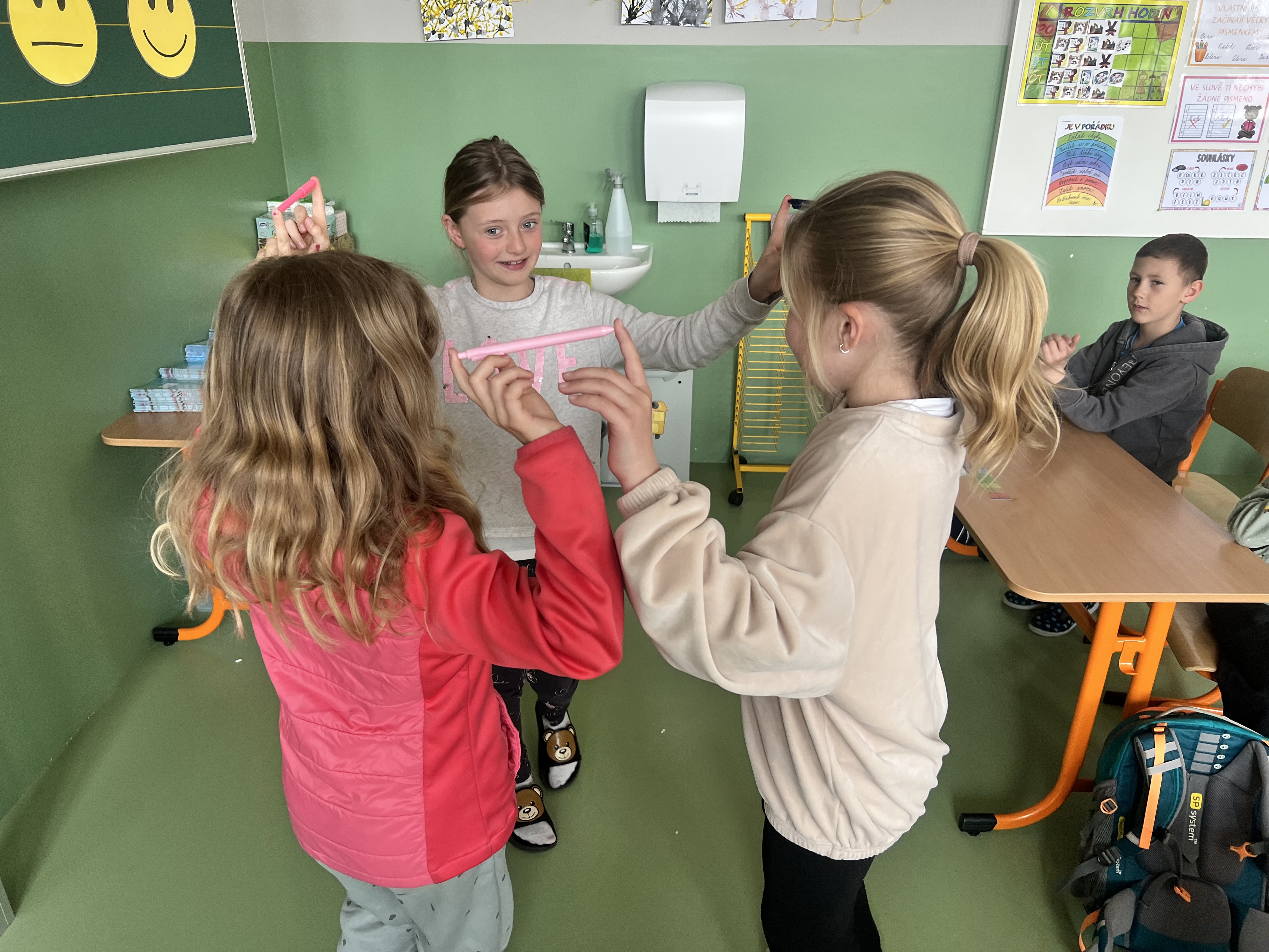 Pracovali jsme ve dvojicích a trojicích. Každý z dvojice či trojice držel jedním prstem společně fix, pero či propisku a snažil se domluvou a v rytmu hudby sladit své kroky do "tance". Ze začátku se nám pomůcky několikrát rozpadly, ale brzy jsme přišli na to, jak na to.