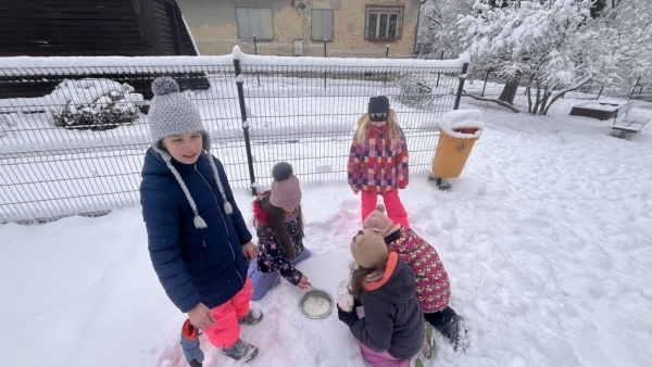 V obchodě jsme nakoupili smetanu na šlehání, cukr a sůl. Pátou hodinu jsme vyrazili na hřiště. Udělali dolík na narezovou misku, dolík posypali vydatně solí - rázem klesne teplota sněhu. A pak jsme položili mísu, nalili smetanu, přidali cukr a podle chuti i granko a míchali. Do 15 minut jsme už koštovali zmrzliny své i spolužáků. Jde to! Odzkoušeno už i čtvrťaky.
