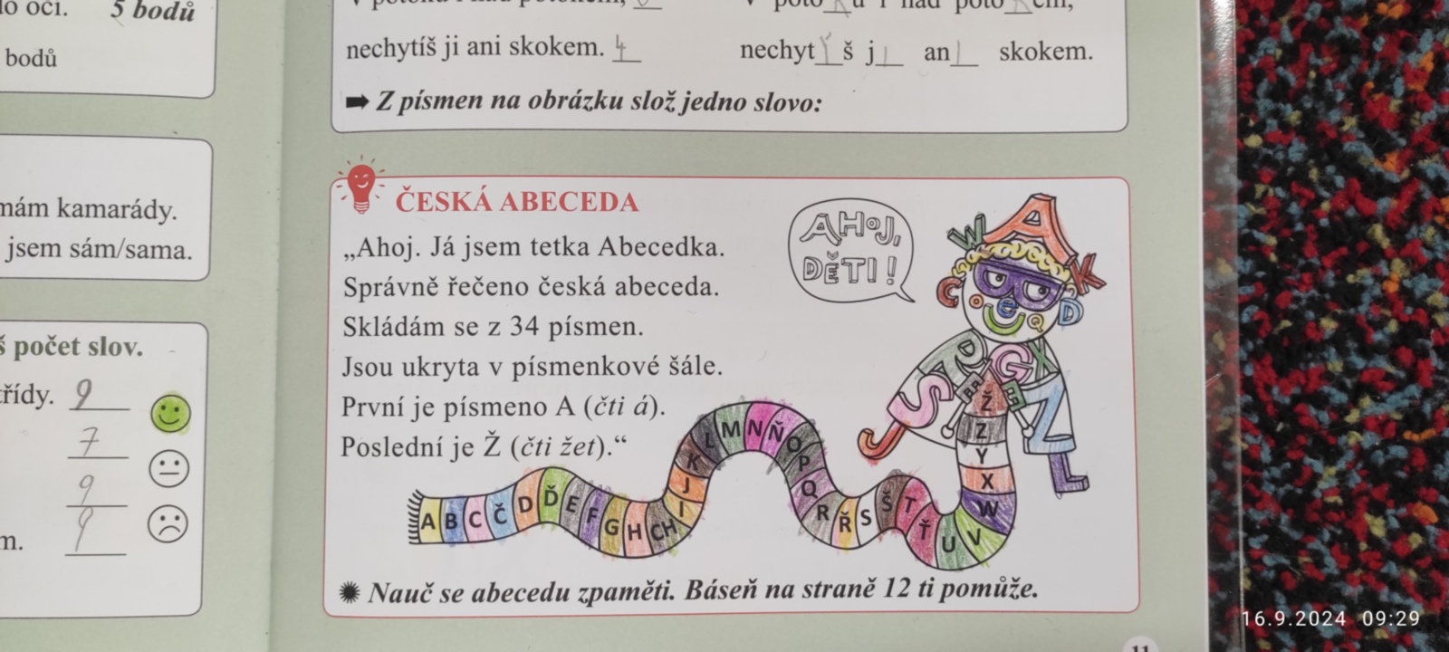 Už jsme druháci a naším úkolem je naučit se českou abecedu. Písmena už umíme, ale abecední pořadí právě trénujeme. A děláme to nejen v pracovním sešitě, ale i pomocí různých her.