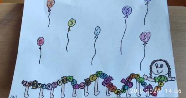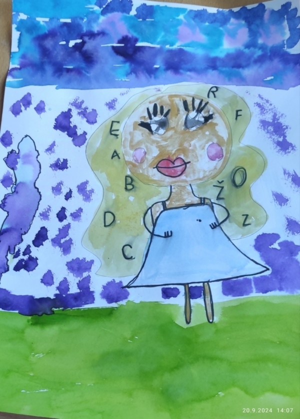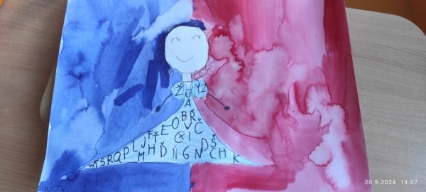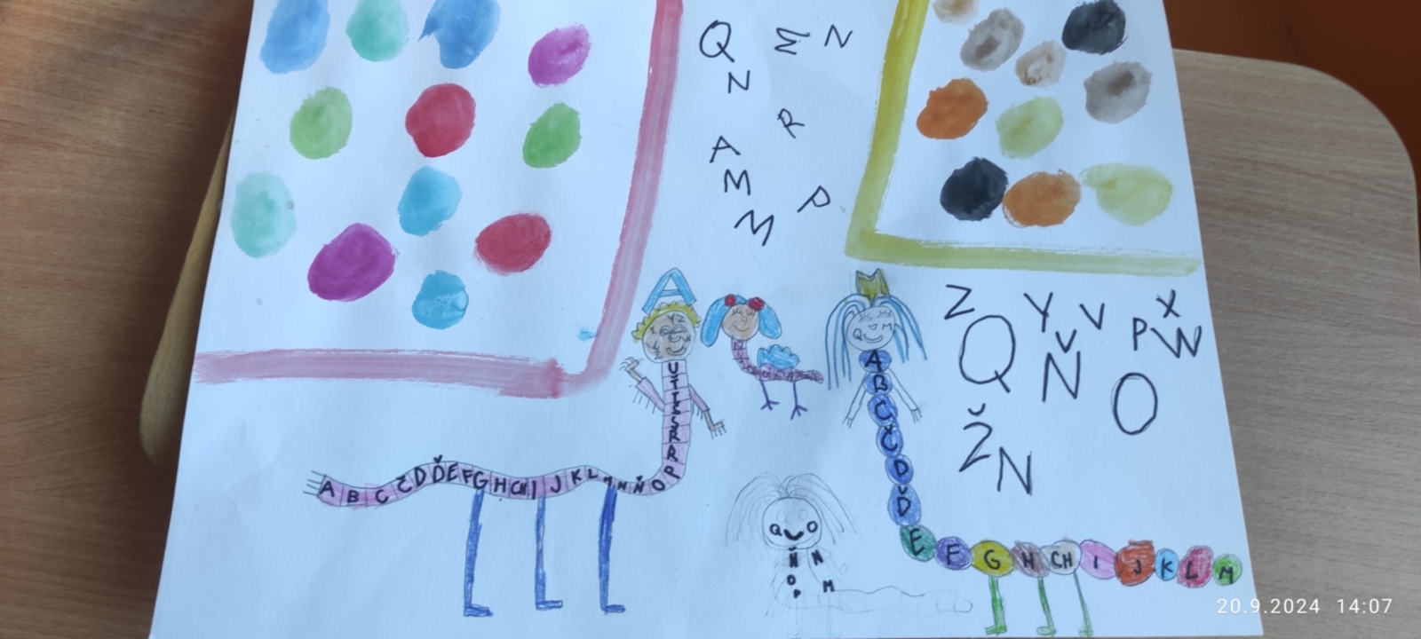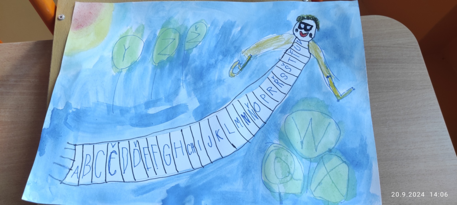 Hodně nám pomohla básnička, díky které už abecedu umíme skoro celou. Také tetlka Abecedka je naše pomocnice, a tak jsme si ji namalovali ve výtvarné výchově.