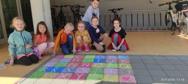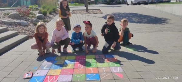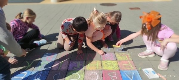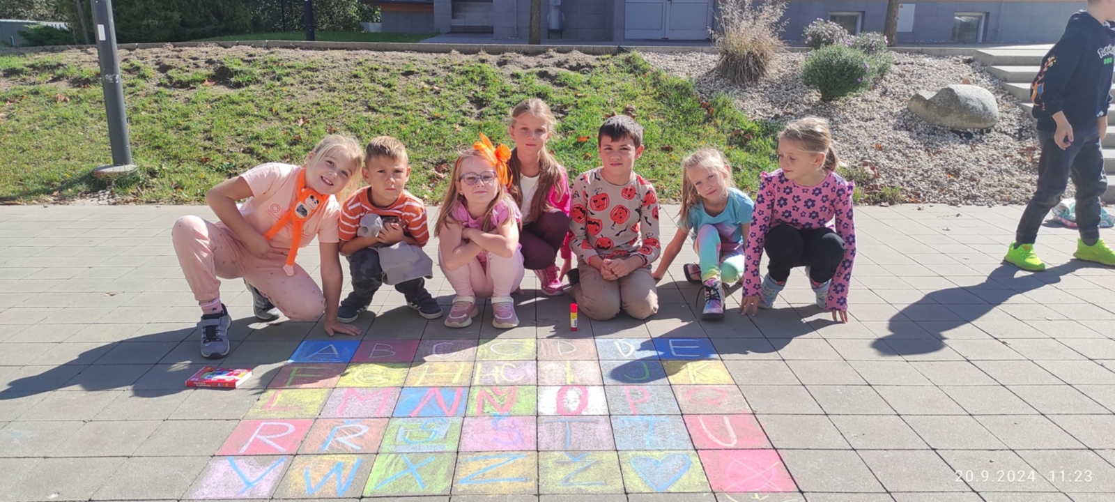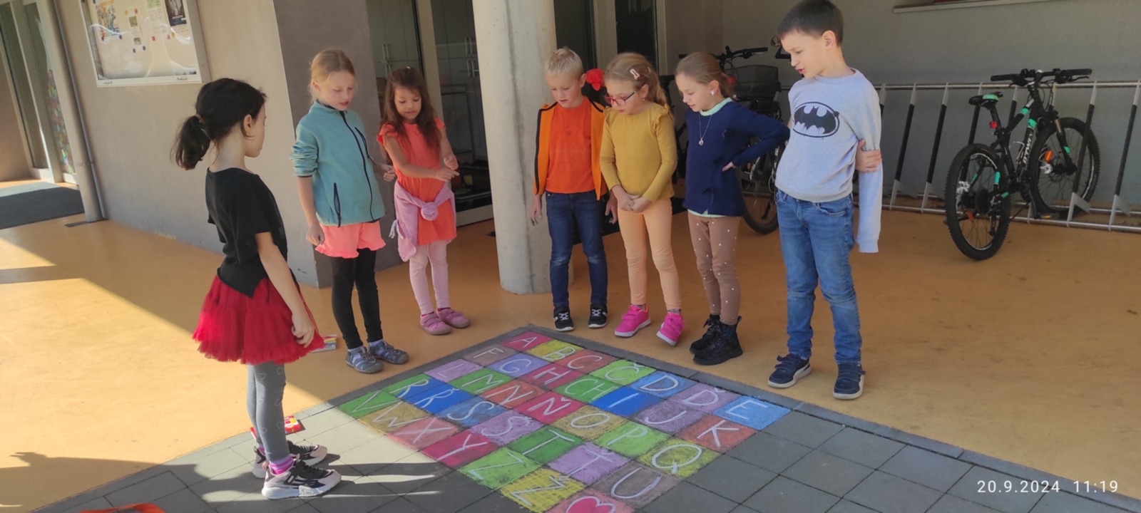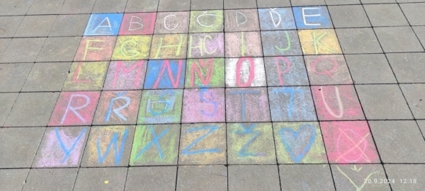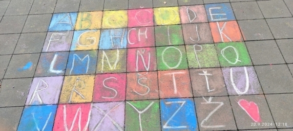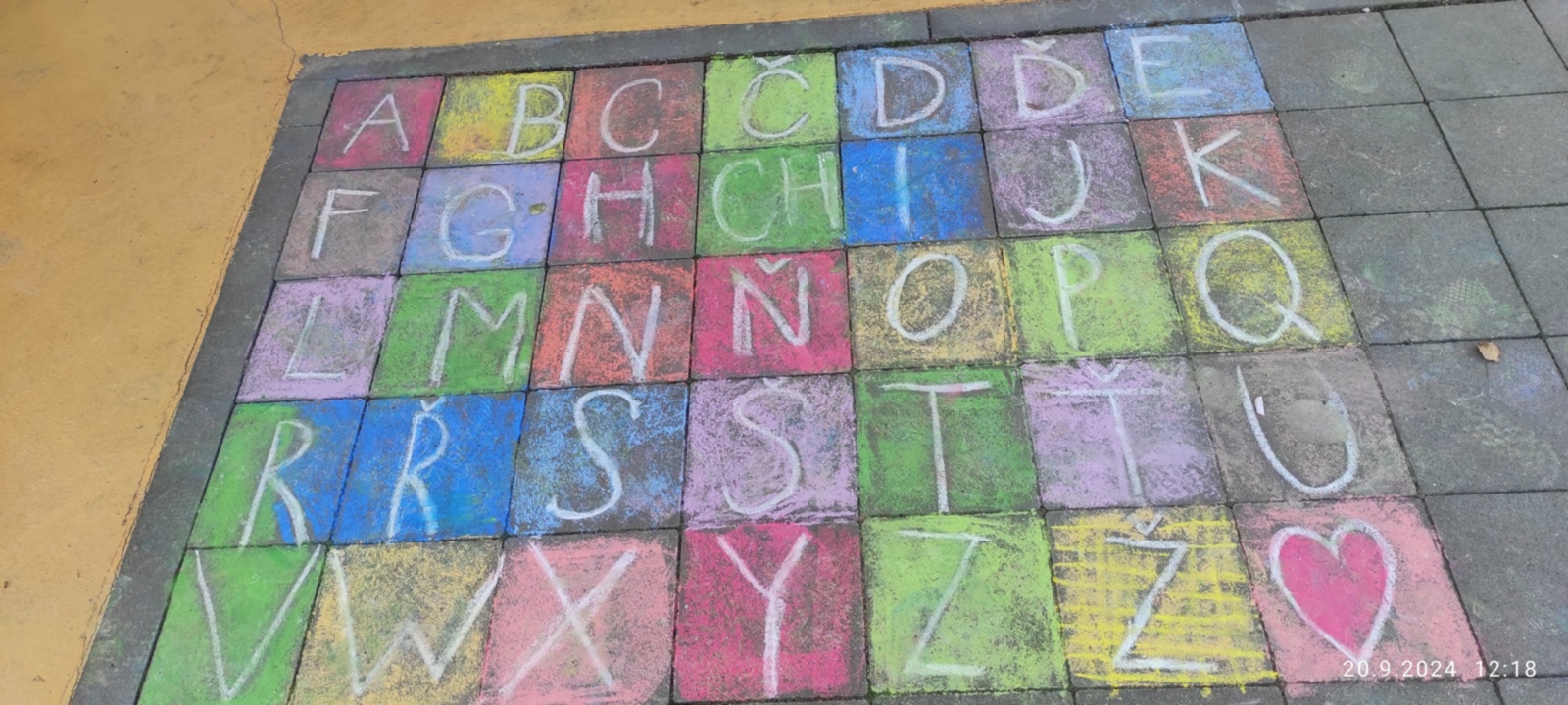 A protože je krásně, vytvořili jsme si venku duhovou abecedu na chodníku. Že by to bylo zázračné učení? Na konci práce jsme totiž všichni abecedu vyjmenovali.
