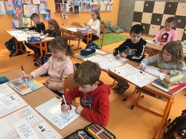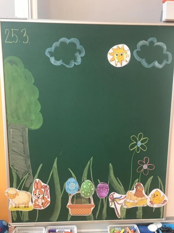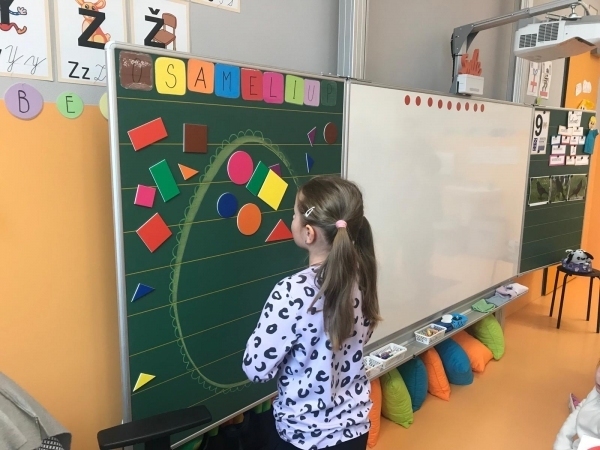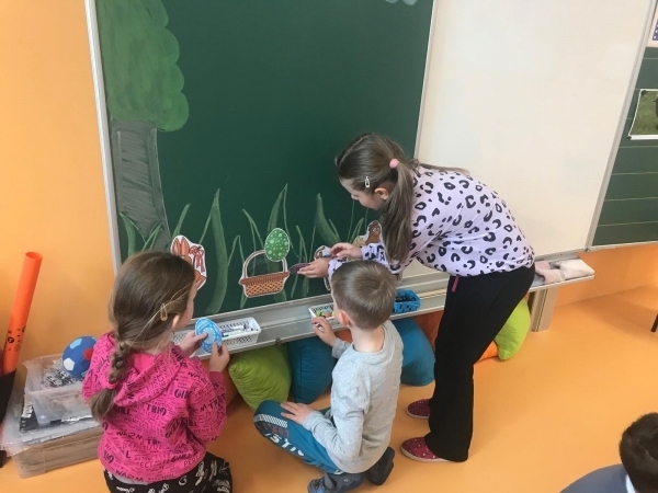 Zdobili velikonoční vajíčko geometrickými tvary a určovali je, prvňáci při tom tvary zapisovali na tabulku.
