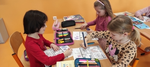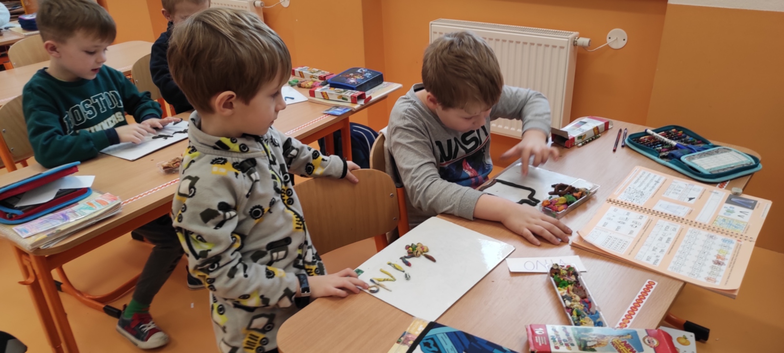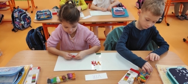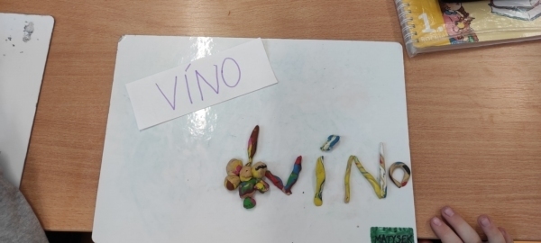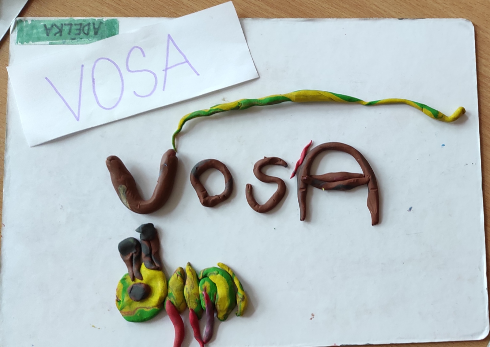 Každé písmeno se učíme prožitkem. Tak tomu bylo i u písmene V. Nejprve příběh, vymýšlení slov na V, pracovní list a naše tradiční slabičná stavba slova, vyhledávání písmene V v textu, skládání puzzle... Čtení slov a vět, krátkých příběhů a opis. A nesmí chybět modelování. Děti ve dvojicích dostaly slovo a úkol zněl: " Vymodeluj a napiš. " Dětská fantazie je úžasná! A spolupráce dětí také. A abychom písmeno V promítli i do jiných předmětů, vznikla ve výtvarné výchově zimní víla. A protože bez zpěvu to nejde, naučili jsme se hrát na perkusní tyče písničku Ovčáci, čtveráci a rytmickou hru se stupnicí C dur.