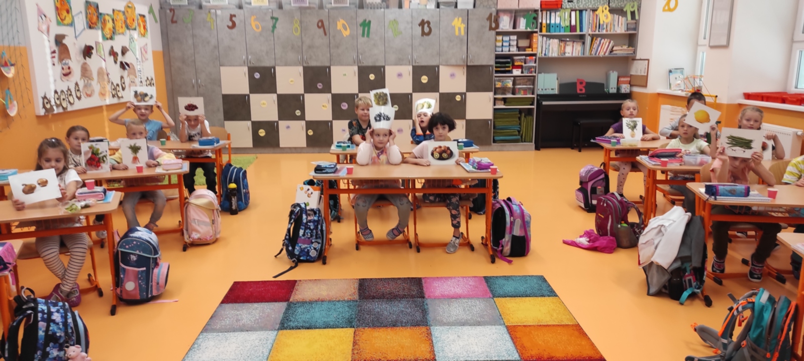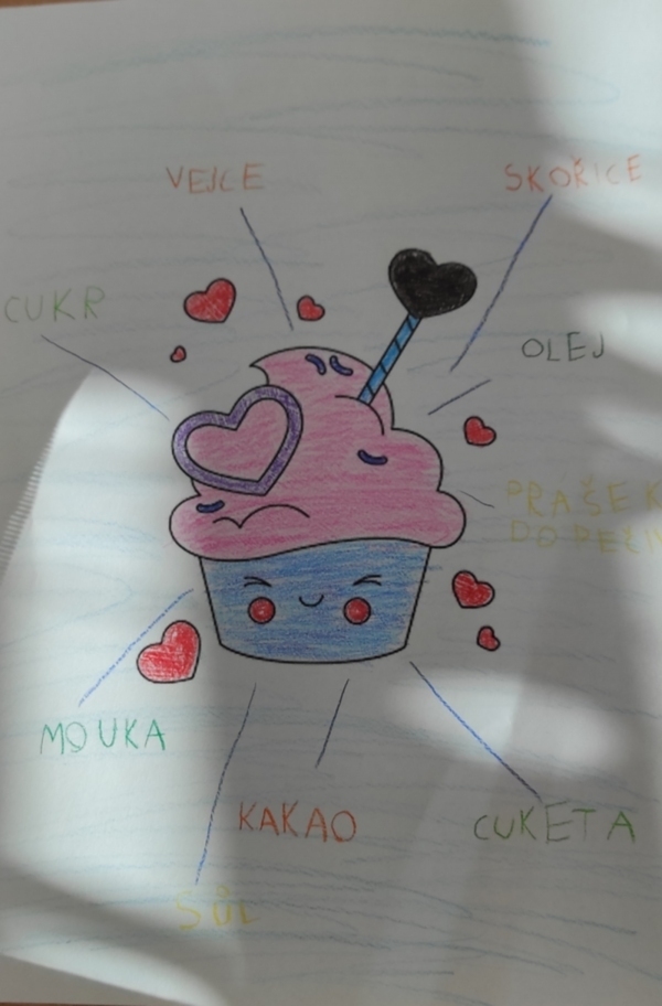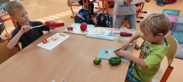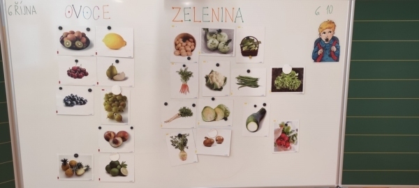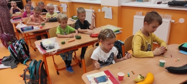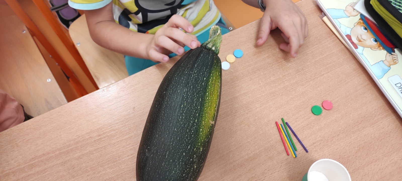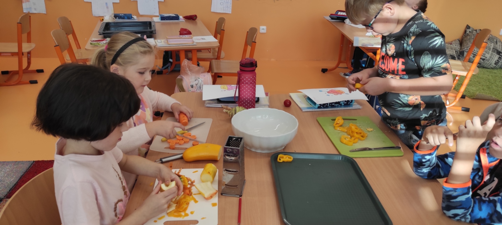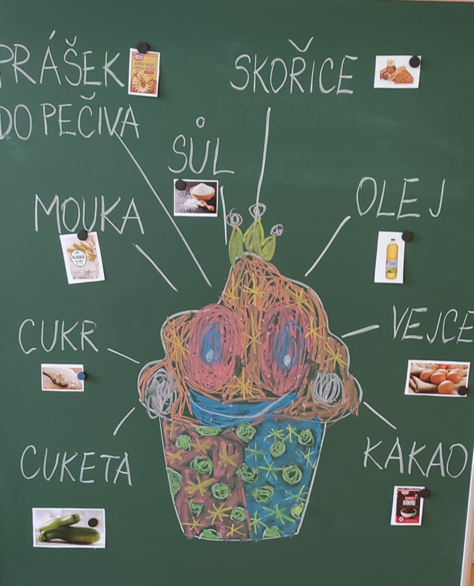 Už to všechno poznáme, pojmenujeme, víme, jak chutná zelenina a přišli jsme na to, že všechna je sladká. Kromě dýně, to jsme nedokázali určit, jakou má vlastně chuť. Takovou nijakou. :) Třídili jsem zeleninu s ovocem, hledali stejnou hlásku na začátku, spojovali slova podle rýmů, určovali jsme počet slabik a znázorňovali je. A protože jsme pilní, nechybělo pečení cuketových muffinů. Napsali jsme si jednoduchý recept a pak se pustili do práce. Dali jsme tam to a ono a ještě tohle a tamto...a zapomněli jsem tam dát to hlavní - cuketu. :) tak jsme ji tam ještě přidali a bylo. Co myslíte, chutnalo nám? No jasně. Mylo to mňam. V psaní jsme za zpěvu písně Šel zahradník kopali jámy, zasadili jsme s pohádkou "O veliké řepě" řepu, a v matematice jsme trénovali prostorovou orientaci. Kdo je první, poslední, před, za, nahoře, dole...V pracovních činnostech se nám moc povedly košíčky se zeleninou.