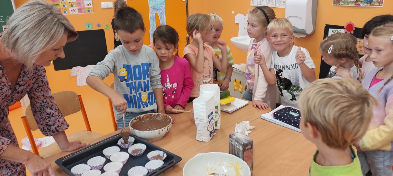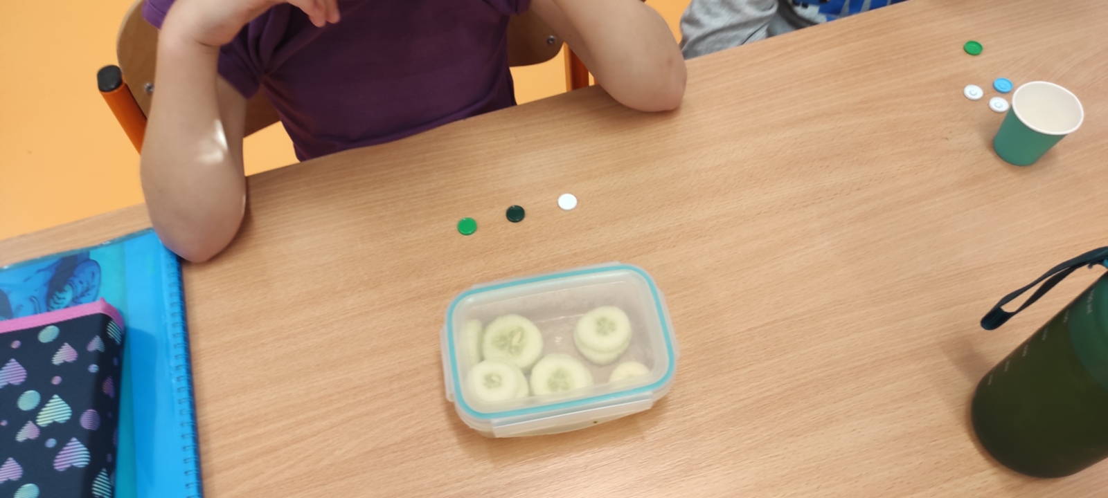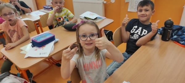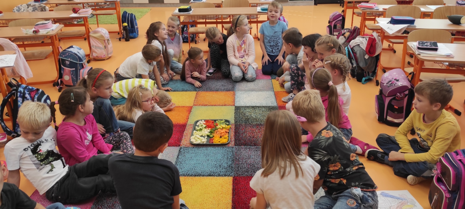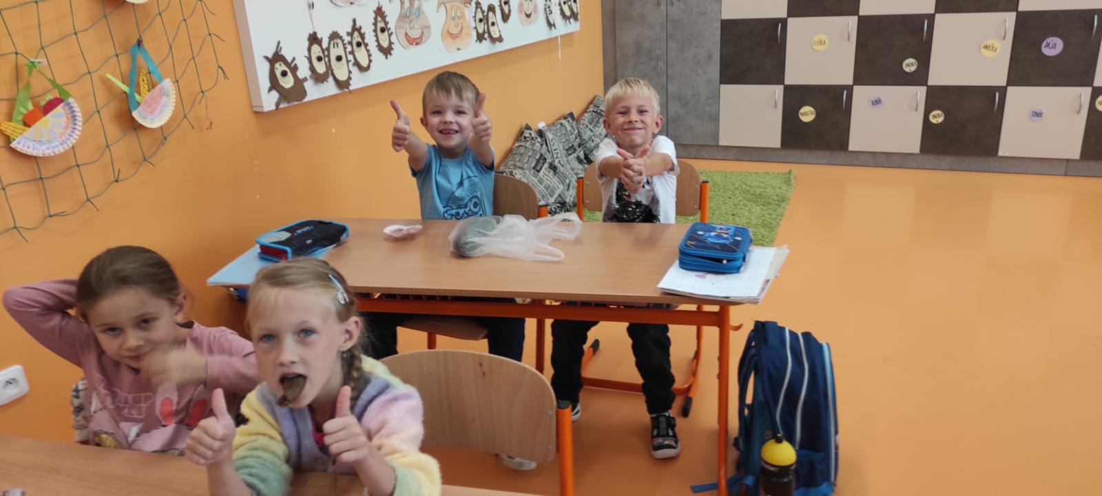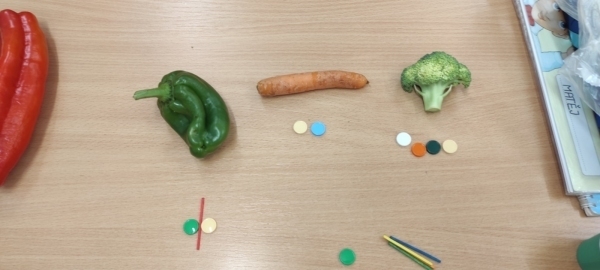 Už to všechno poznáme, pojmenujeme, víme, jak chutná zelenina a přišli jsme na to, že všechna je sladká. Kromě dýně, to jsme nedokázali určit, jakou má vlastně chuť. Takovou nijakou. :) Třídili jsem zeleninu s ovocem, hledali stejnou hlásku na začátku, spojovali slova podle rýmů, určovali jsme počet slabik a znázorňovali je. A protože jsme pilní, nechybělo pečení cuketových muffinů. Napsali jsme si jednoduchý recept a pak se pustili do práce. Dali jsme tam to a ono a ještě tohle a tamto...a zapomněli jsem tam dát to hlavní - cuketu. :) tak jsme ji tam ještě přidali a bylo. Co myslíte, chutnalo nám? No jasně. Mylo to mňam. V psaní jsme za zpěvu písně Šel zahradník kopali jámy, zasadili jsme s pohádkou "O veliké řepě" řepu, a v matematice jsme trénovali prostorovou orientaci. Kdo je první, poslední, před, za, nahoře, dole...V pracovních činnostech se nám moc povedly košíčky se zeleninou.