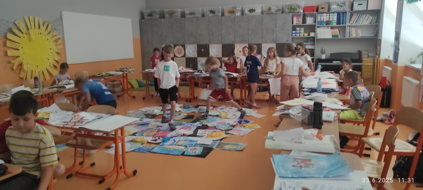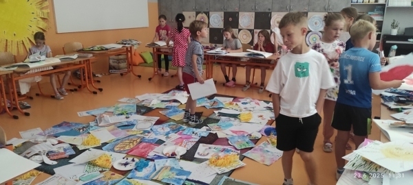 Ranní překvapení od dětí už je u nás tradicí. A tak se ráno hned zasmějeme a hurá do práce. Po hodině rychlé matematiky, kdy si děti samy vyvodily nádobky 5, jsme se vrhli na třídění výkresů. Kdyby si to tak všichni poctivě podepisovali, bylo by vše raz - dva. Ale...nepodepsali. Tak jsme hledali a hledali. Něco našli, něco ne. Pak jen uložit do vyrobených složek, které se dětem moc povedly. Mají hezkou vzpomínku na tvoření ve druhé třídě.