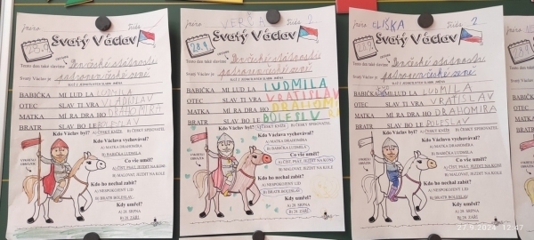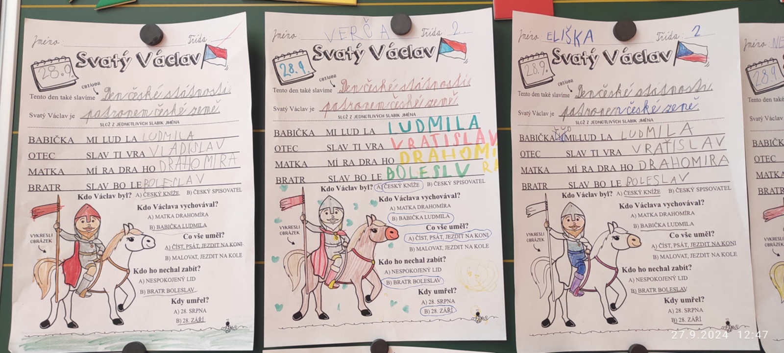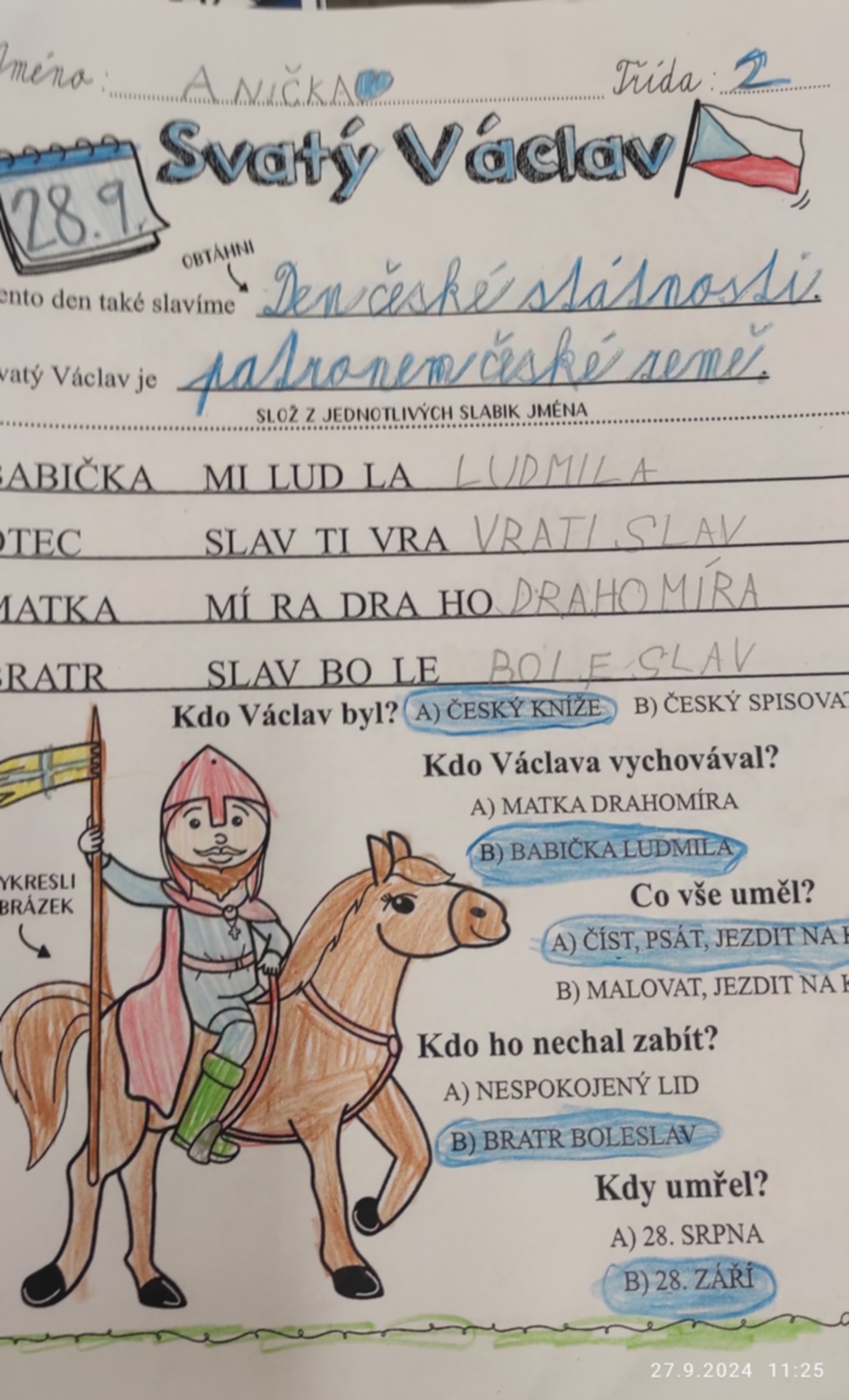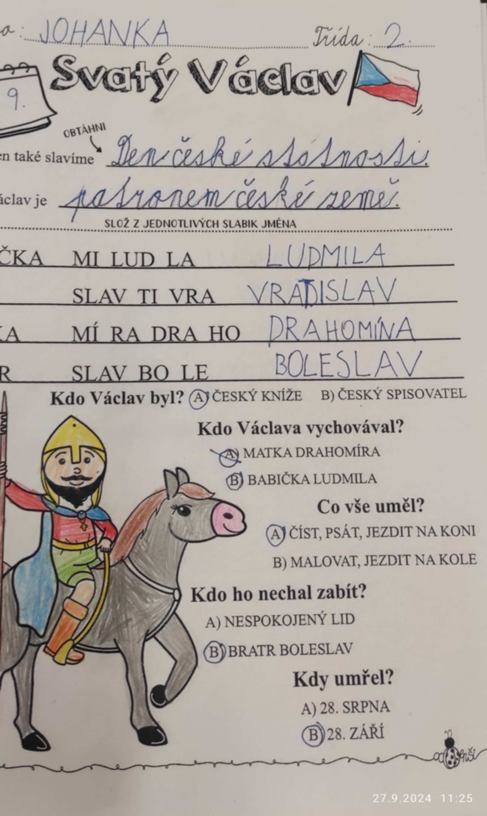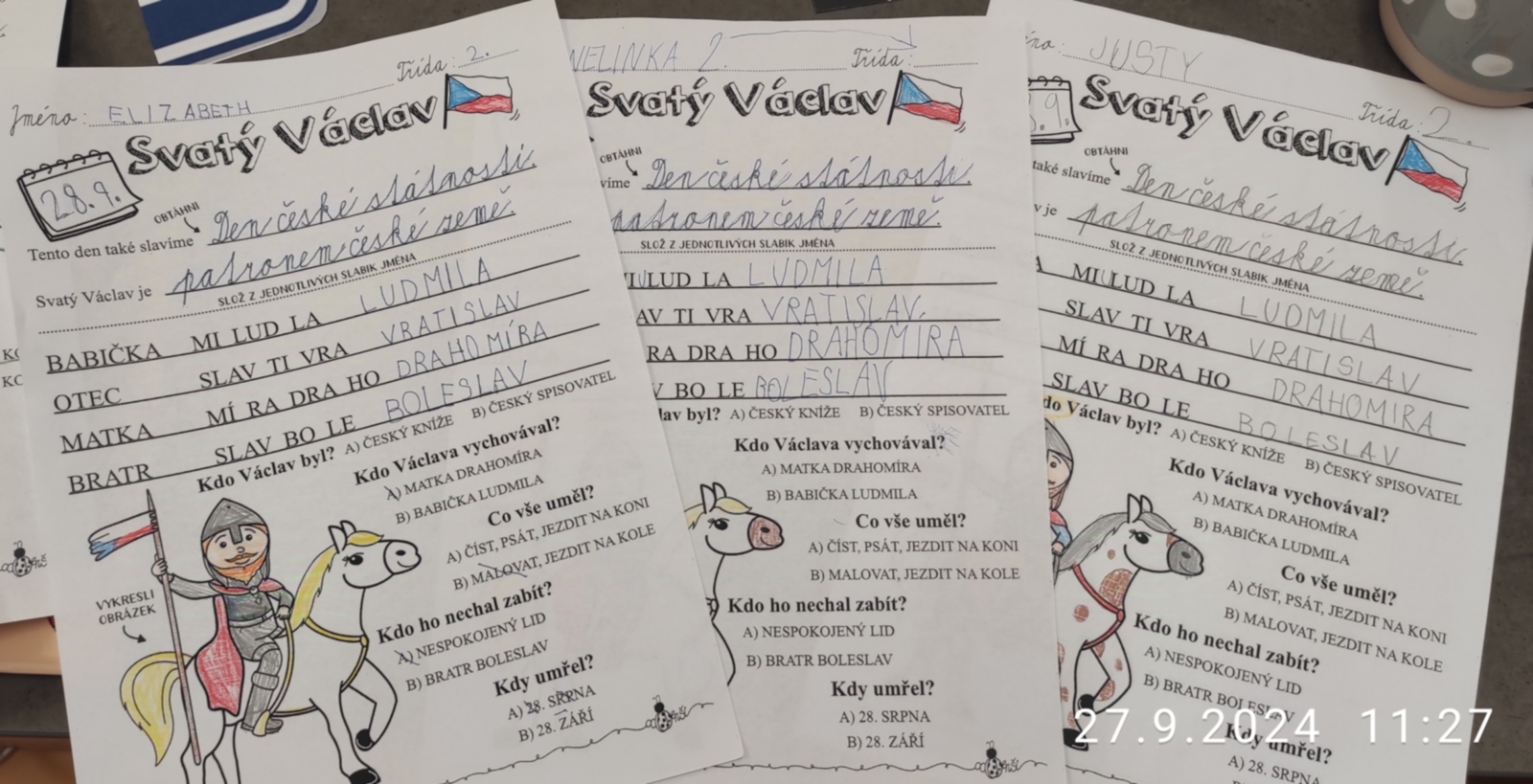 Abecedu pořád procvičujeme, i když jsme z ní dnes všichni dostali 1. Učíme se řadit slova podle abecedy a píšeme opis slov. Nechybí písanka a nové písmeno malé psací H, které si vždy zafixujeme pomocí plastelíny. A protože si povídáme i o významných dnech, dnes jsme se dozvěděli vše potřebné o Sv. Václavovi a Dni české státnosti. Příběh jsme si přečetli a shlédli. Následovalo opakování v PL. Vyrobit vitráž se Sv. Václavem už bylo za odměnu.