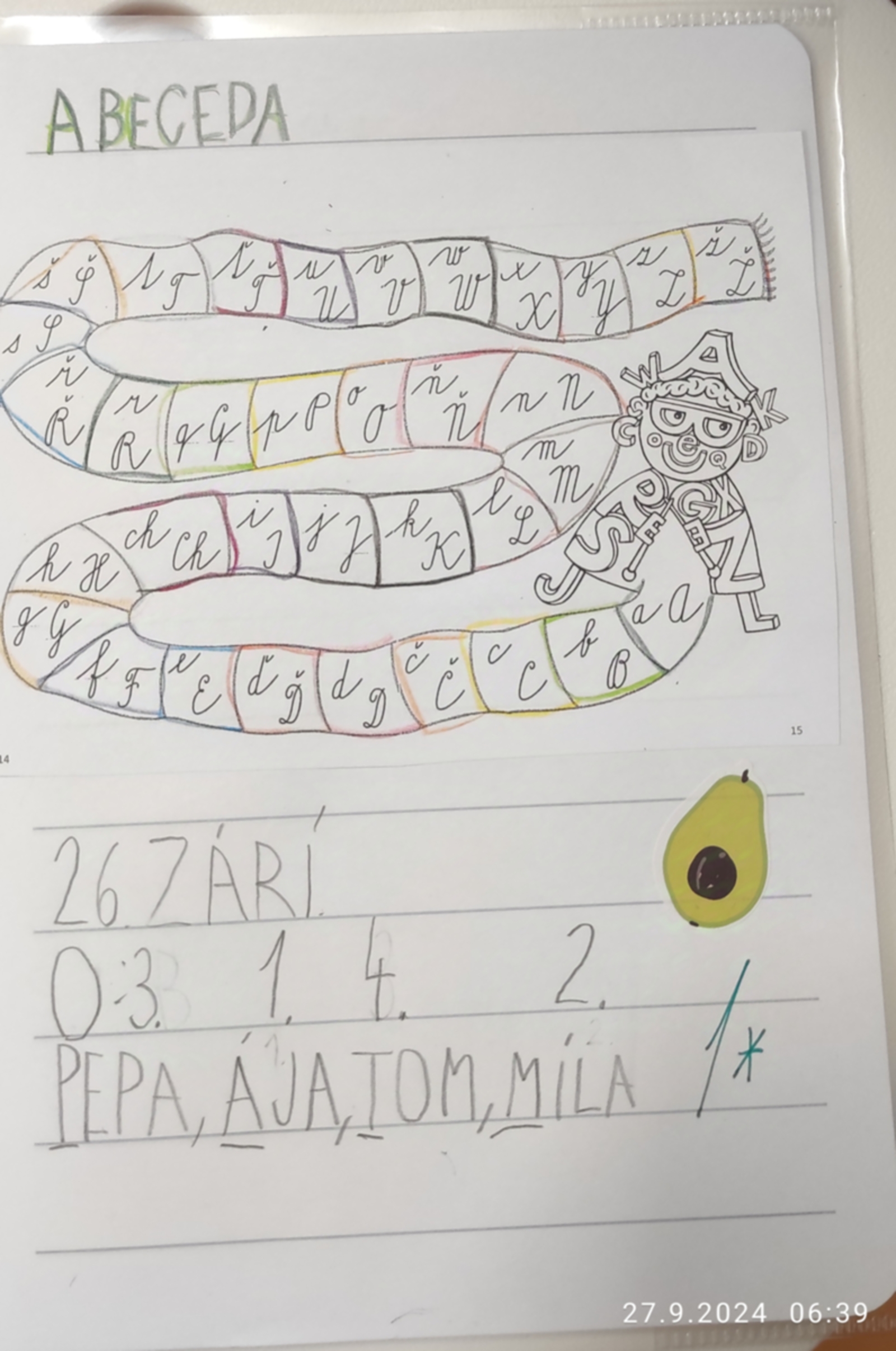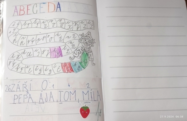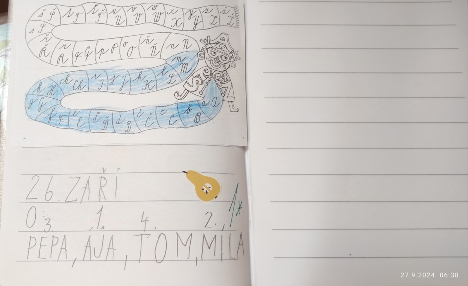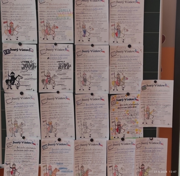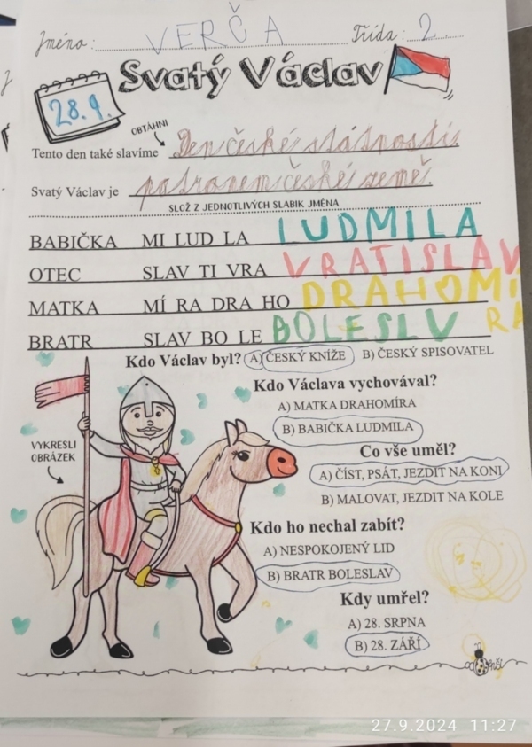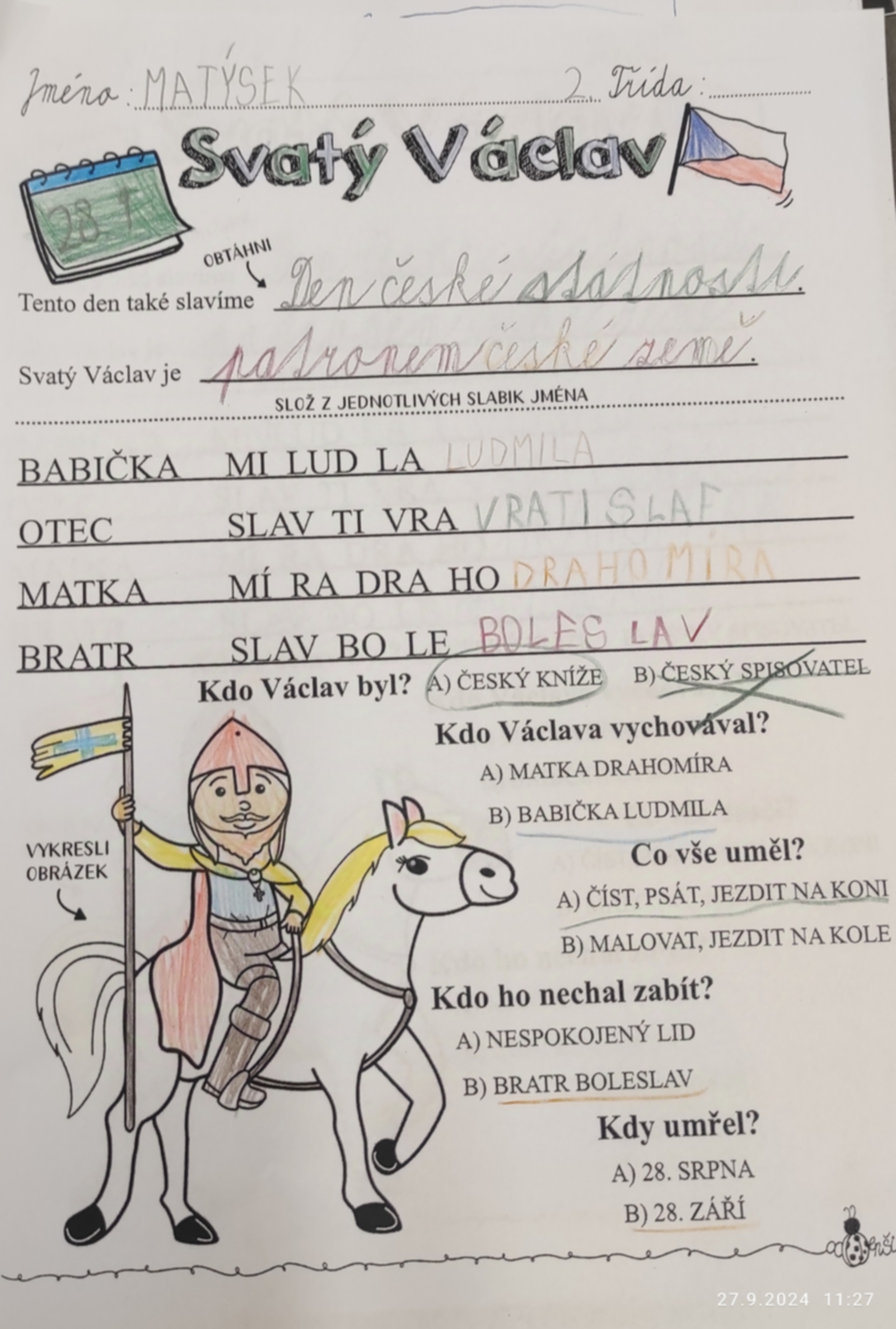 Abecedu pořád procvičujeme, i když jsme z ní dnes všichni dostali 1. Učíme se řadit slova podle abecedy a píšeme opis slov. Nechybí písanka a nové písmeno malé psací H, které si vždy zafixujeme pomocí plastelíny. A protože si povídáme i o významných dnech, dnes jsme se dozvěděli vše potřebné o Sv. Václavovi a Dni české státnosti. Příběh jsme si přečetli a shlédli. Následovalo opakování v PL. Vyrobit vitráž se Sv. Václavem už bylo za odměnu.