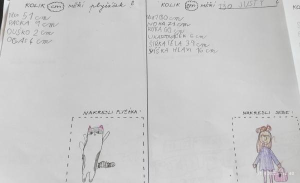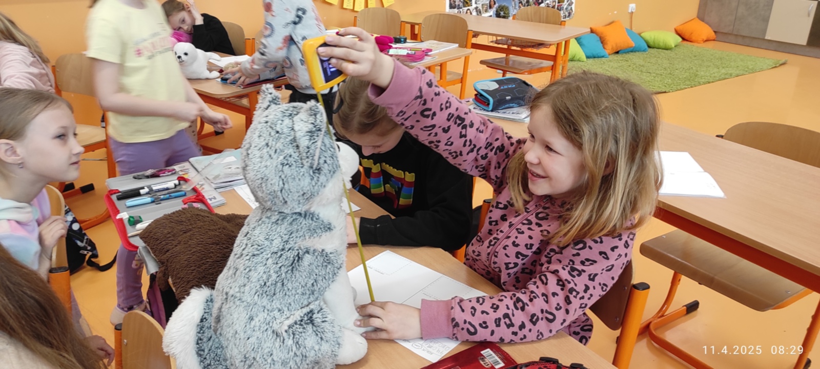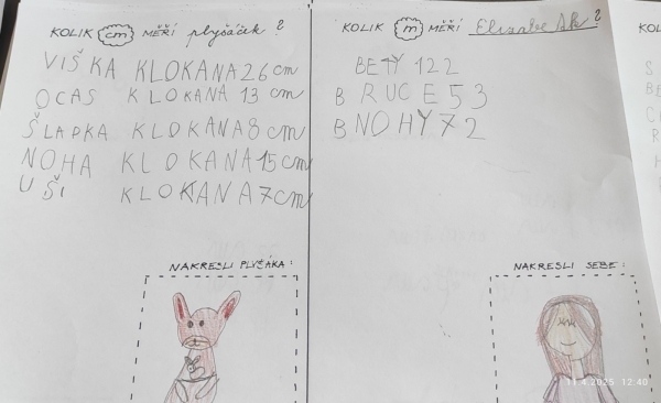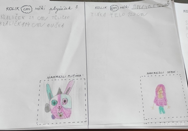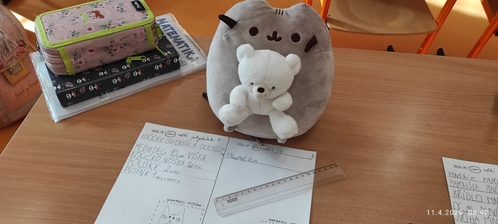 Geometrie se dá dělat všelijak. Dnes jsme si ji náramně užili s plyšáky a metrem. Nechybělo využití pravítek, zkoumavé otázky a legrace. Do PL jsme vše zaznamenávali a kreslili.