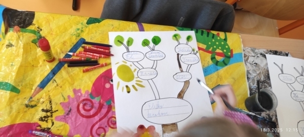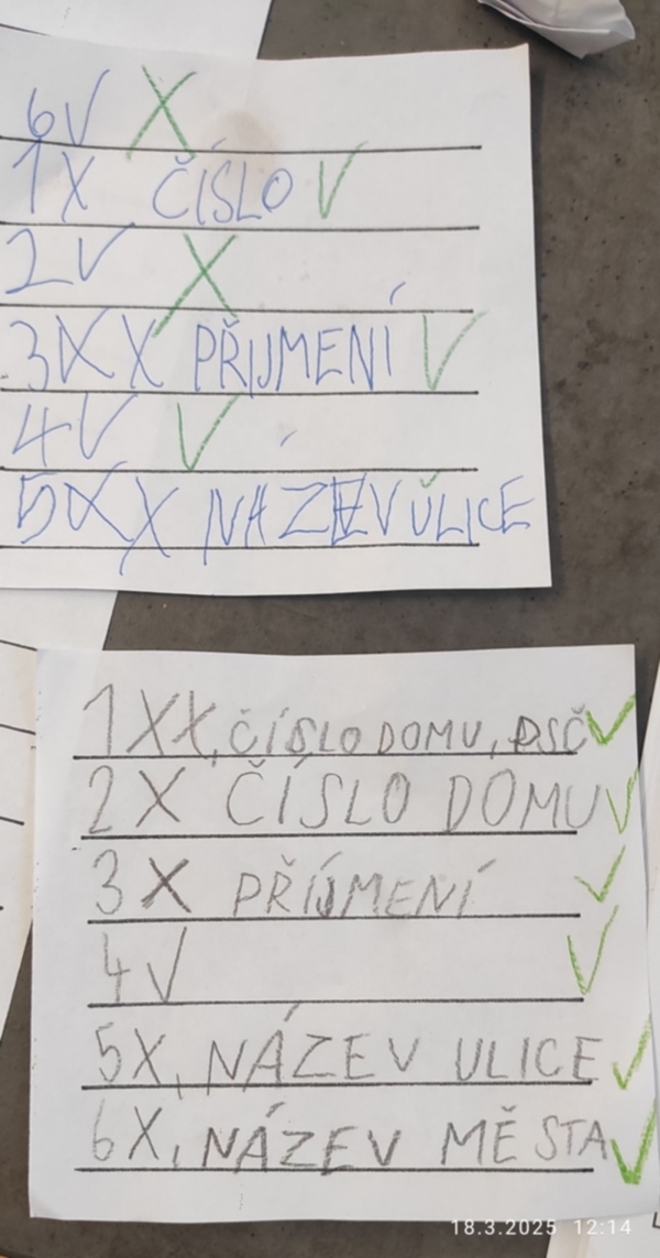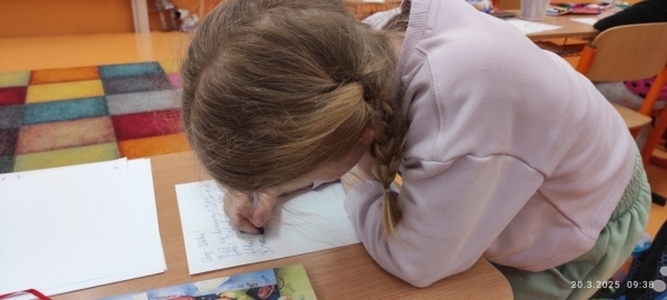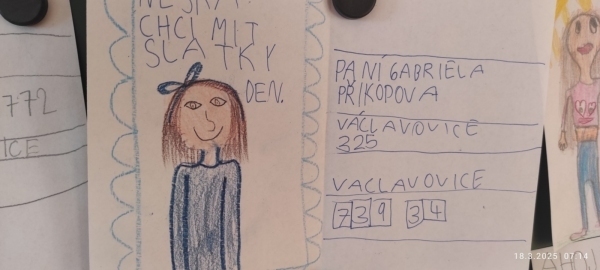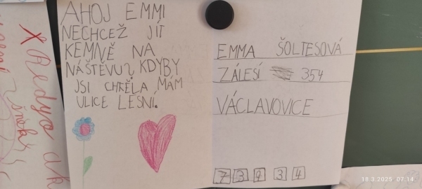 Učivo o psaní velkých písmen si užíváme. A docela nám to jde. I adresa je pro nás důležitá, tak ji zkoumáme, hledáme v ní, co chybí a trénujeme ji správně psát. Vytvořili jsme vlastní pohlednici a napsali dopis Sebíkovi, nakreslili obrázky, abychom mu udělali radost. To bude překvapení. Ve výtvarce jsme si zopakovali jména členů rodiny a vytvořili rokokmen.
