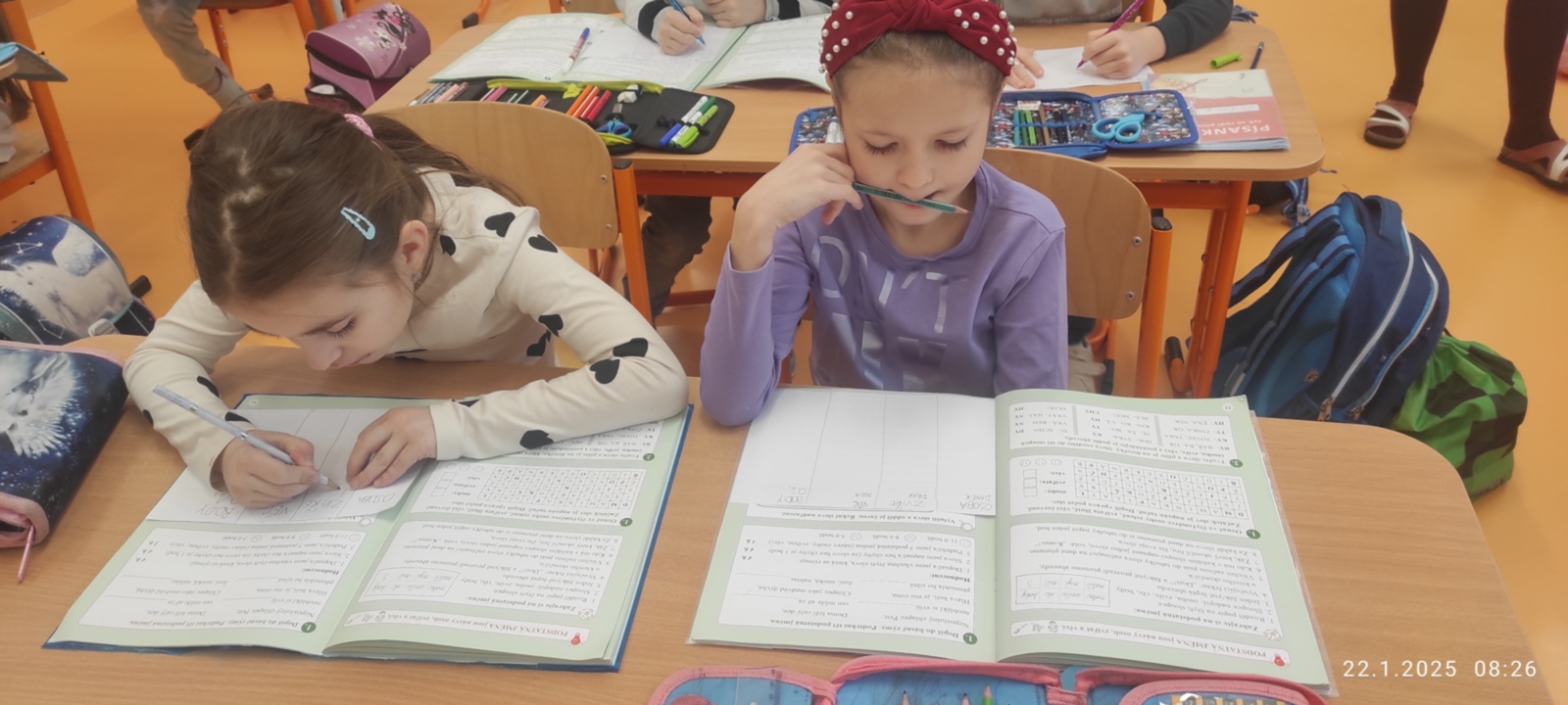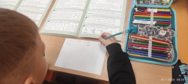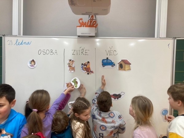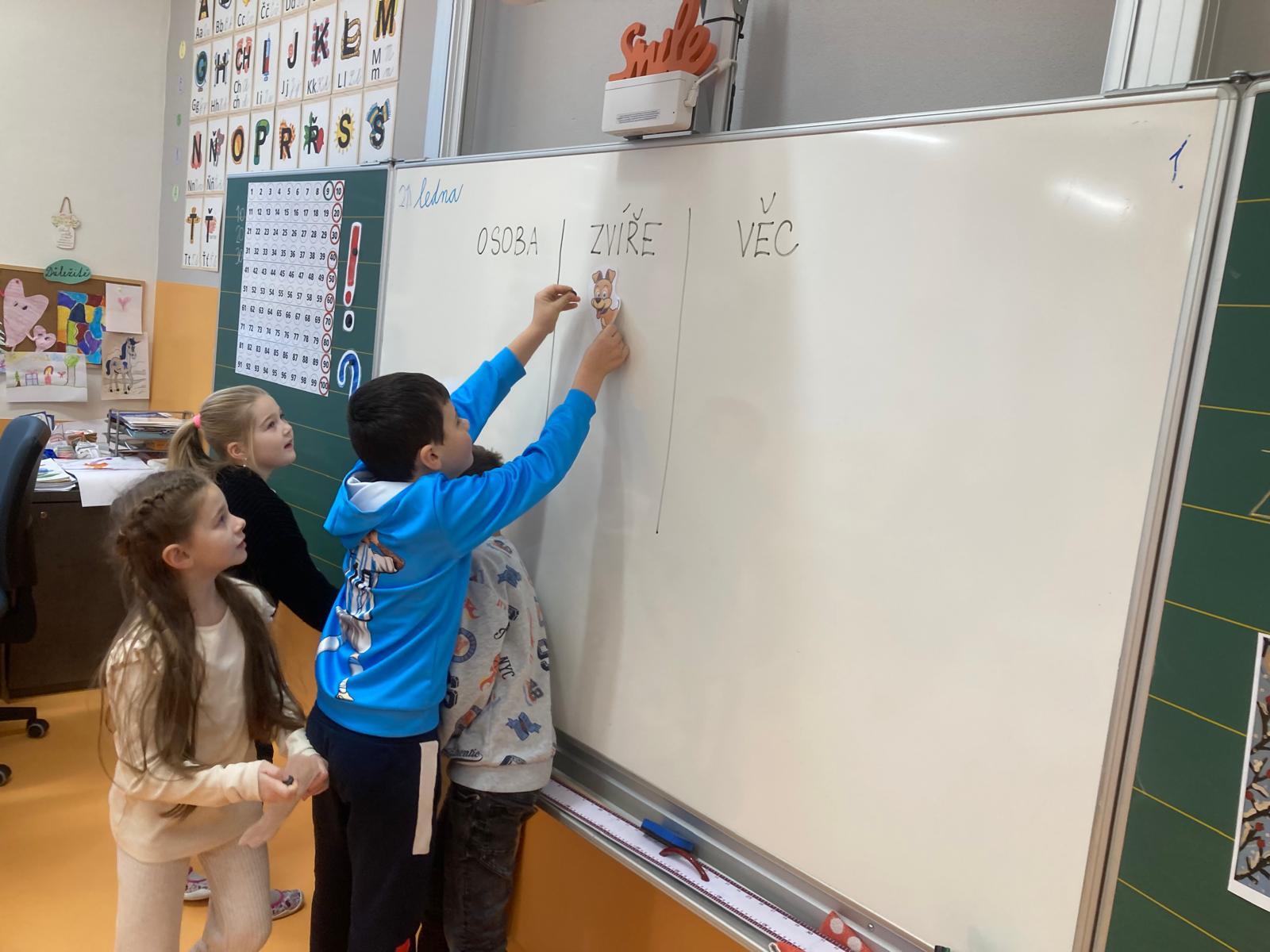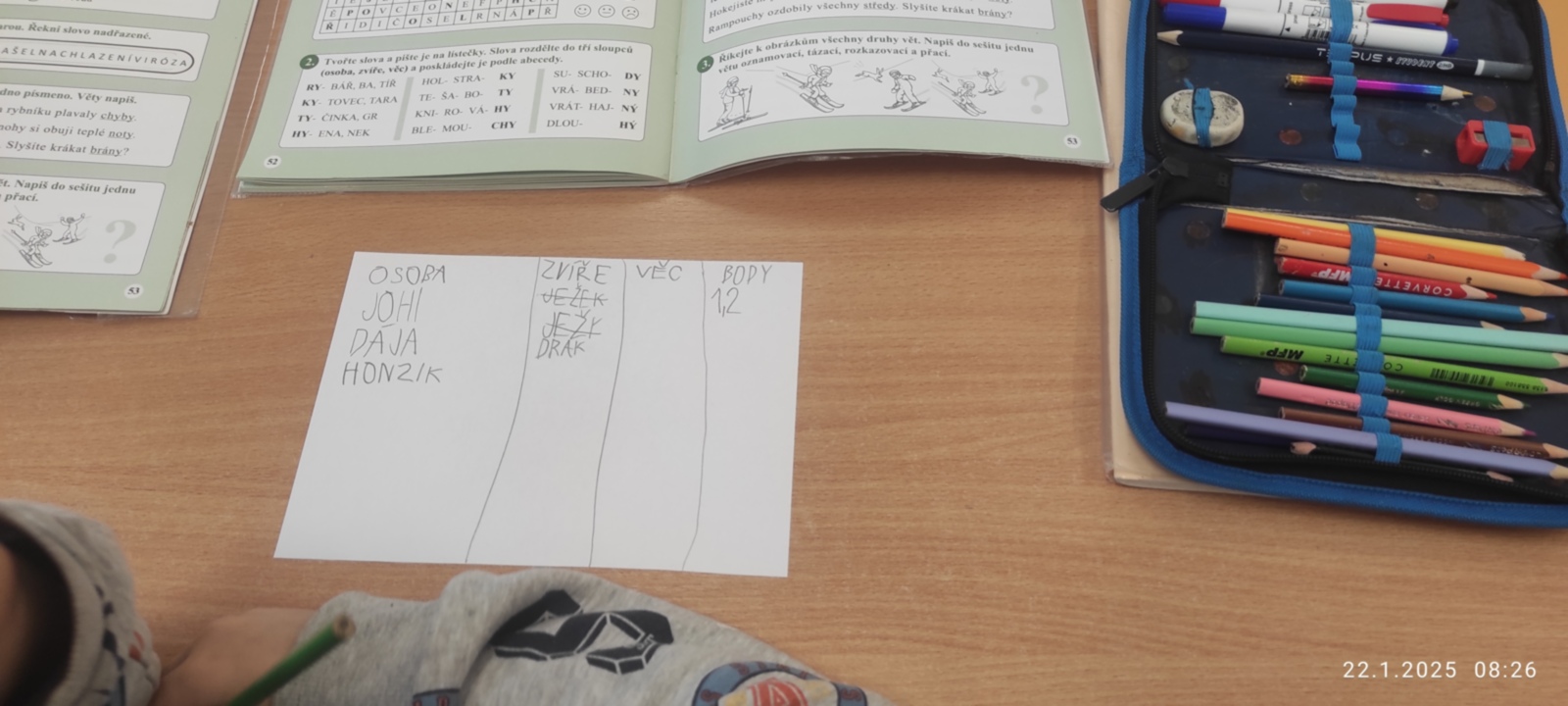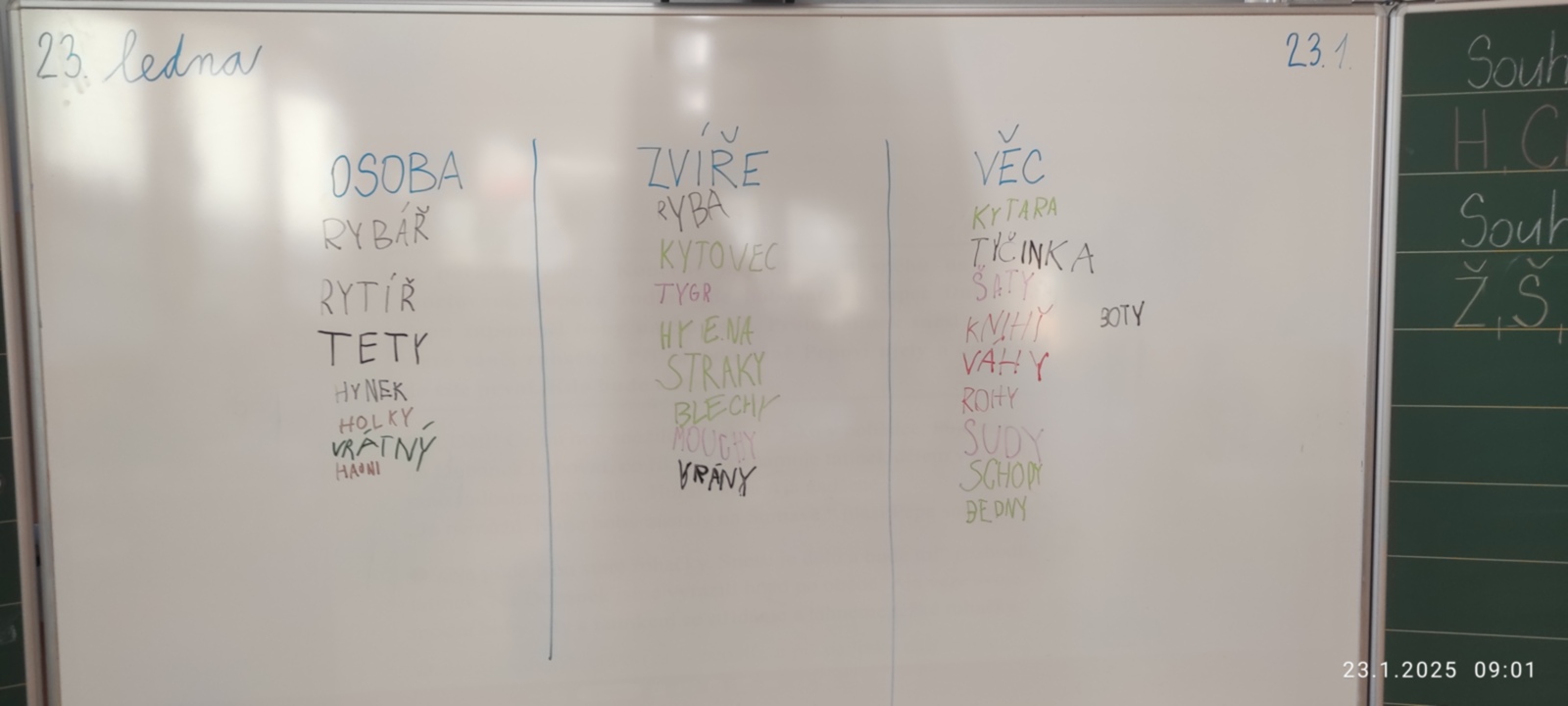 S pomocí obrázků jsme si v ČJ vyvodili učivo o podstatných jménech, roztřídili je a naučili se hru OSOBA, ZVÍŘE, VĚC. Podstatná jména jsme sestavovali ze slabik, hledali v nich tvrdé slabiky a kreslili je.