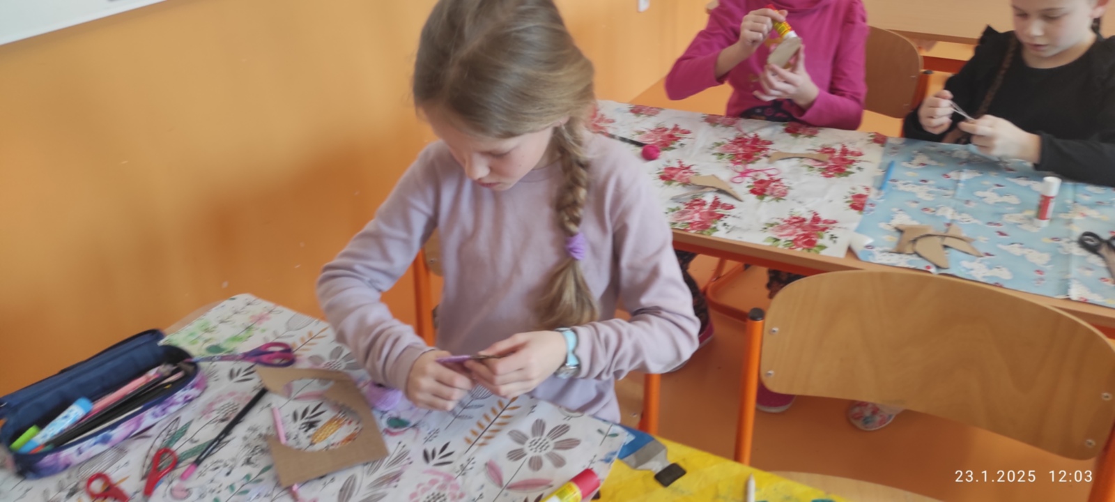Ve výtvarce jsme malovali kooperativní obraz s názvem Zvířátka v zimě a stihli jsme namalovat i každý své zvířátko.