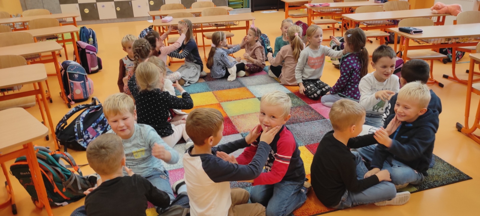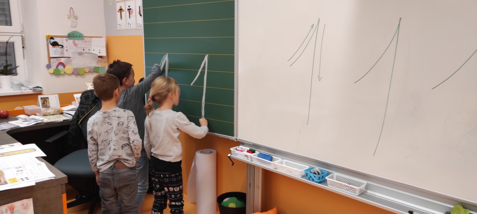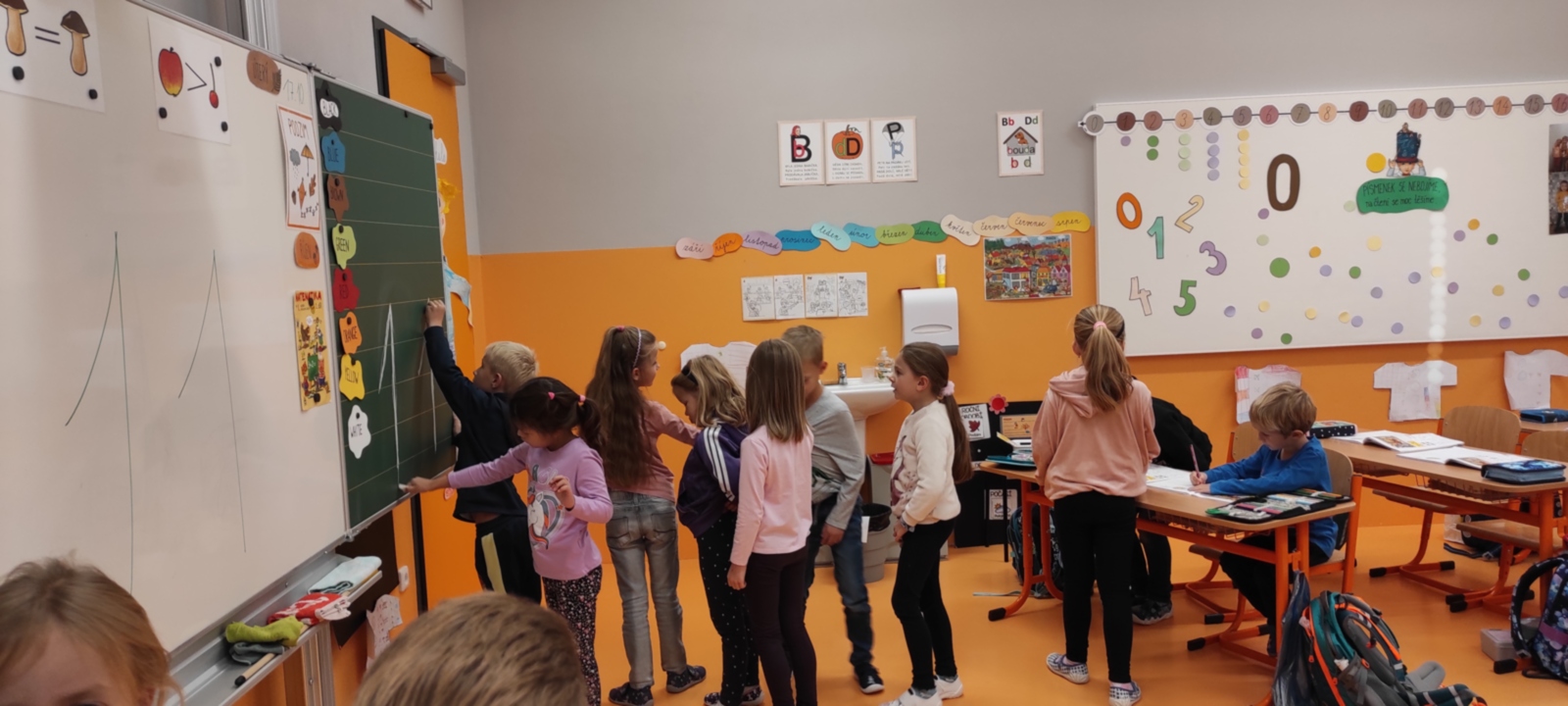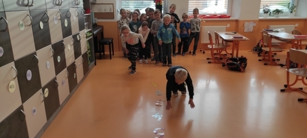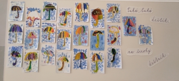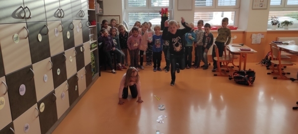 Pilní prvňáčci toho zvládají víc než dost. V hodinách českého jazyka už zvládli dvě písmenka a těší se na čtení. Určování počtu slabik a slabičnou stavbu už umí bez pomoci, a počáteční a konečná hláska je pro ně hračka. Pomocí "marťanštiny" si dáváme hádanky. Procvičujeme ruce a hrajeme hry. V matematice se pomalu dostáváme od pochopení množství, porovnávání počtu a prostorové orientace k číslicím a číselné ose. Jednička je teď všude. I v sešitech a na Bakalářích. A na číselné ose jsme si vyzkoušeli i skok do dálky. Ve výtvarné výchově jsme při tvoření deštníků počítali kapky. V hudební výchově jsme při zpěvu písní Prší prší a Travička zelená využili naše tělíčka k rytmizaci. Tleskání do rytmu do dlaní kamaráda, pohlazení po tvářích či ťukání prstíky na záda...to byla paráda!