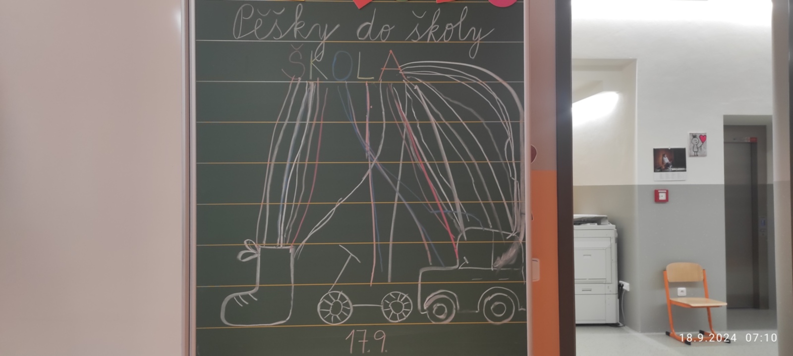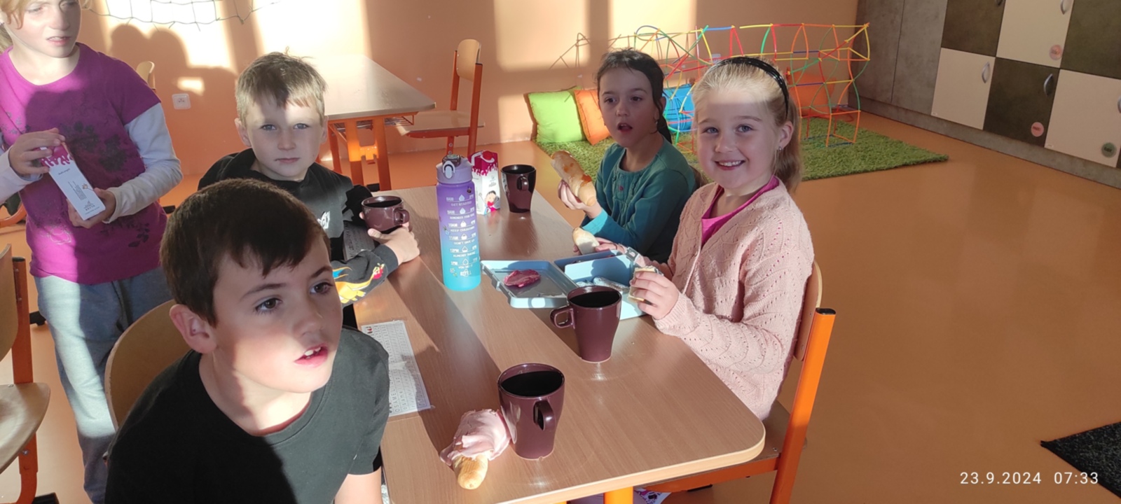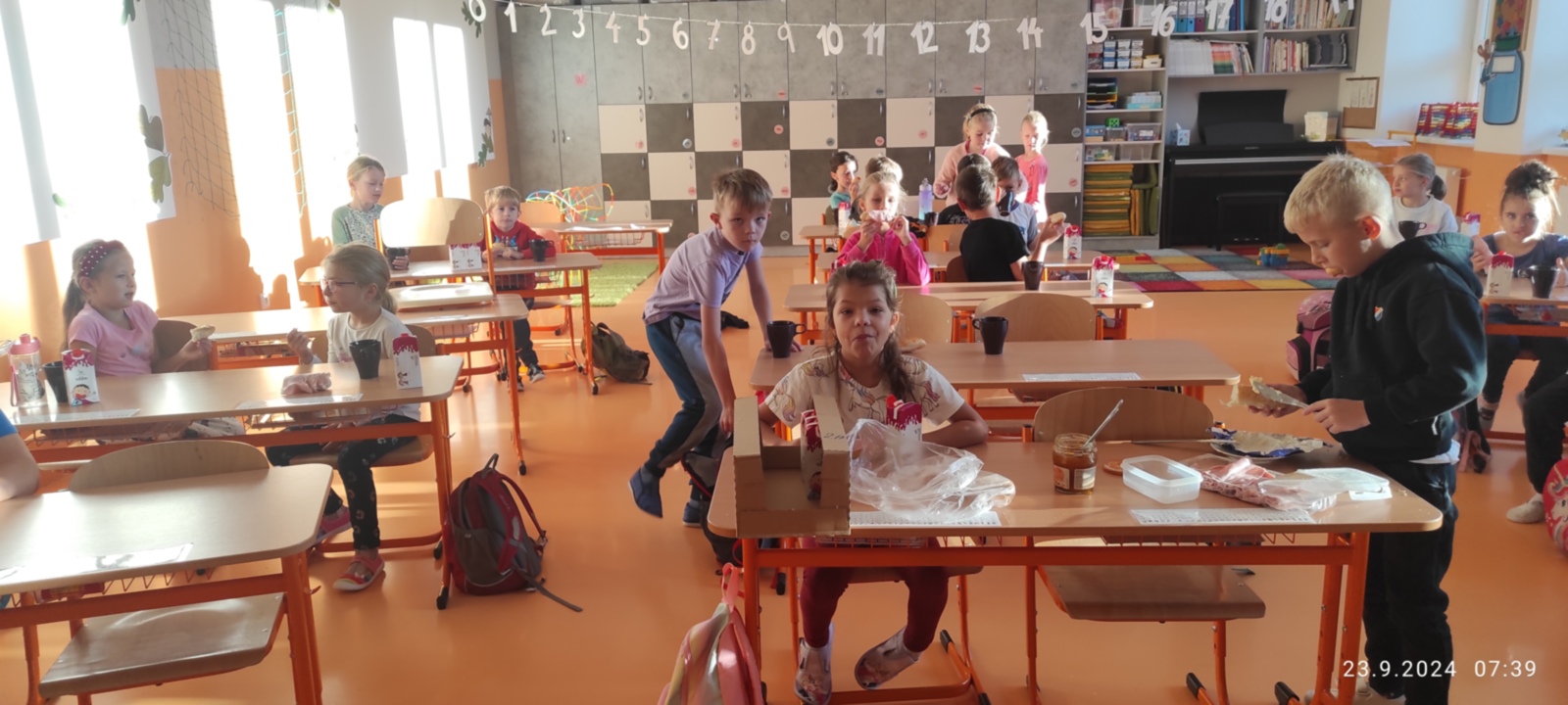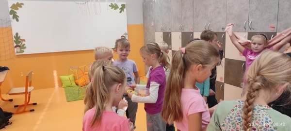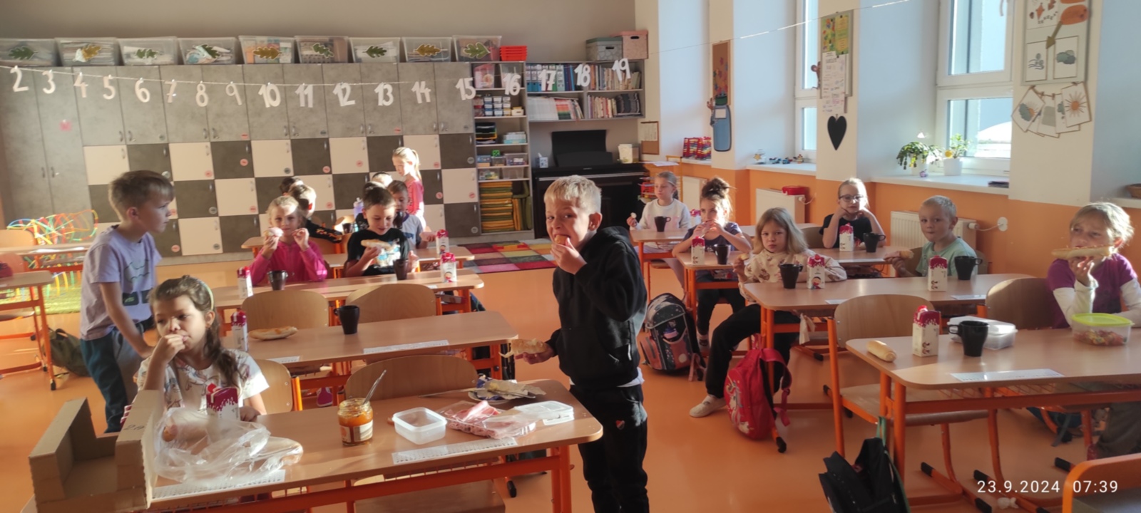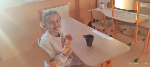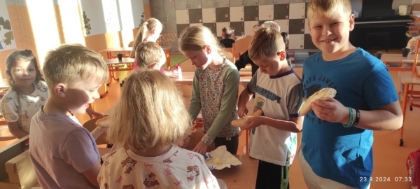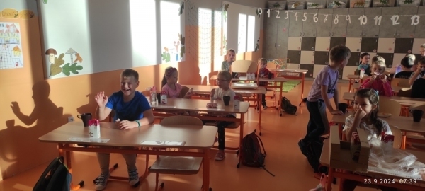 Tak jako loni, zkoumali jsme i letos, jak cestujeme do školy. Každý den děti zaznamenaly svou cestu na tabuli a v pondělí 23. 9. jsme si dali sraz na Zastávce Točna a šli alespoň jeden den do školy všichni pěšky. Ve škole jsme si sami připravili snídani a zapili čajem, který nám s velkou laskavostí připravila naše úžasná paní školnice. Moc děkujeme.