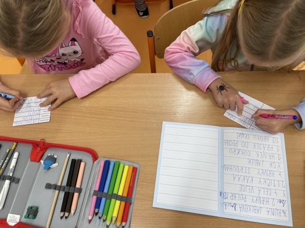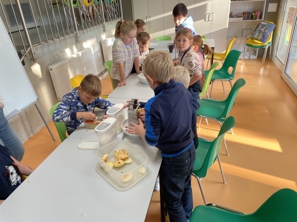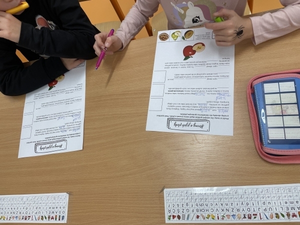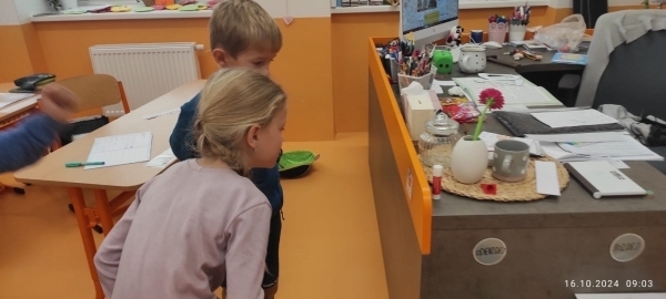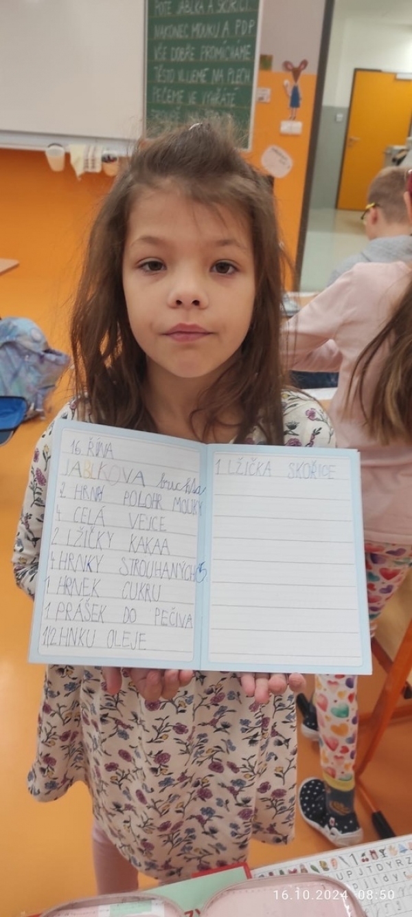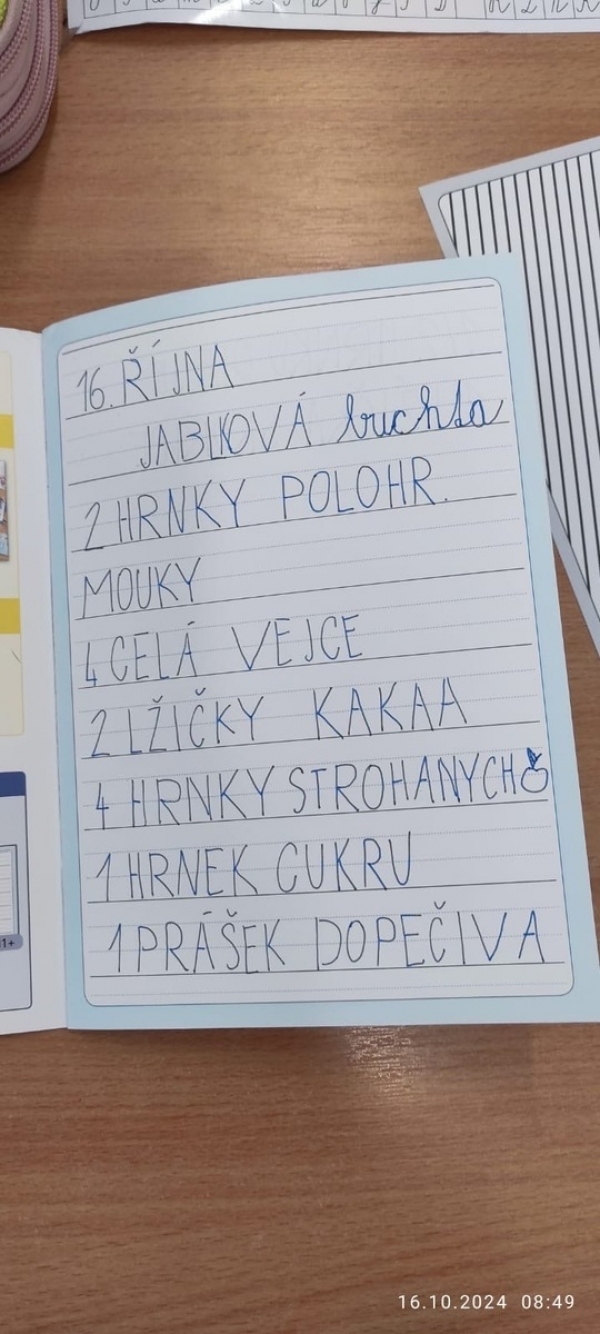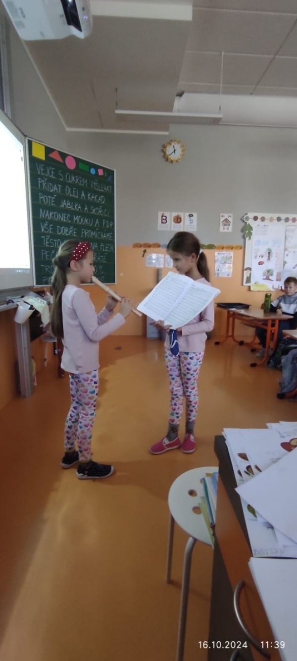 Středeční den začal v kuchyňce, kde jsme si vyzkoušeli, zda se nám podařilo vyluštit všechny suroviny na jablkovou buchtu. Čas, kdy byla buchta v troubě, jsme věnovali zapsání receptu do sešitů. Matematiku jsme zahájili běhacím diktátem, poté jsme si procvičili slovní úlohy se zvířátky. V prvouce jsme se zabývali ovocnými stromy a jejich plody. Novinkou pro nás byly mikroskopy, kde jsme pozorovali různé listy a zapisovali informace o nich. V poslední hodině jsme vytvořili třídní strom a konečně ochutnali naší buchtu. Den jsme zakončili flétničkovým koncertem.
