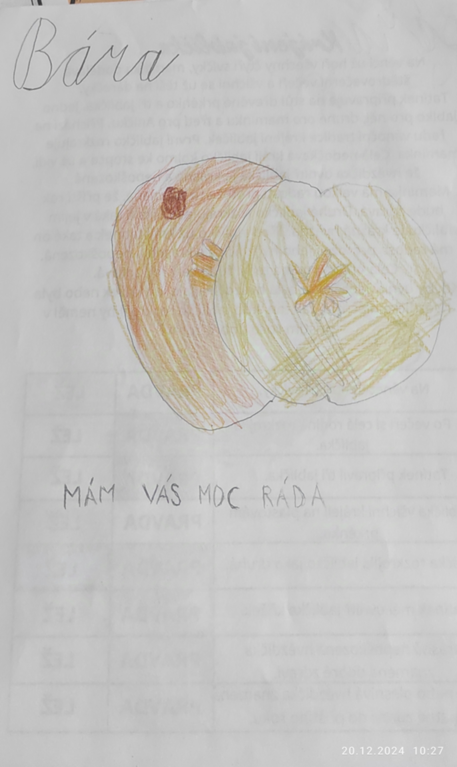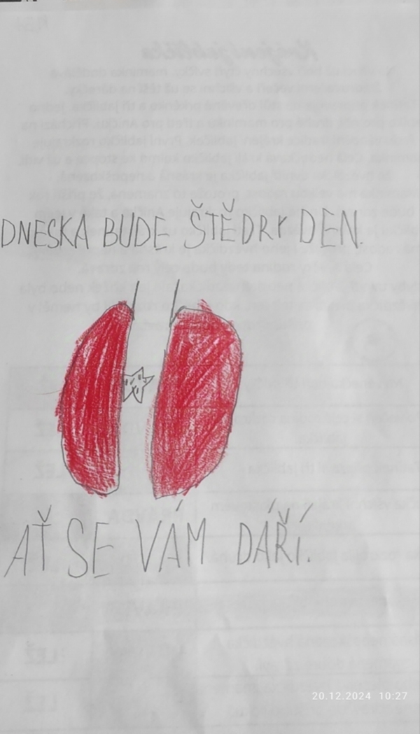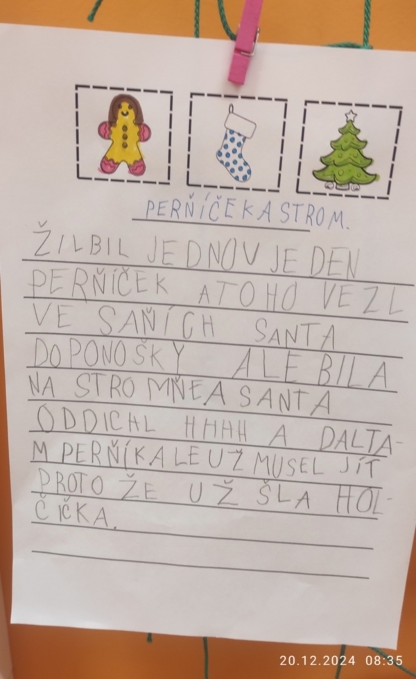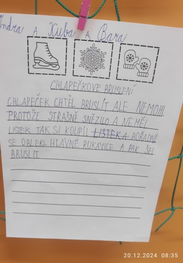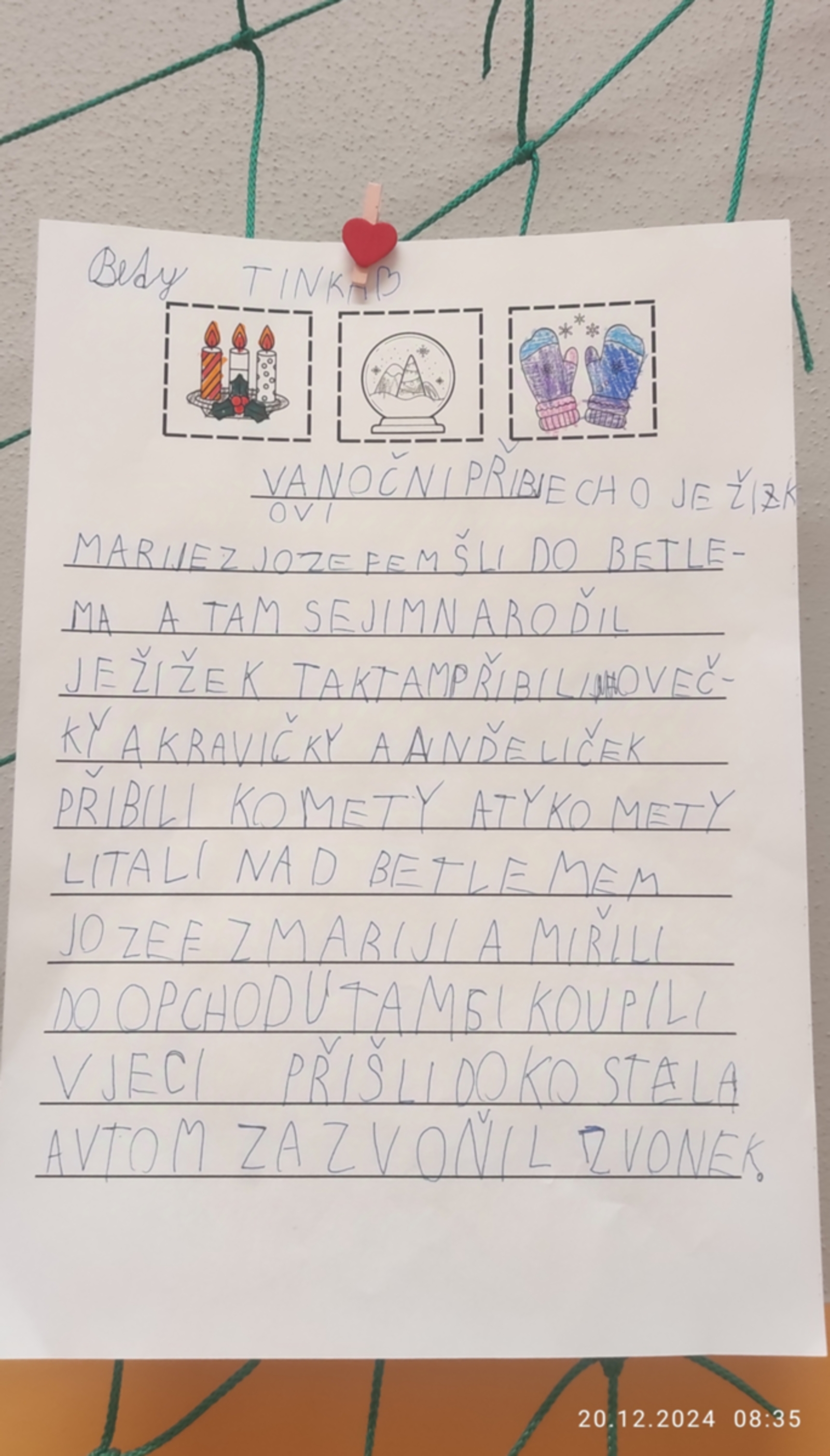 ...byla to zábava i legrace. Poskládat stromeček z čehokoli byla výzva. I baňky a řetěz se povedl. Obří Ježíšek nám dal trošku zabrat, chyběly nám dva dílky. No a tělocvik byl ideální, ve stylu" ukaž, co umíš". Ještě jsme stihli procvičování na PC a kousek pohádky. Napsat příběhy se symboly Vánoc a tvořit věty oznamovací i přací. Máme hotovo. Takže...