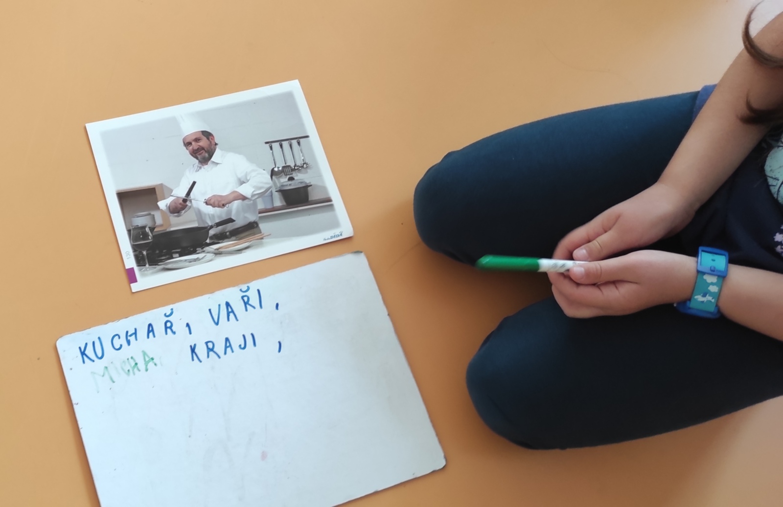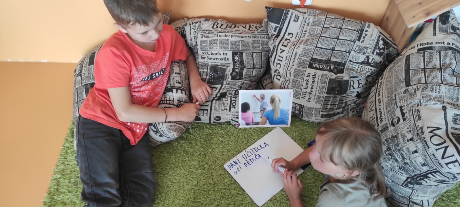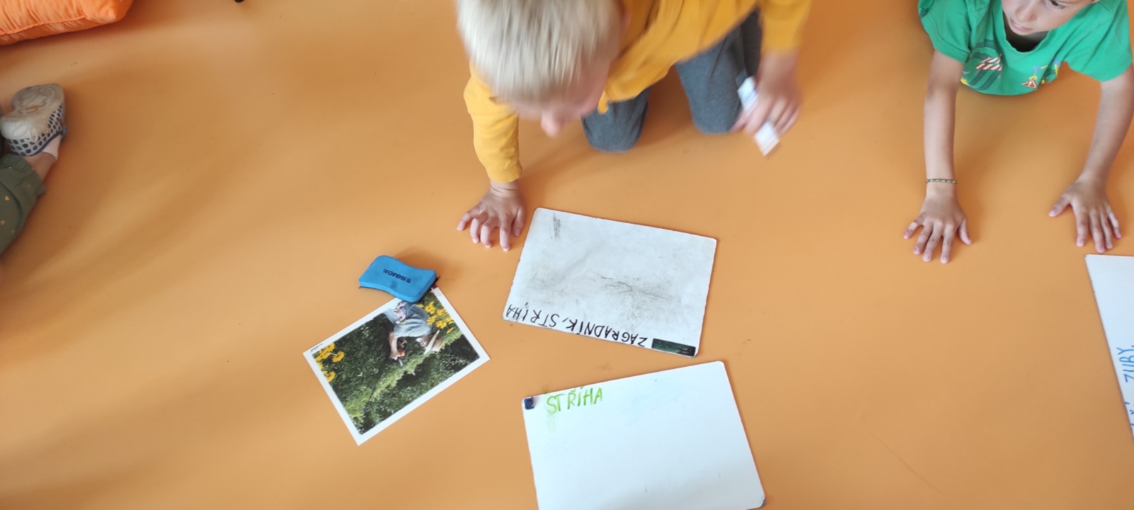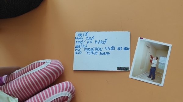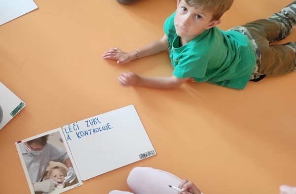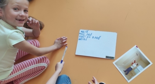 Dnes jsme si v tělocviku zahráli na AKROBATY, GYMNASTY a FOTBALISTY. Zkrátka na SPORTOVCE. V prvouce jsme téma povolání zopakovali tvořením sloves. Děti si ve dvojicích vylosovaly kartičku povolání, a pomocí otázky: " Co dělá...?" zapisovaly slovesa. Někteří i celé věty a krátké texty. Moc se jim práce povedly. Před obědem jsme venku kreslili, jak si představujeme radost.