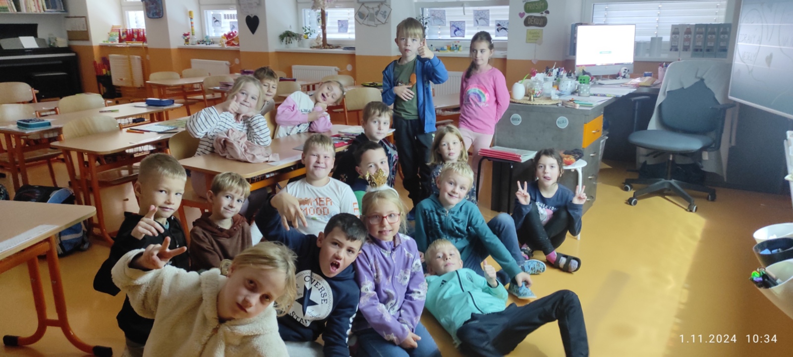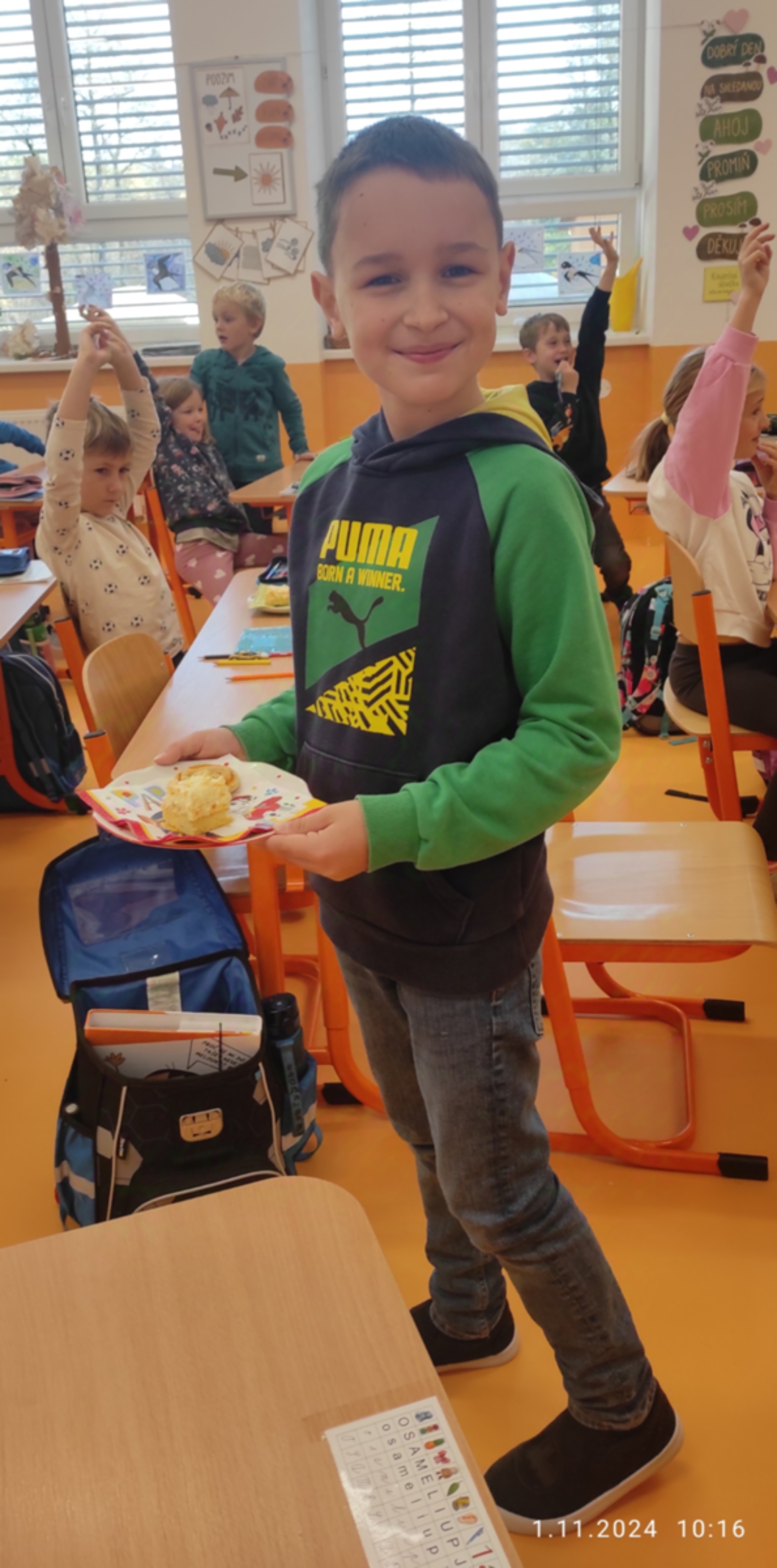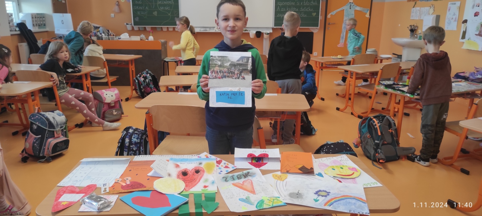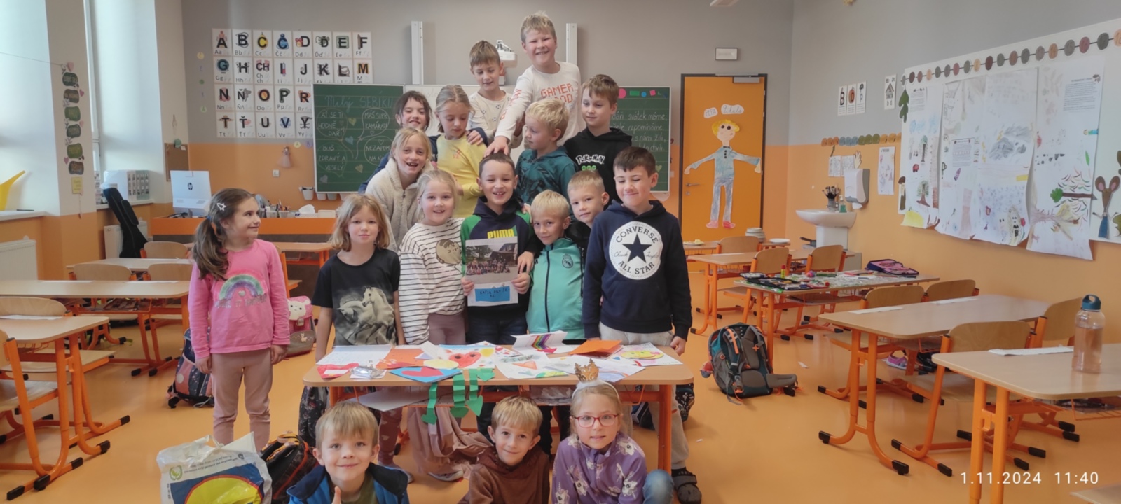 Dnes jsme prožili poslední den se spolužákem Sebíkem, který odchází na jinou školu. Sebík si pro nás připravil milé pohoštění i bonbonky. I my jsme mu připravili prima den. Zahrál si na pana učitele, pohostil děti a pak už jsme se jen loučili. Děti mu vyrobily dárečky od srdce a na památku jsme mu věnovali knihu Stříbrné dobrodružství s podpisy a fotografií a klíčenku se smajlíkem, aby byl stále veselý. Krátké video se zážitky ze školy se líbila nejen jemu, ale i všem dětem.
