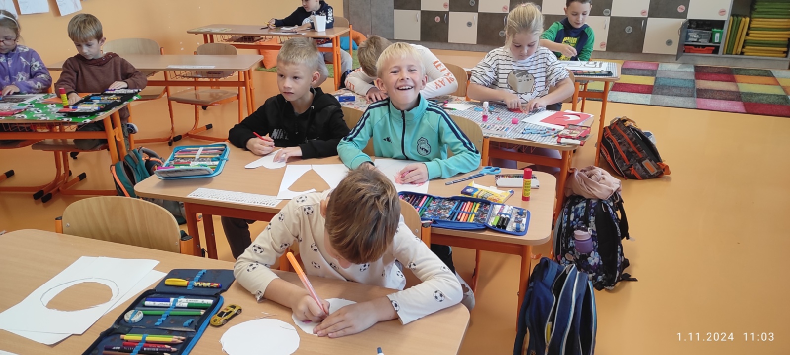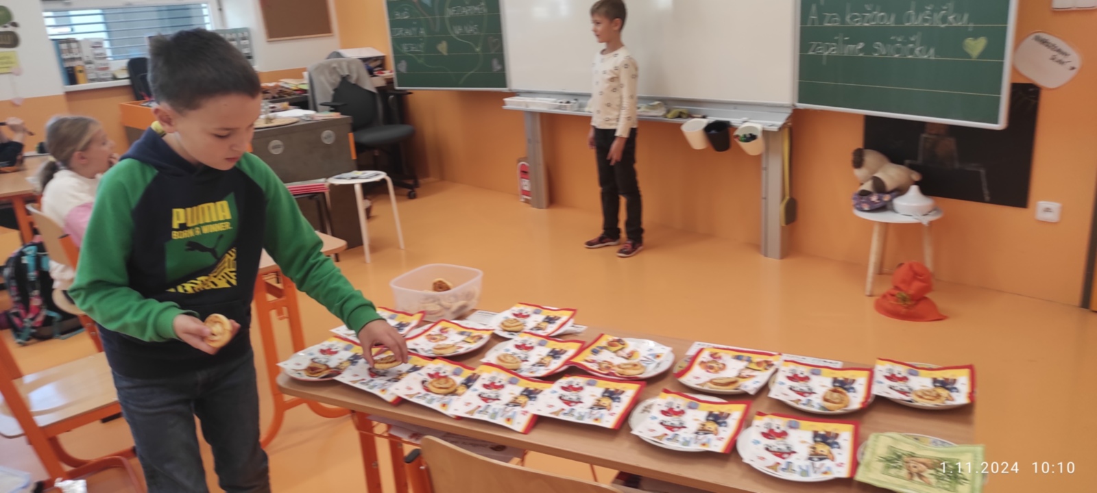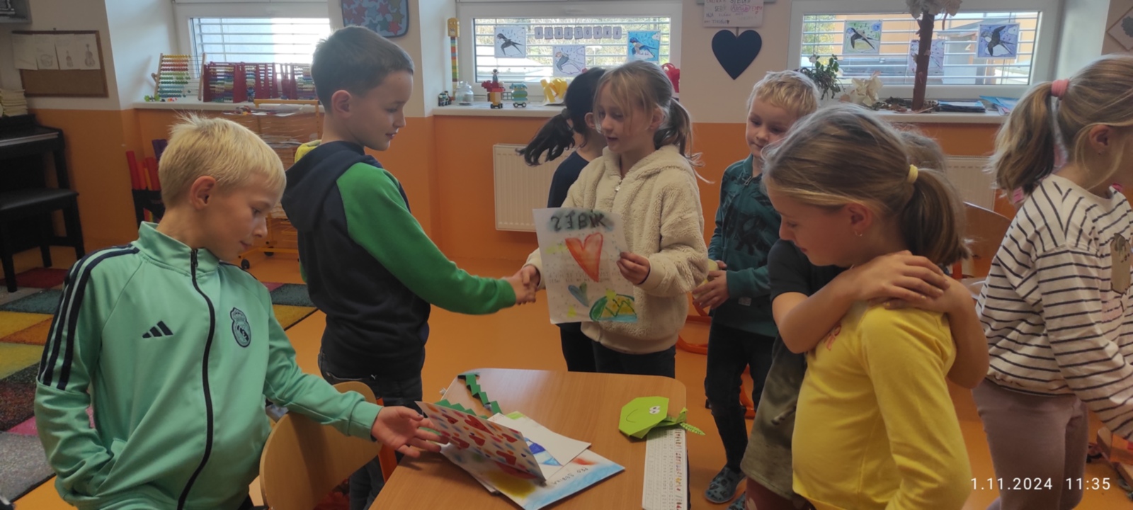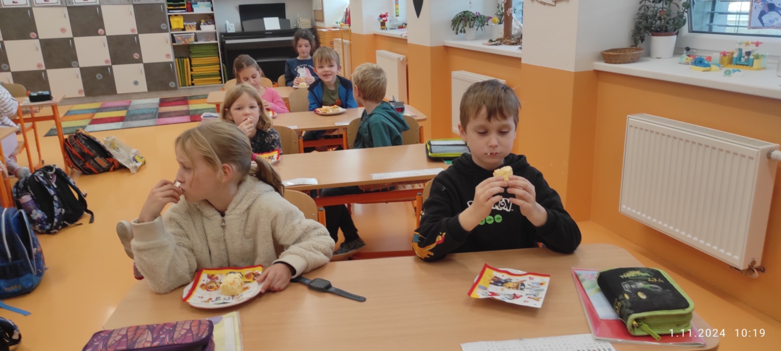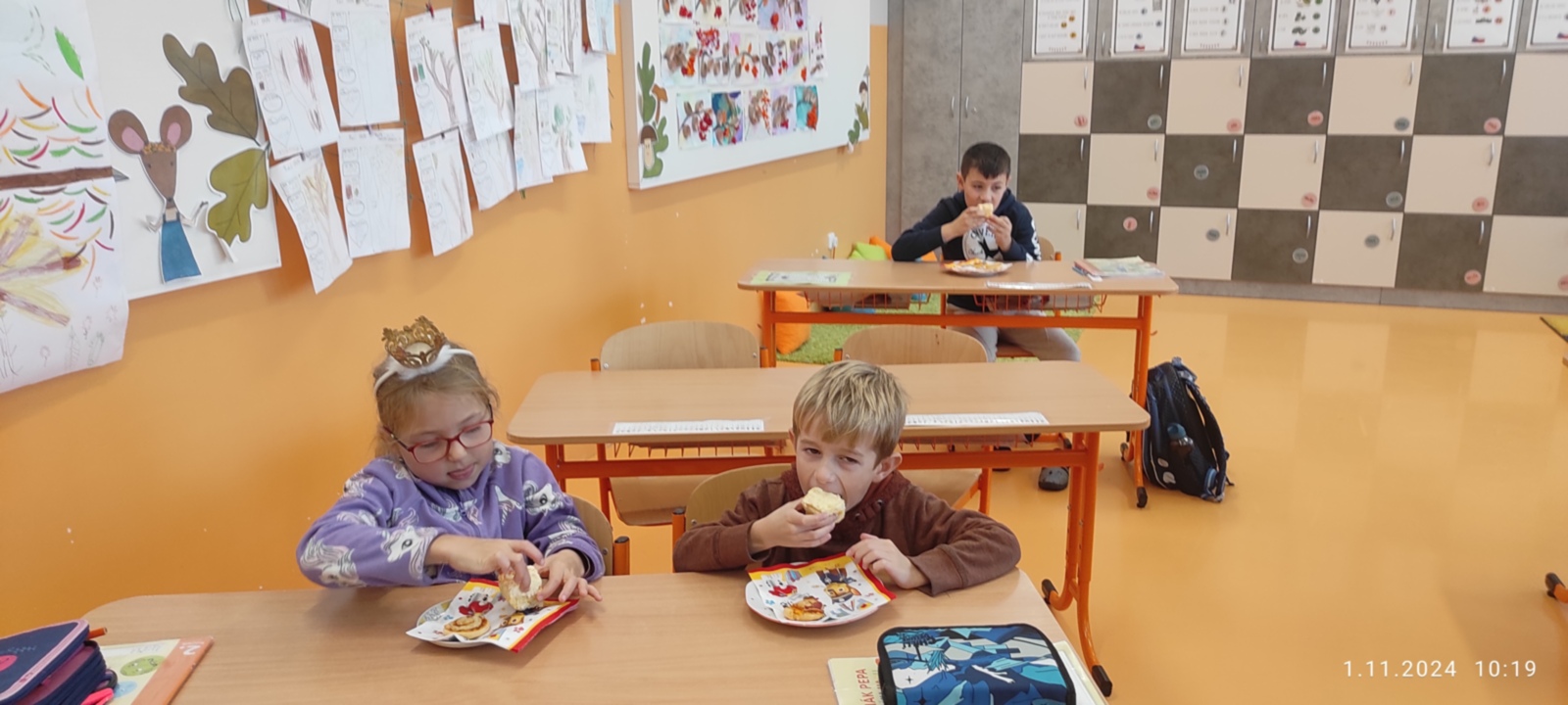 Dnes jsme prožili poslední den se spolužákem Sebíkem, který odchází na jinou školu. Sebík si pro nás připravil milé pohoštění i bonbonky. I my jsme mu připravili prima den. Zahrál si na pana učitele, pohostil děti a pak už jsme se jen loučili. Děti mu vyrobily dárečky od srdce a na památku jsme mu věnovali knihu Stříbrné dobrodružství s podpisy a fotografií a klíčenku se smajlíkem, aby byl stále veselý. Krátké video se zážitky ze školy se líbila nejen jemu, ale i všem dětem.