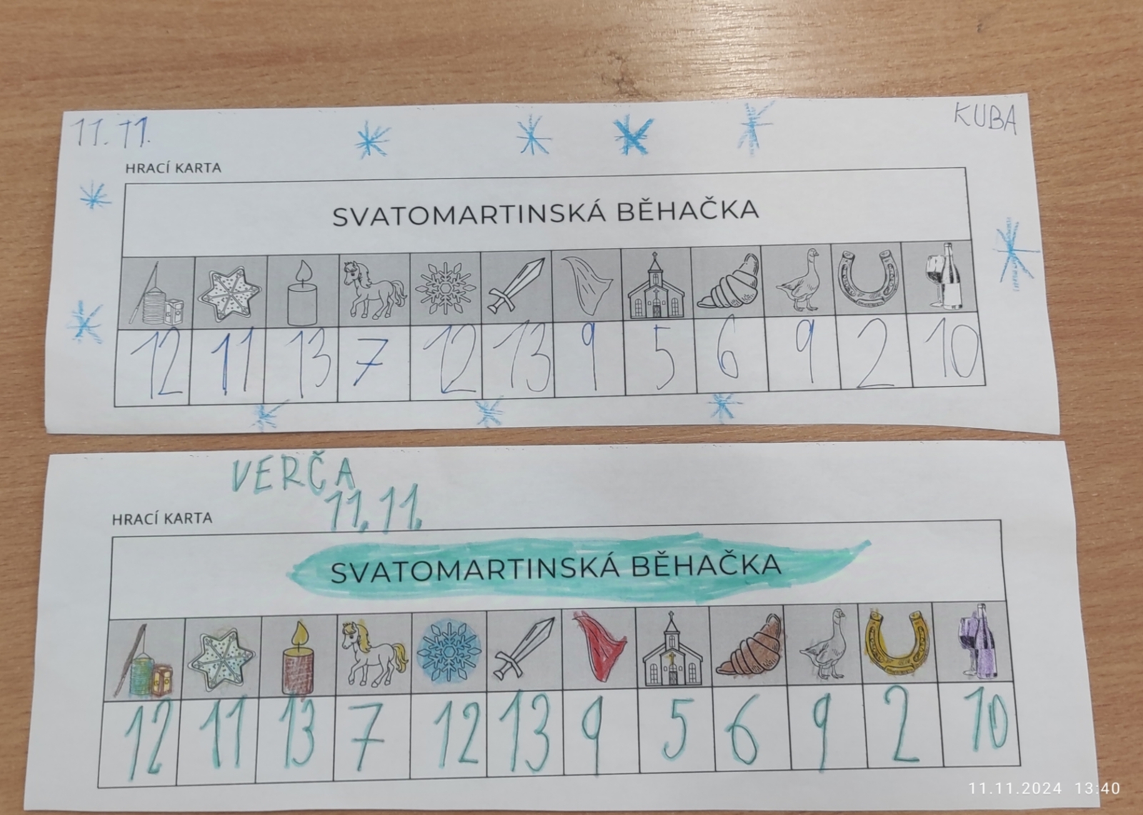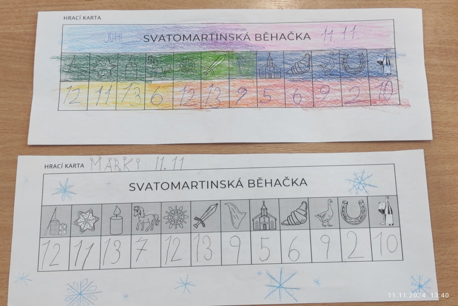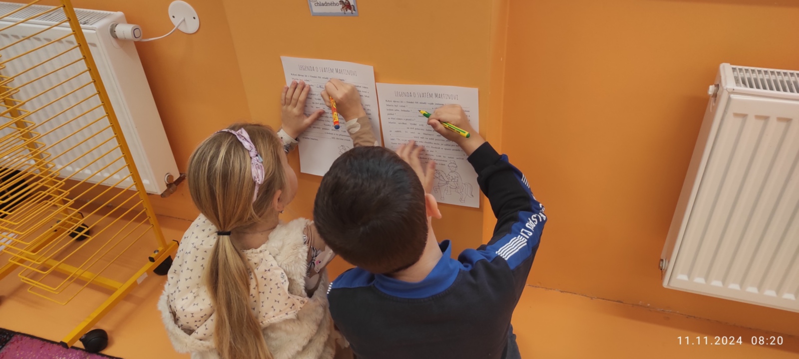Při vybarvování obrázku jsme odpovídali na kontrolní otázky, abychom dokázali, že vše umíme. Sníh sice Martin nepřivezl, ale radost i tak máme. Celý den to byla jedna velká svatomartinská bojovka.