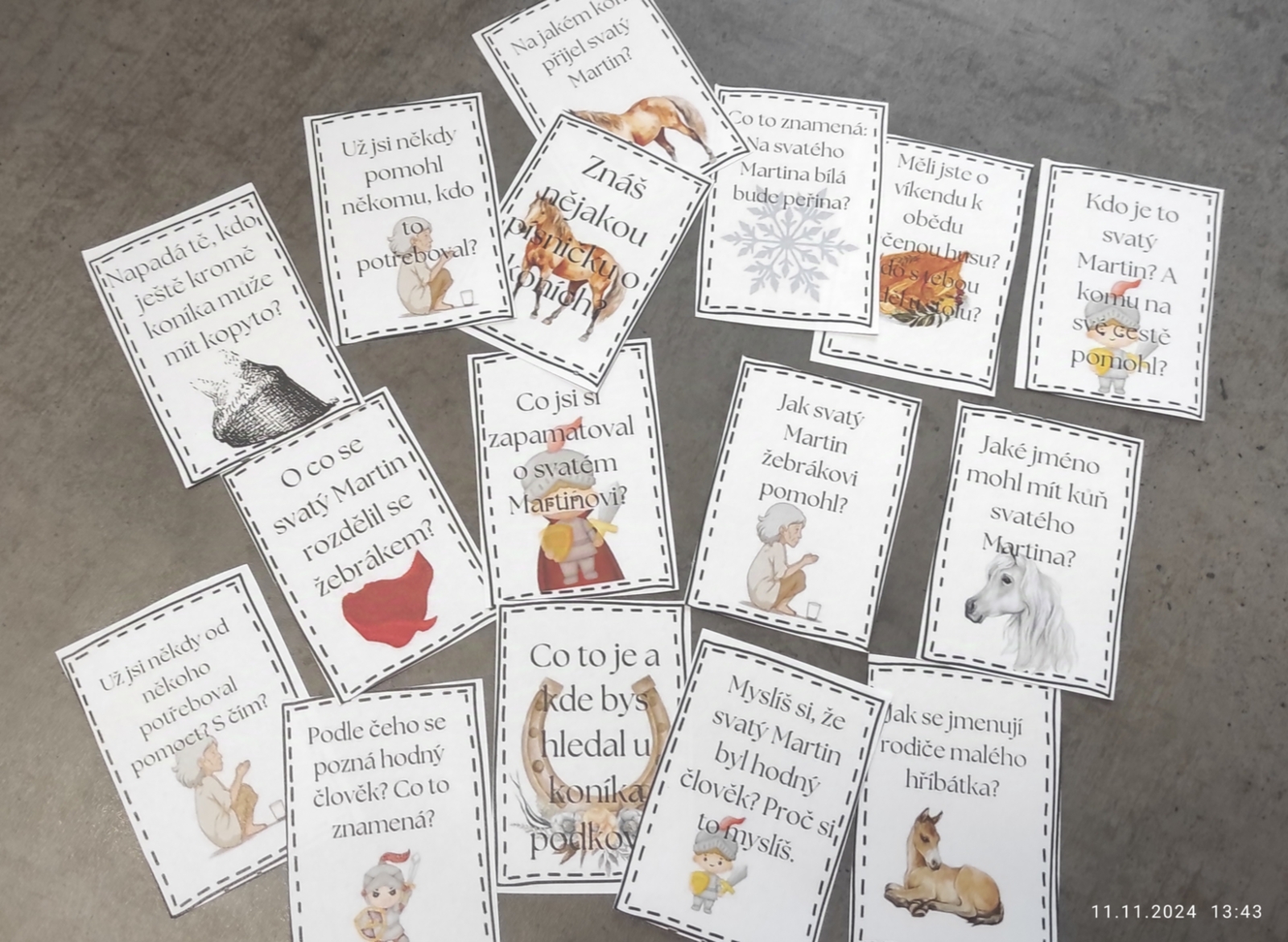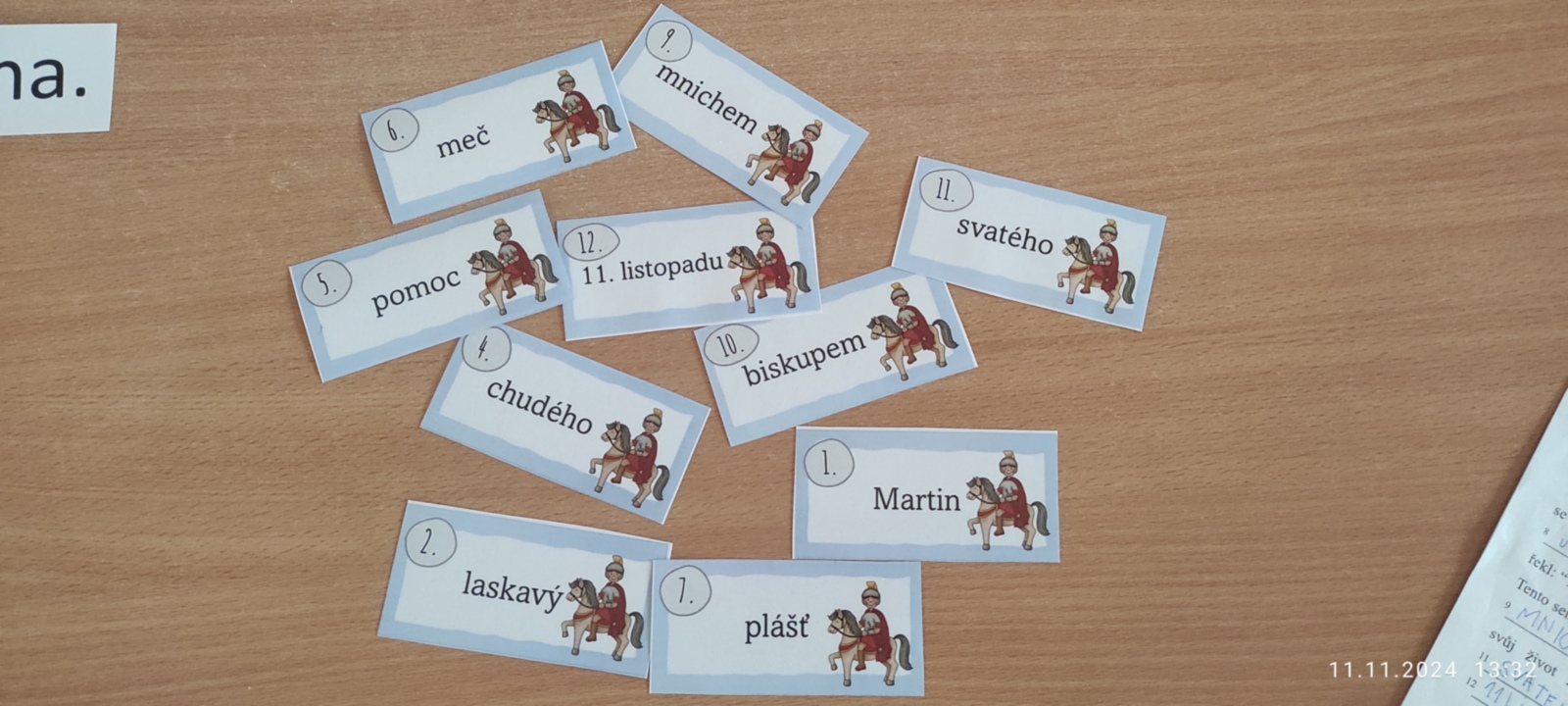 Děti už svátek svatého Martina znají. Ovšem připomenout si jej musíme. Pomocí krátkého vyprávění jsme si vše zopakovali a hurá na čtení s porozuměním. Všichni si sami přečetli příběh a vyhledávali pomocí malé nápovědy chybějící slova. Museli pracovat tiše, aby nepřeslechli cinkot podkoviček a padání vloček.