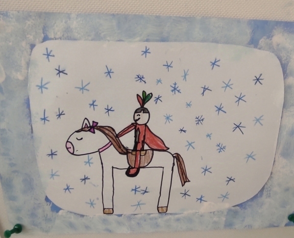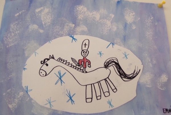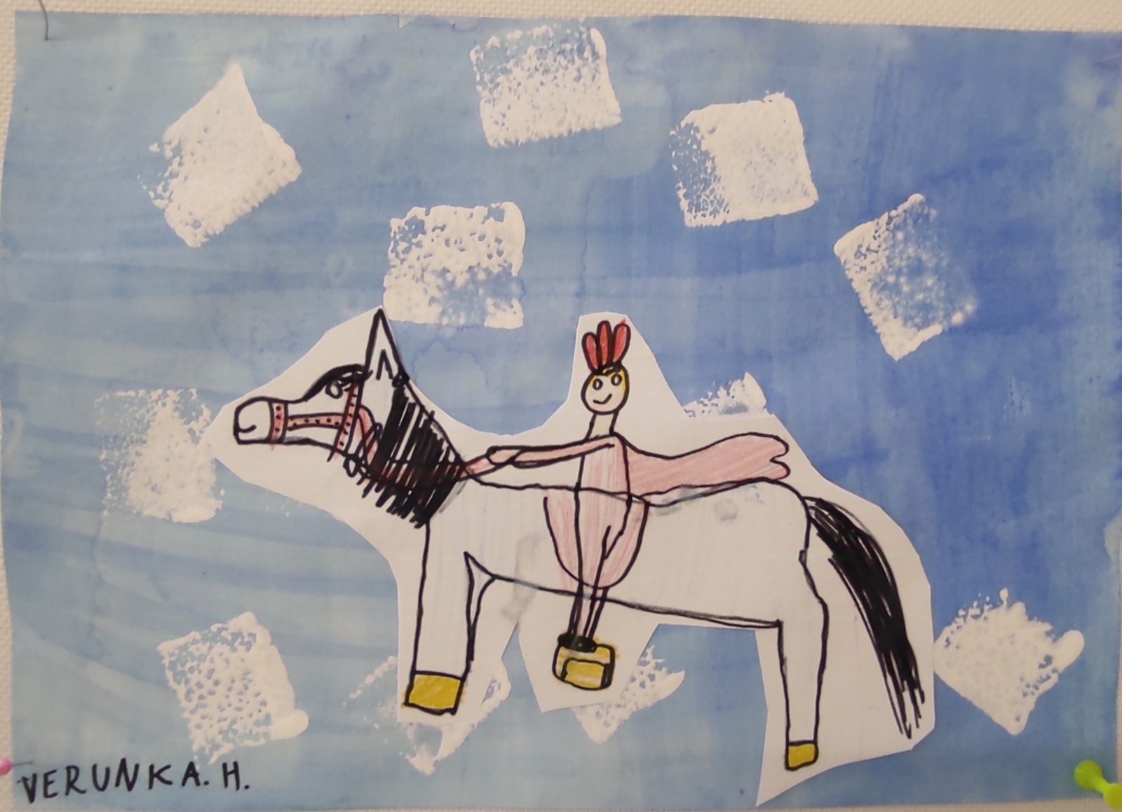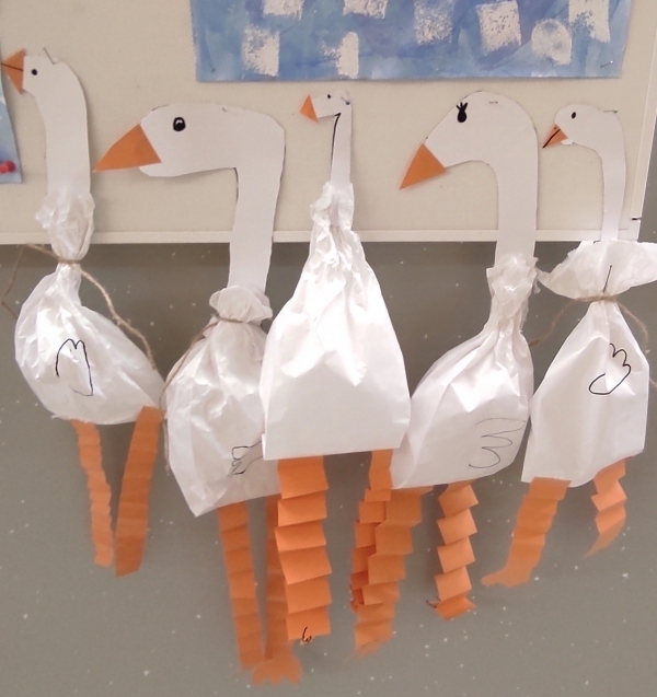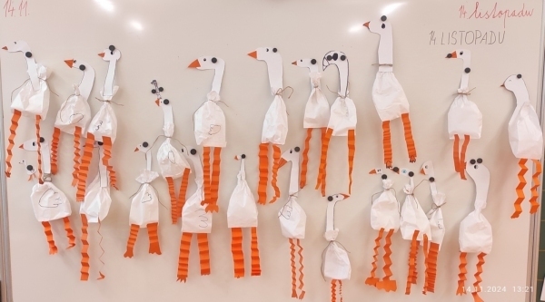 Věděli jste, že pracujeme bez šablonek, vše je naše představivost a kreativita? Někdy to není snadné, ale hlavní je, že se tvořit nebojíme a baví nás to. Díky naší snaživosti nám chodbu zdobí cválající Martinové na bílém koni a husí pochod. Tak račte nahlédnout.