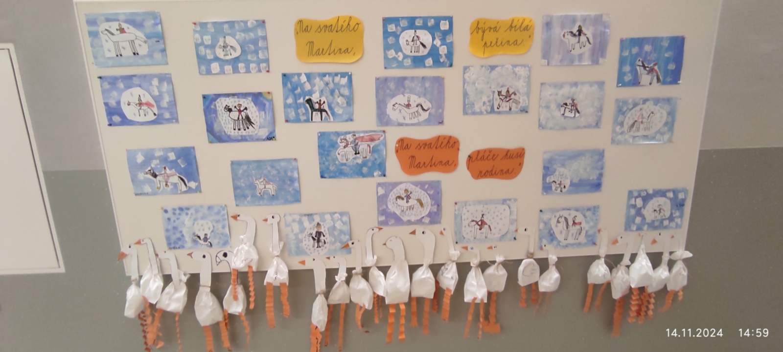 Ve výtvarné výchově a pracovních činnostech jsme si tento týden vytvořili Martina na bílém koni s troškou sněhu a také svatomartinské husy. Naše práce vznikly na základě skládání pranostik: "NA SVATÉHO MARTINA, BÝVÁ BÍLÁ PEŘINA." a " NA SVATÉHO MARTINA, PLÁČE HUSÍ RODINA."