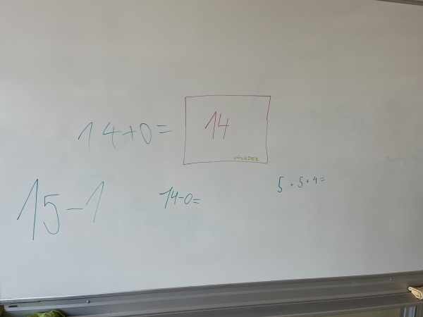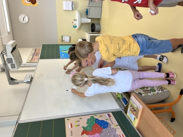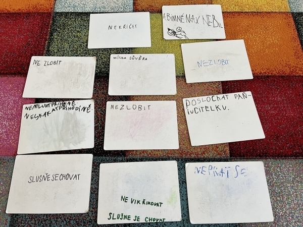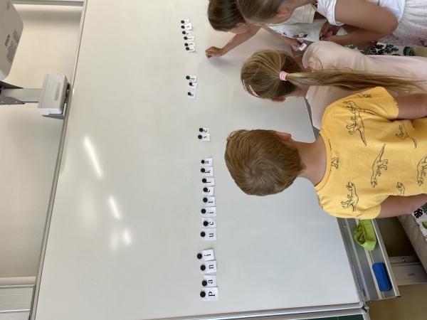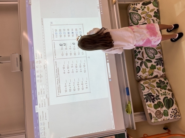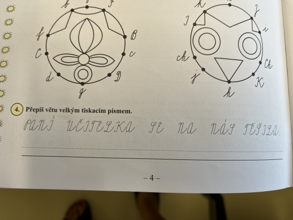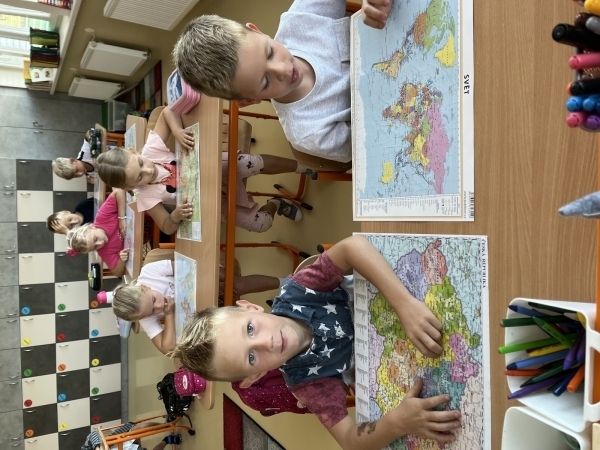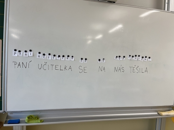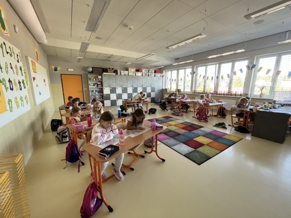 Poté, co druháci z "áčka" vyšlapali až do horního patra, našli svou novou třídu. Vytvořili společně pravidla třídy, hledali na mapě světa a ČR a vyprávěli si zážitky z prázdnin. V matice zopakovali počítání do dvaceti a v českém jazyce opakují písmena a učivo z první třídy.