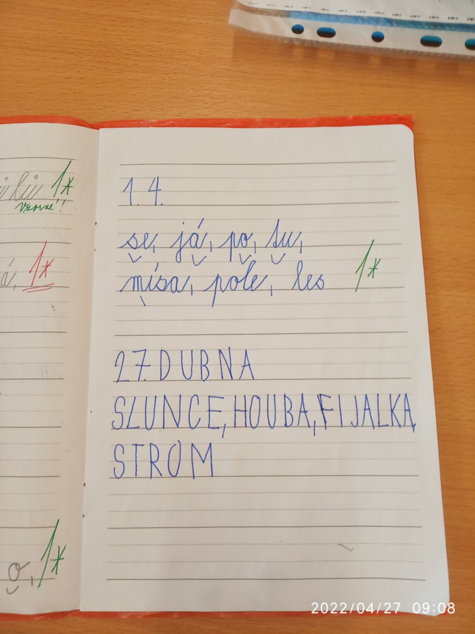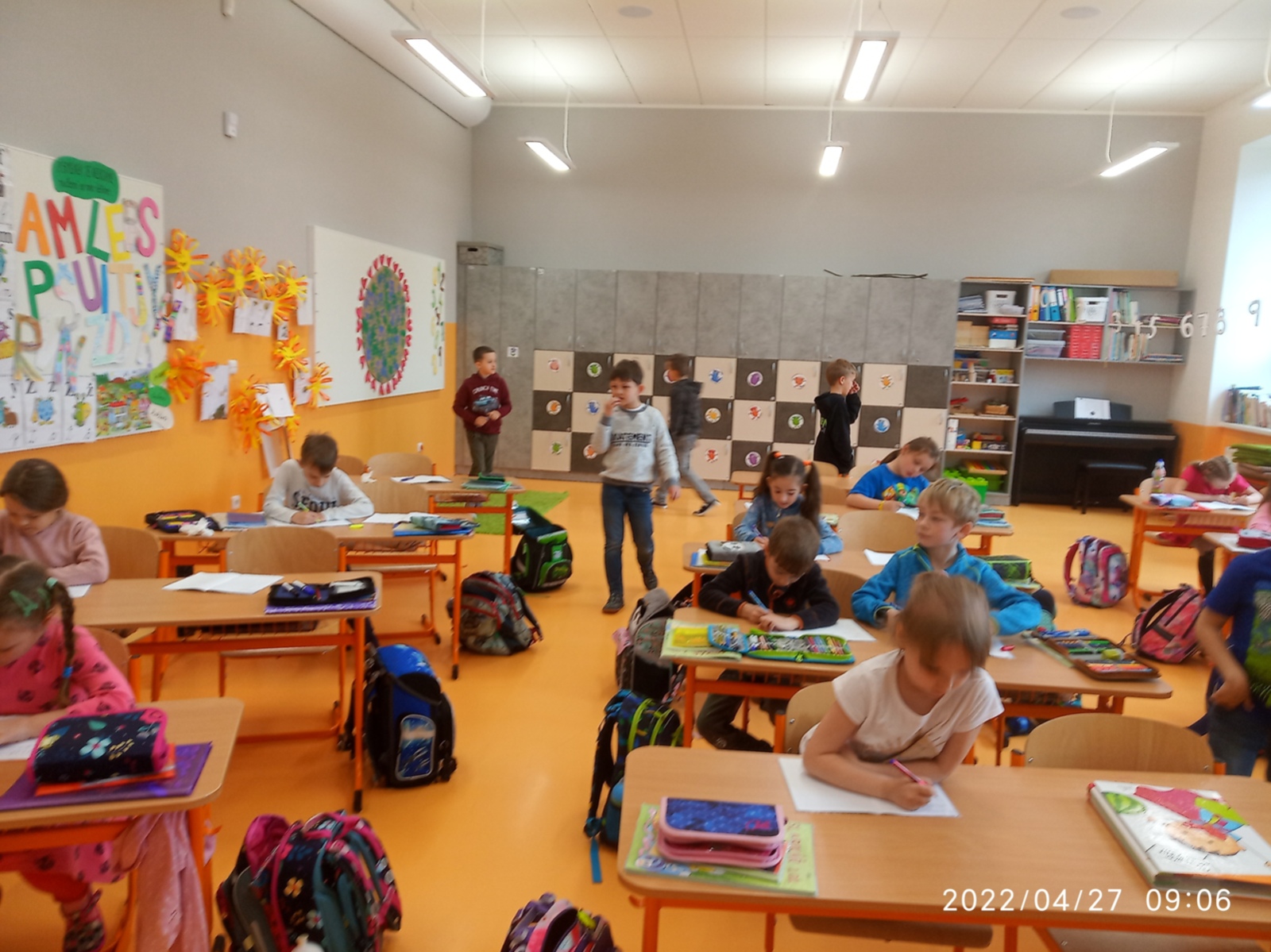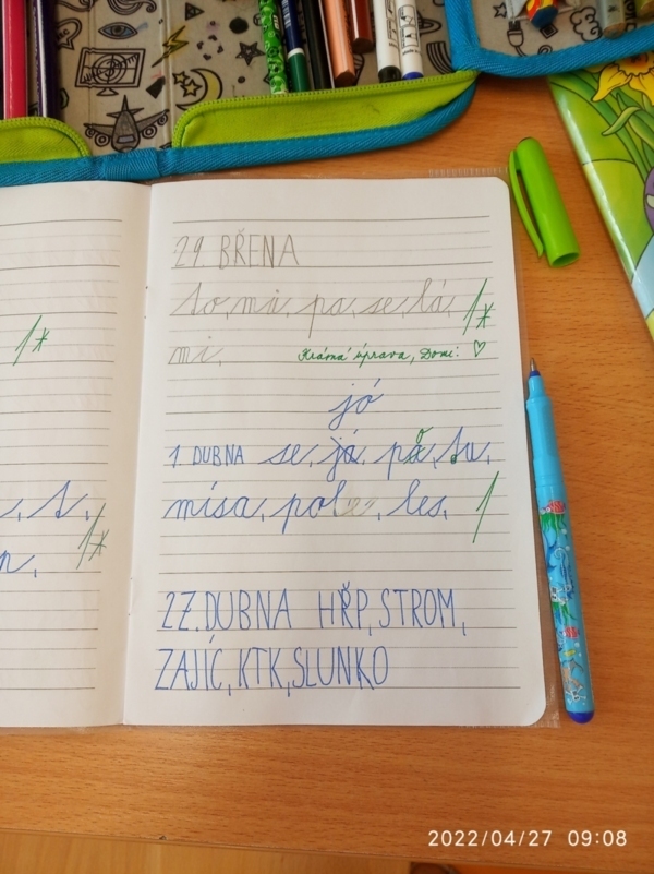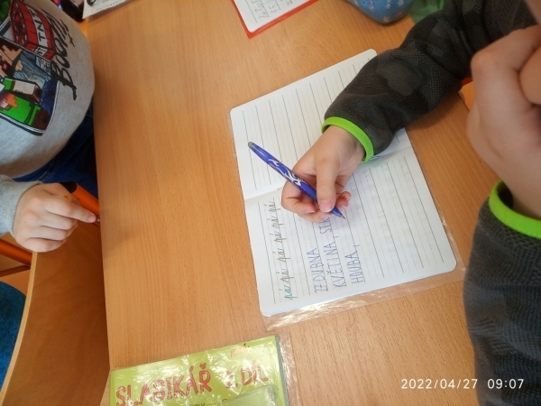 Dnes si prvňáčci vyzkoušeli autodiktát. Děti hledaly ve třídě a na chodbě obrázky, obrázek musely přečíst, slovo si zapamatovat a pak napsat do sešitu hůlkovým písmem podle vlastního tichého diktátu. Všechny děti se velmi snažily. Přestože dělaly chybičky, náročnou práci zvládly skvěle. Určitě budeme tuto aktivitu dál trénovat. Příště třeba psacím písmem.