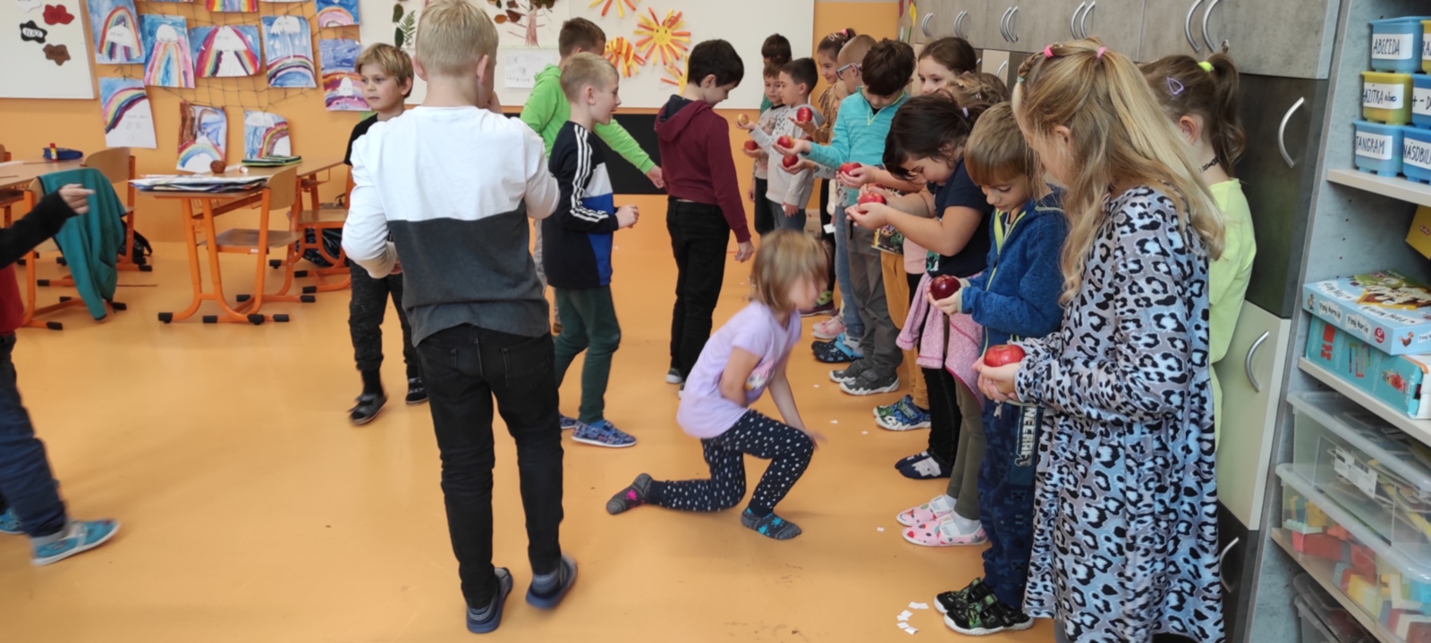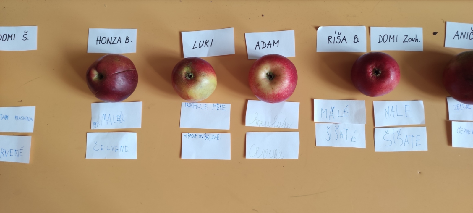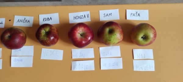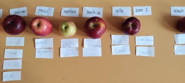 Tento týden jsme se učili s pomocí jablíčka. V českém jazyce jsme spojovali abecedu, která vytvořila jablko, četli jsme báseň o jablíčku, a také jsme se díky jablkům zdokonalili ve tvoření přídavných jmen a slov souznačných. Jablka jsme si změřili, zkoumali je a vybírali podle barvy, tvaru a vůně to nej jablíčko. Přesvědčili jsme se, že je každé jablíčko něčím krásné. Jedno je krásně lesklé, jiné má úžasnou barvu, další zase nádherně voní... Na našich talířích vypadají všechna k nakousnutí, ale jak chutnají doopravdy, to zjistíme jindy. Na ochutnávku už nám totiž nezbyl čas.