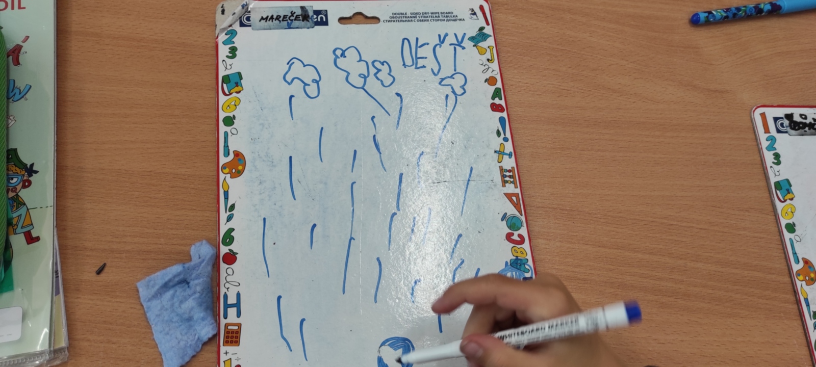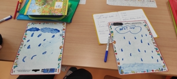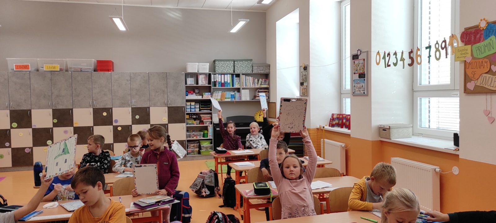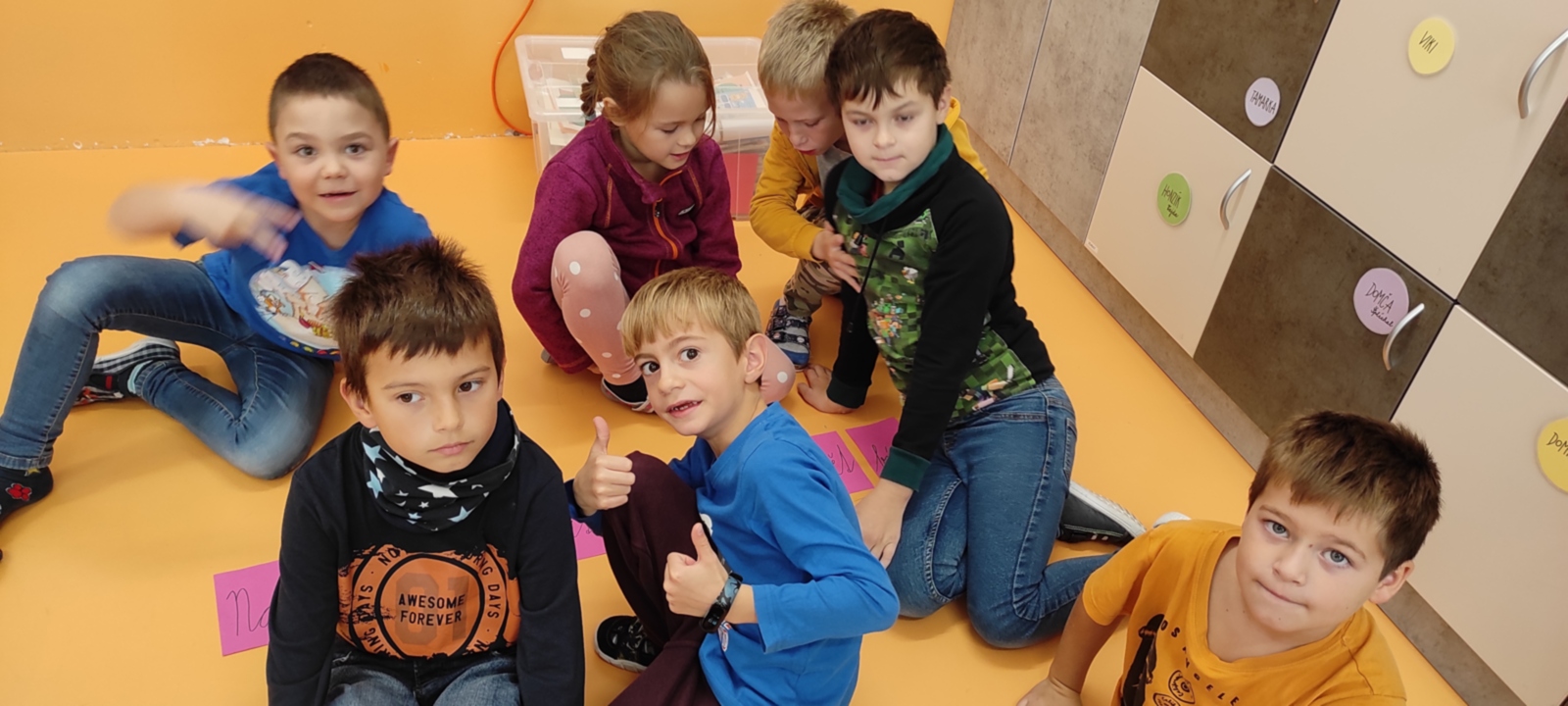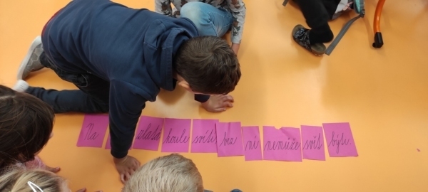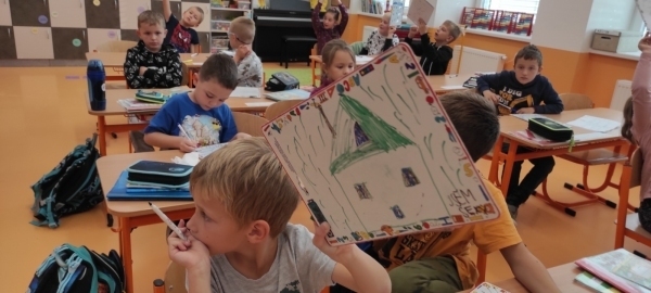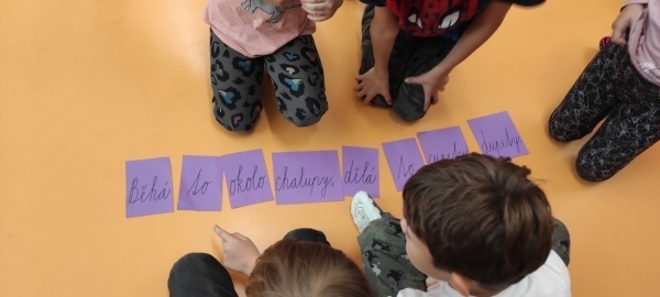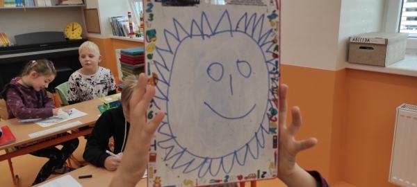 V hodinách českého jazyka zvládneme i nelehké úkoly. Tak třeba hádanky. Říkáte si, vždyť to je hračka! Ale není tomu vždycky tak. Ve skupinkách měly děti za úkol z "roztrhaných" slov sestavit dvě hádanky, přečíst je, vyluštit a řešení pak nakreslit na mazací tabulku. Uf, trošku jsme se zapotili, ale jsme rádi, že jsme to zvládli. Čeština s Pepou nás baví.