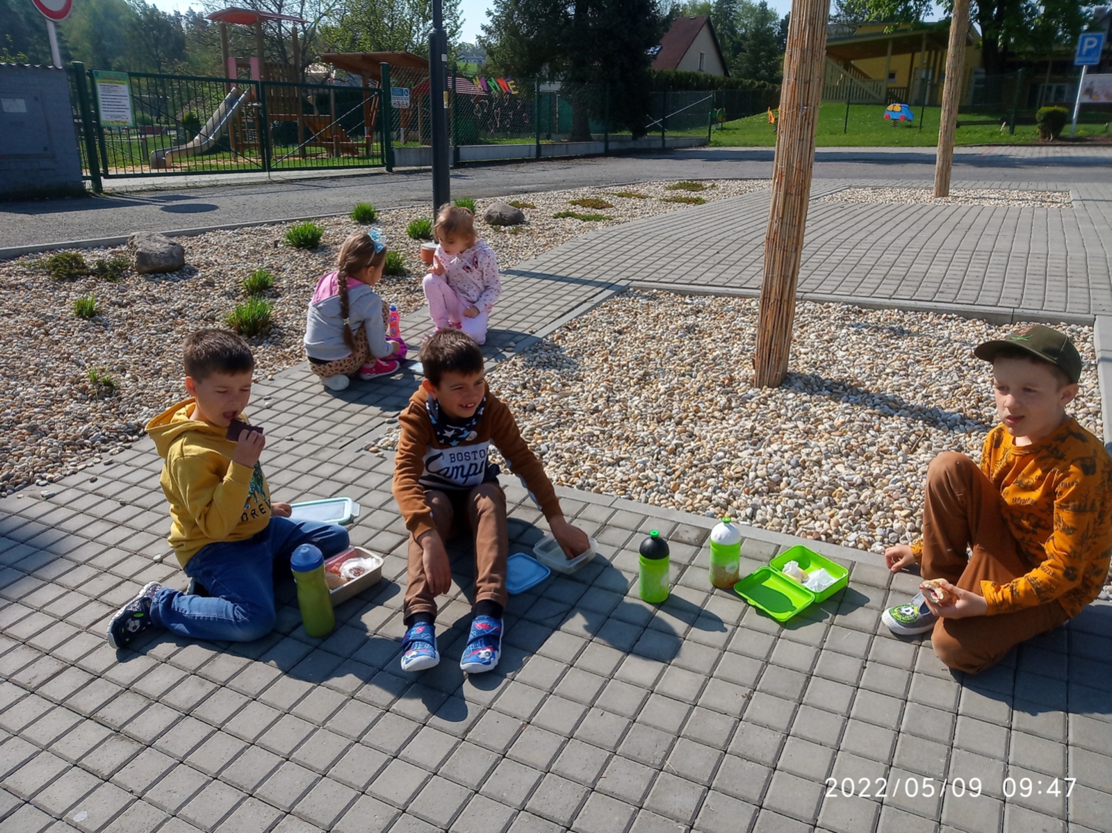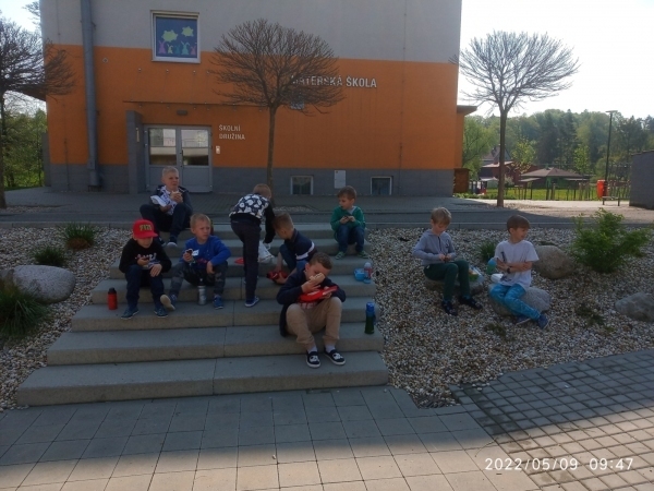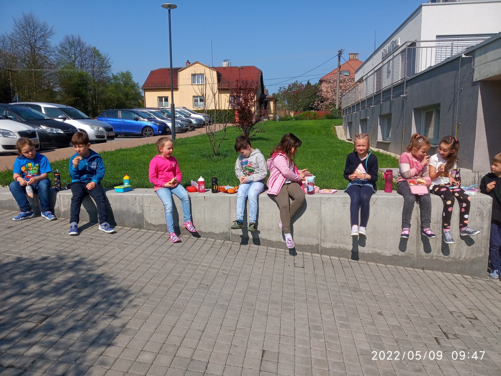 Dnes nás vylákalo teplé sluníčko. S radostí a se svačinkou v ruce jsme prožili velkou přestávku venku. To byste nevěřili, jak všichni baštili. No jo, čerstvý vzduch dělá divy.