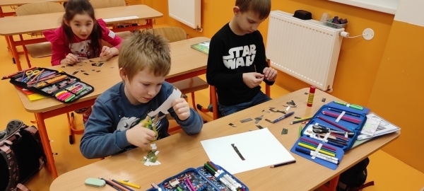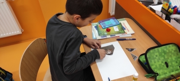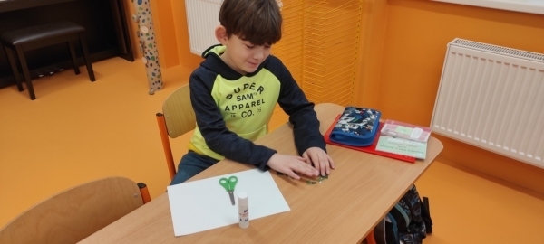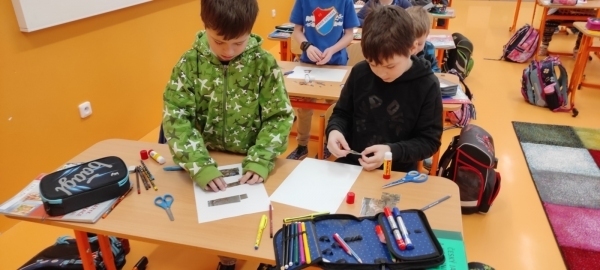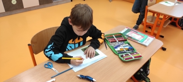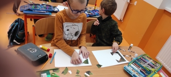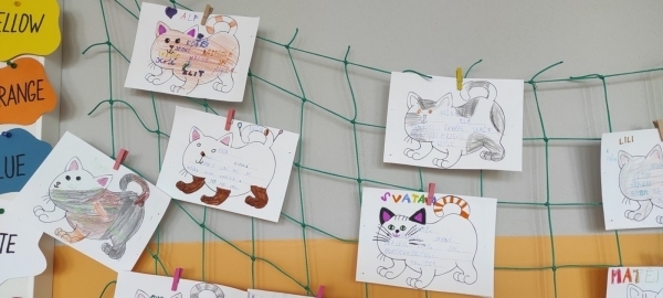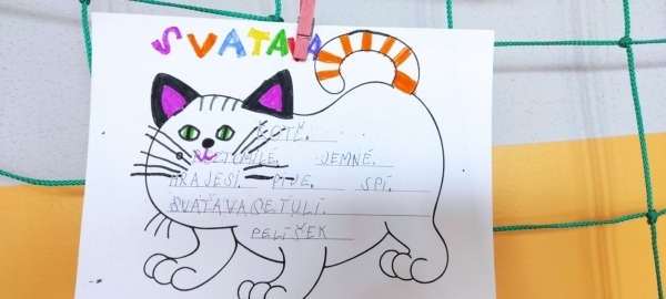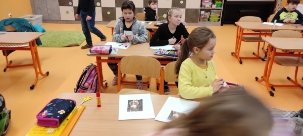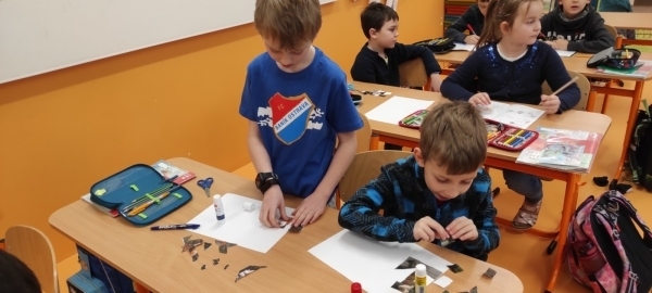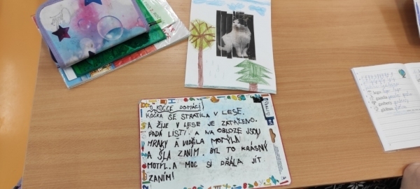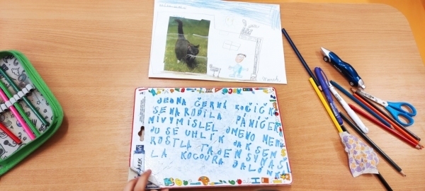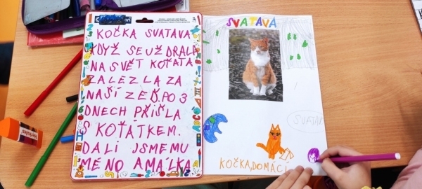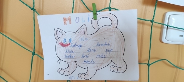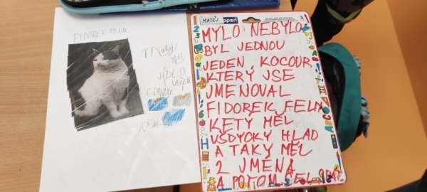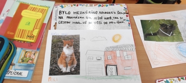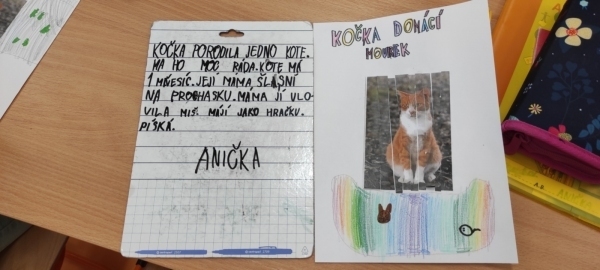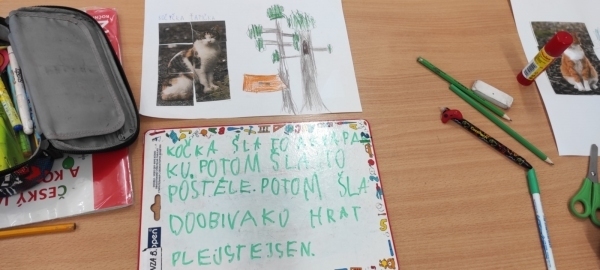 Úkol zněl: Rozstříhej obrázek (vytvořili si vlastní "puzzle"), poskládej ho a přilep na papír. Dokresli podle své fantazie. Vymysli k obrázku příběh. Samozřejmě nechybí ani kočičí pětilístek, ve kterém se zdokonalujeme ve slovních druzích a ve tvoření vět a asociací. Koukněte, jak se to dětem povedlo.