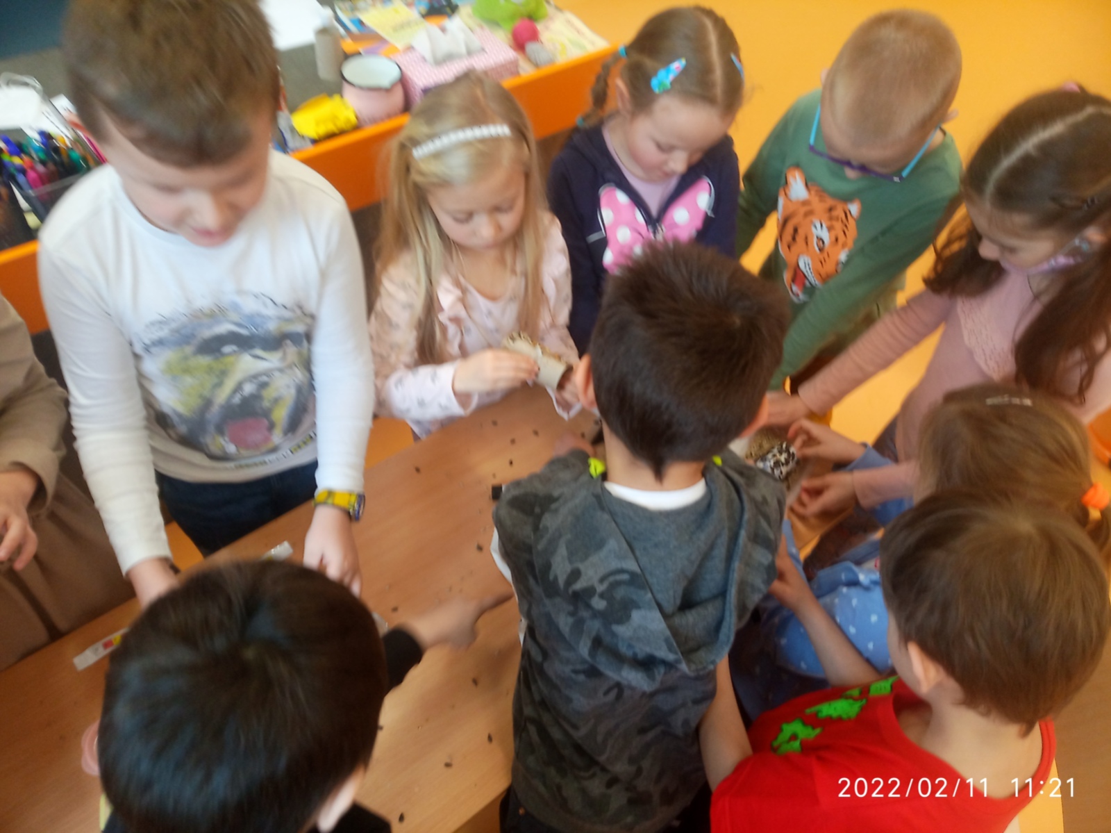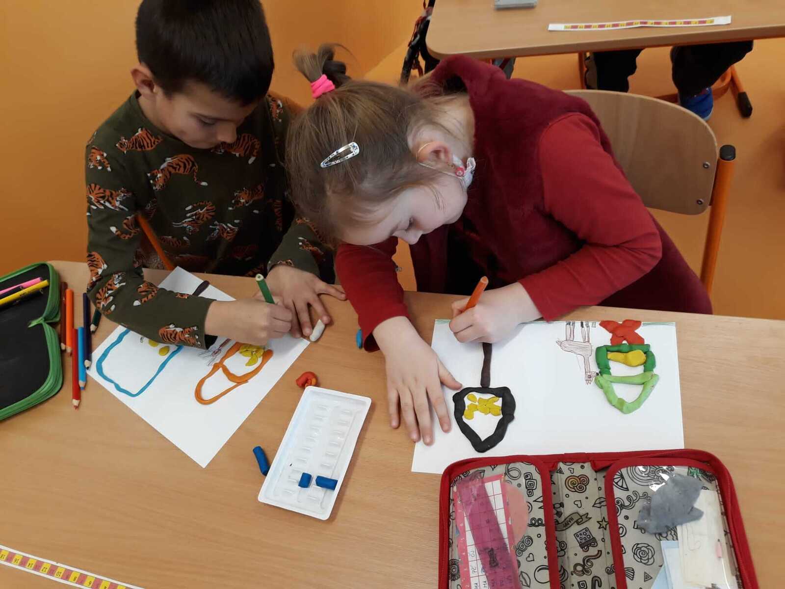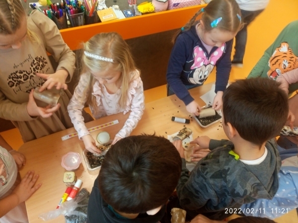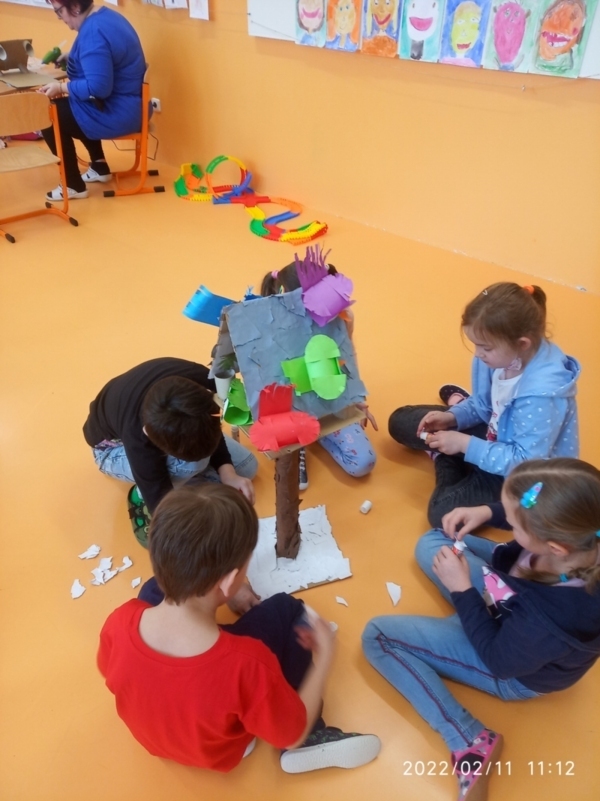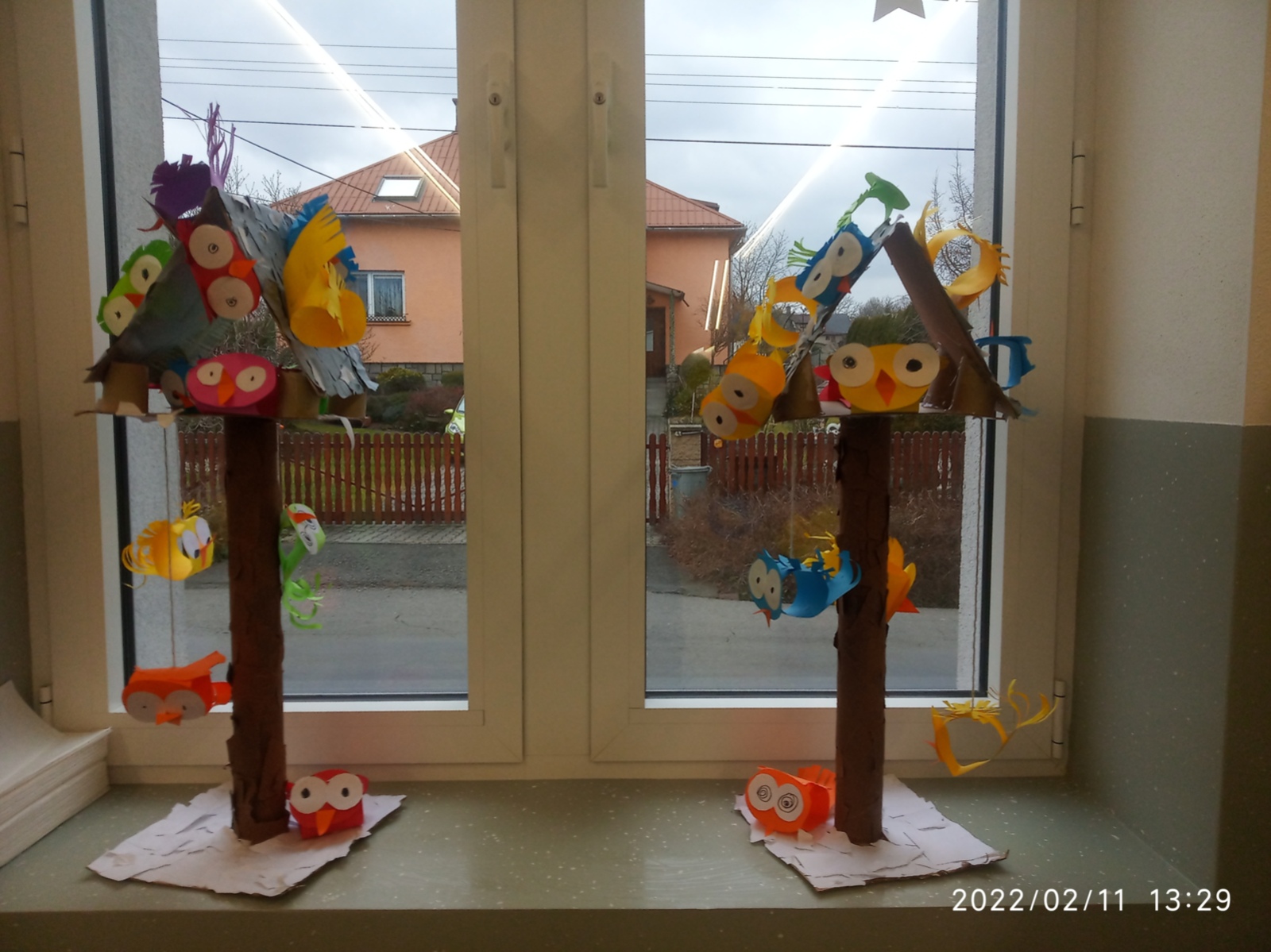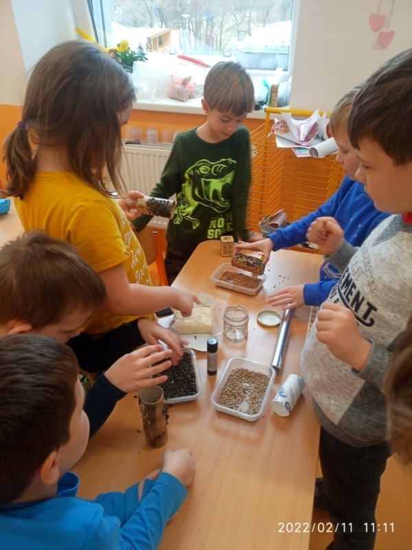 Vyrobily ptačí budky, ptáčky, krmítka, která pak v okolí školy rozmístily na stromy. I písnička Bude zima bude mráz zpříjemnila chvíle naší práce. A protože jsou to děti vskutku pilné, zvládly se naučit i báseň Vzkaz ve sněhu a hru Na kosa. Vymodelovaly zvířátka a krmelec a krmení pro lesní zvěř. Nechybělo ptačí počítání a čtení. Máme tolik zážitků! Zvířátkům v lese přejeme klid a ptáčkům dobrou chuť.