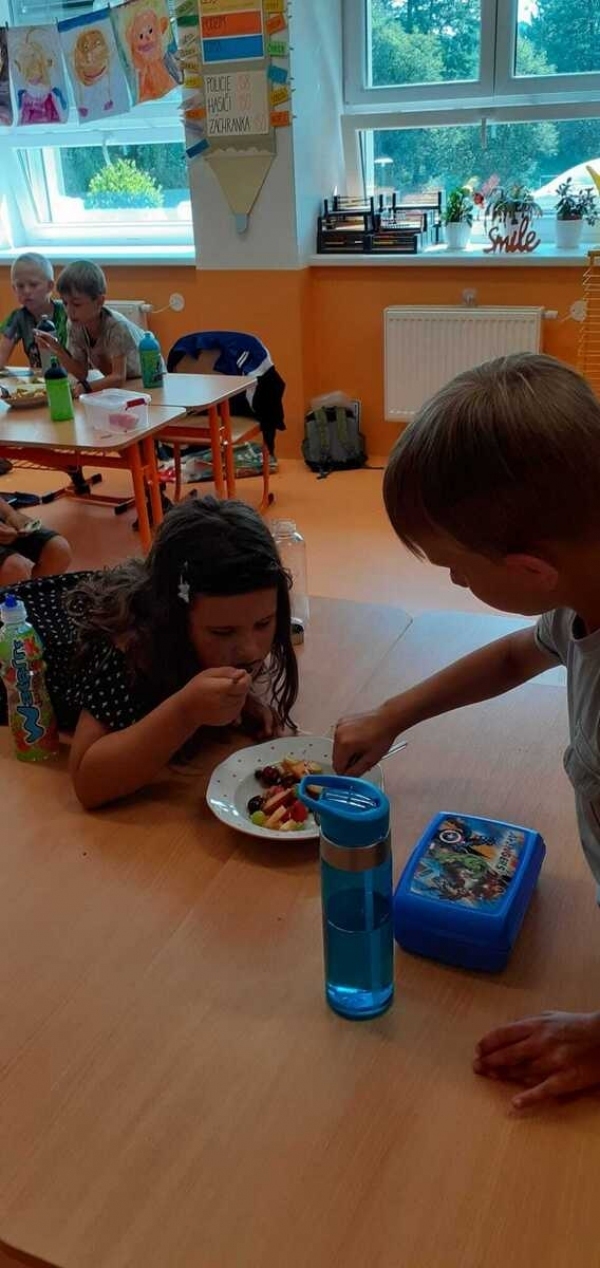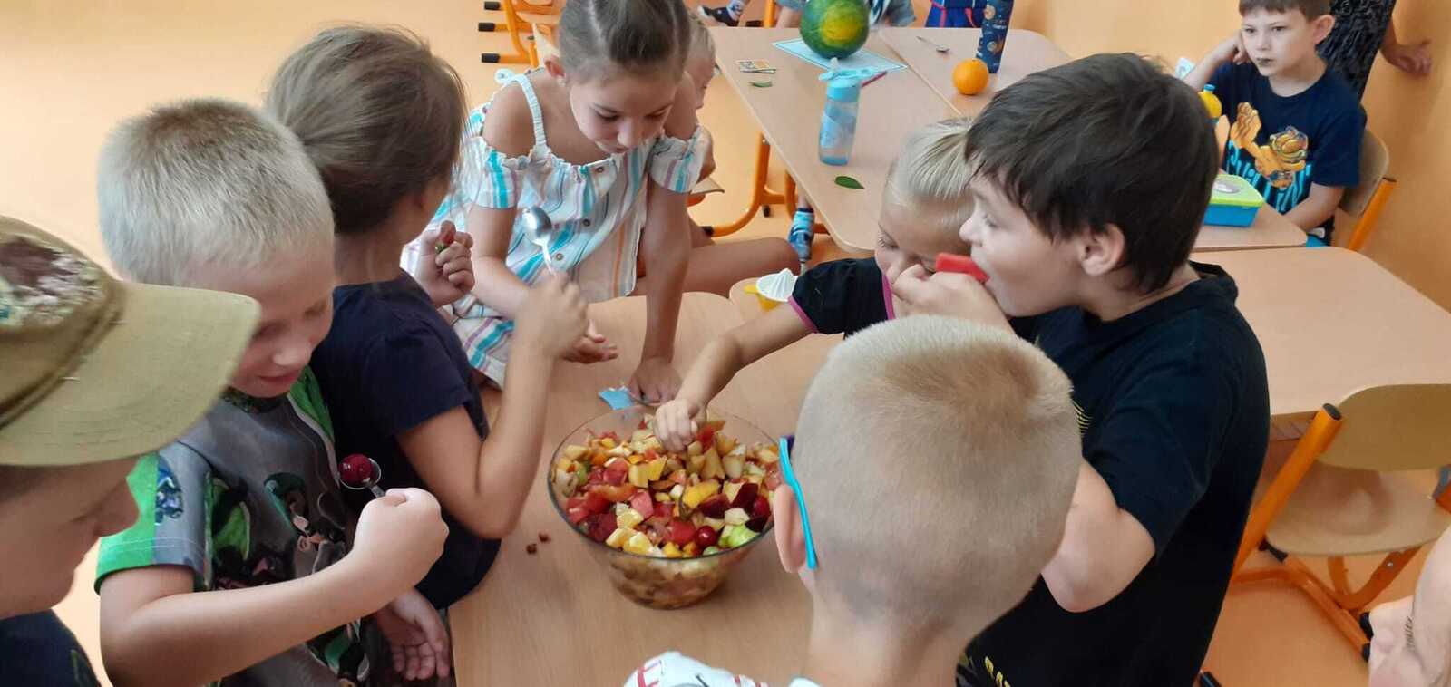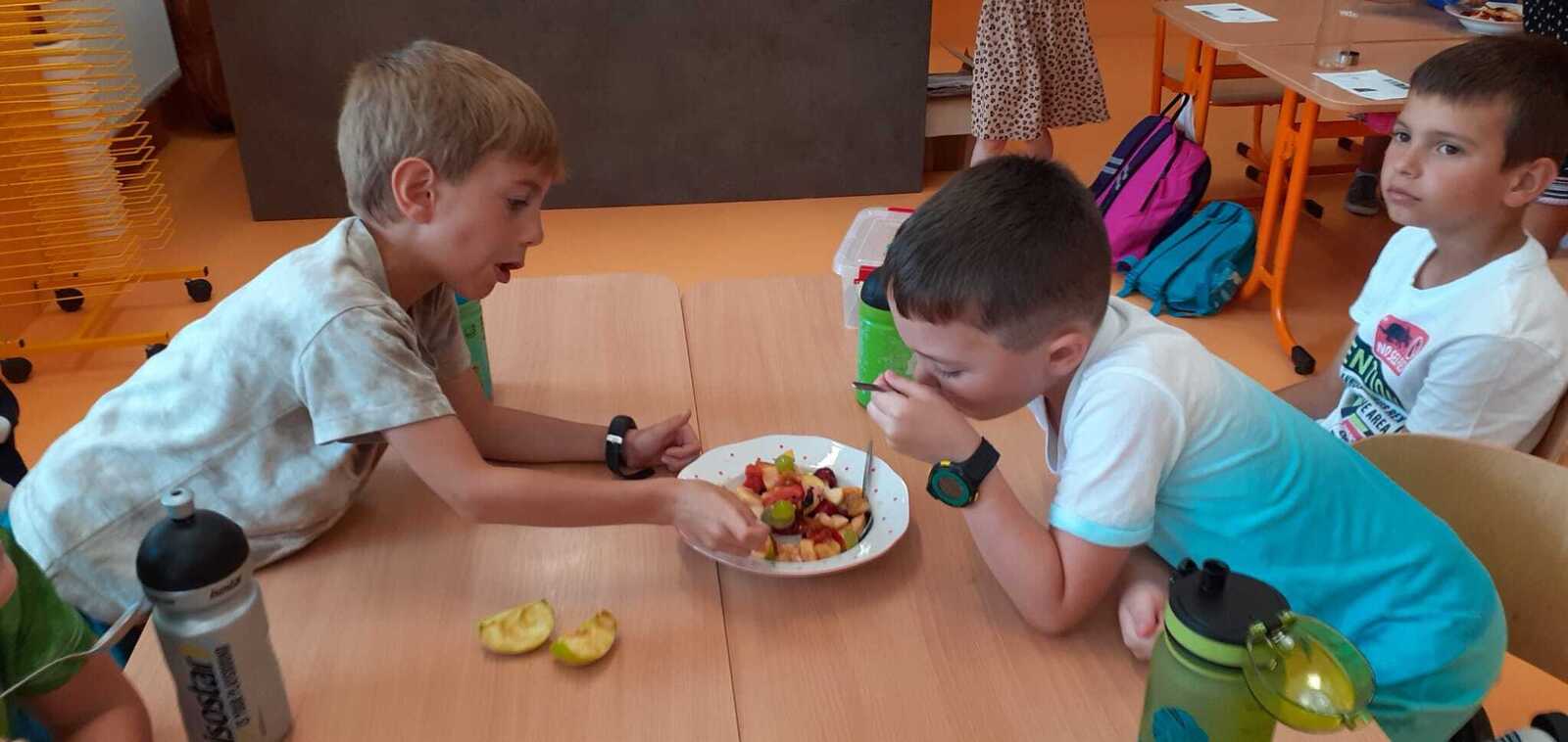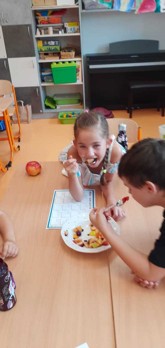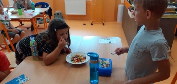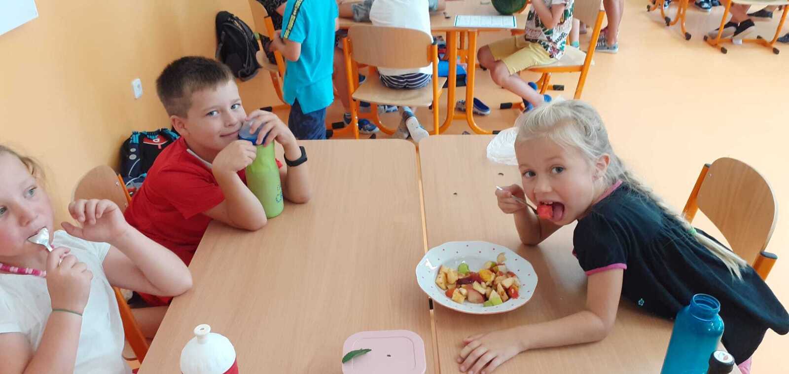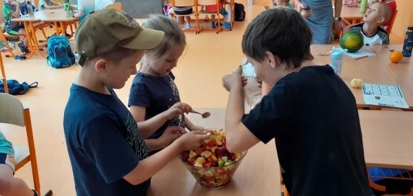 Dnes si děti připravily zdravé mlsání. Nejprve každý představil svůj kousek ovoce a pak krájely a krájely, až byla mísa plná, skoro jako v pohádce Hrnečku, vař! Málem přetekla. Ovoce jsme dochutili citronovou šťávou a mohli jsme baštit. A protože je velké horko, nechyběla domácí limonáda z bezové šťávy a máty. Vše bylo moc dobré. Udělali jsem sladkou tečku za báječným školním rokem. 🙂
