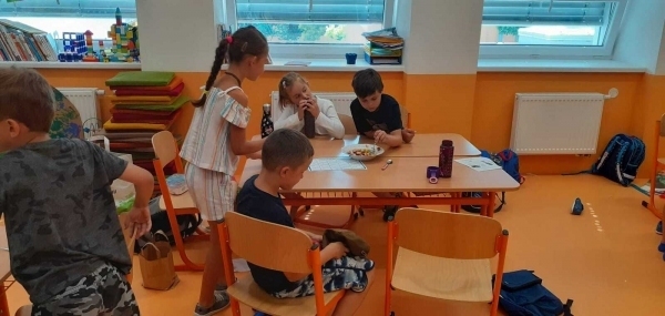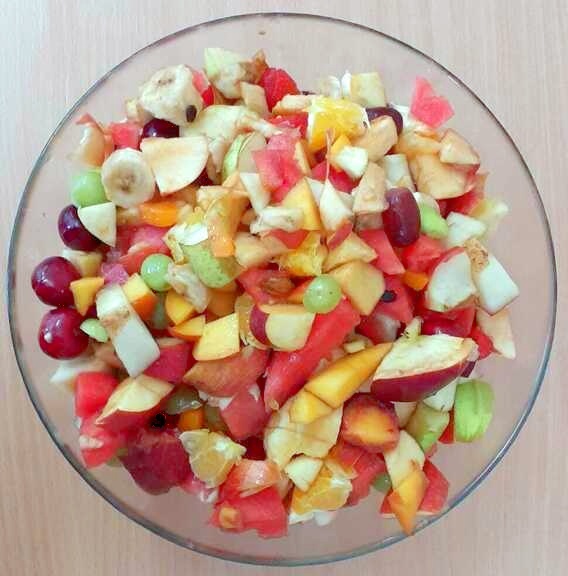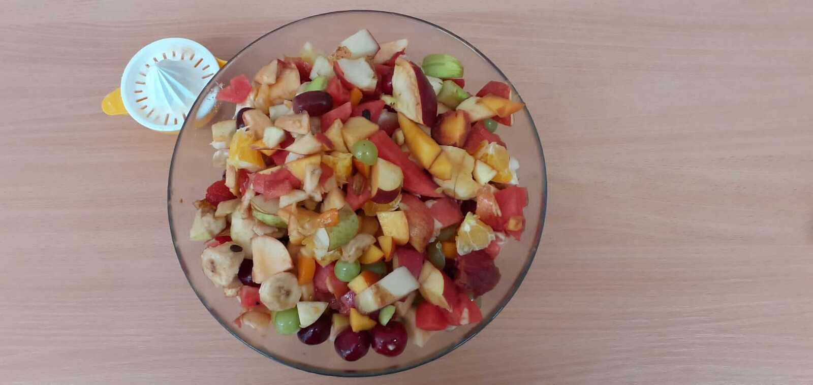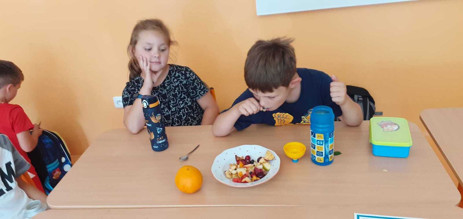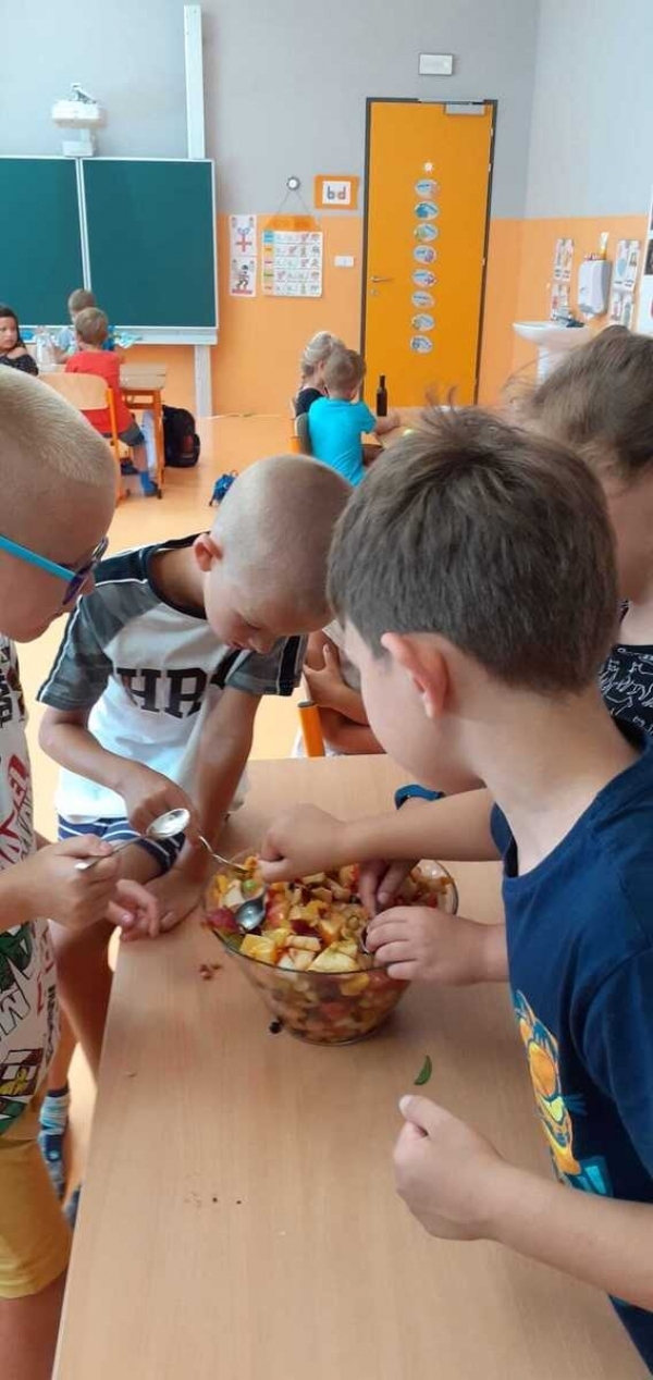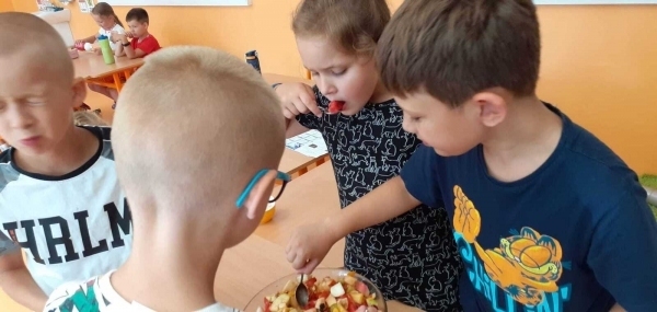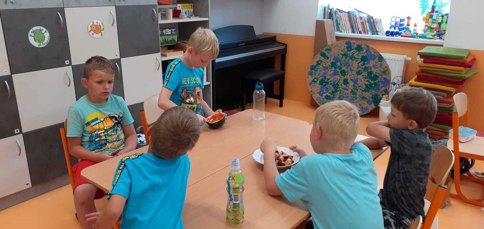 Dnes si děti připravily zdravé mlsání. Nejprve každý představil svůj kousek ovoce a pak krájely a krájely, až byla mísa plná, skoro jako v pohádce Hrnečku, vař! Málem přetekla. Ovoce jsme dochutili citronovou šťávou a mohli jsme baštit. A protože je velké horko, nechyběla domácí limonáda z bezové šťávy a máty. Vše bylo moc dobré. Udělali jsem sladkou tečku za báječným školním rokem. 🙂