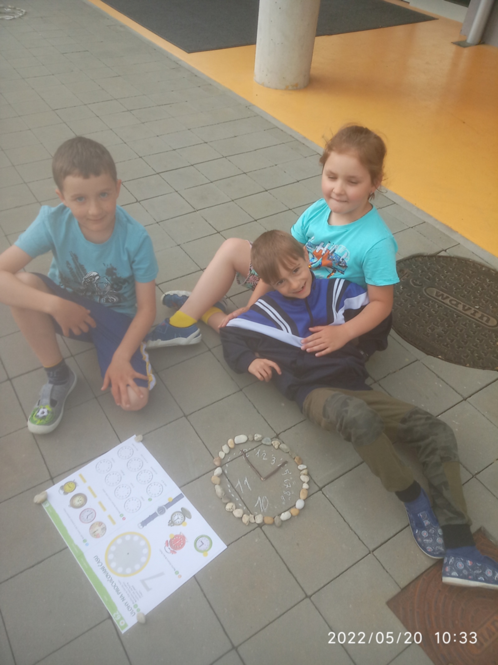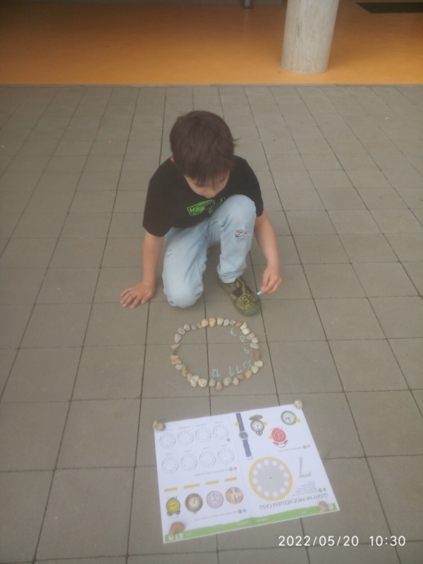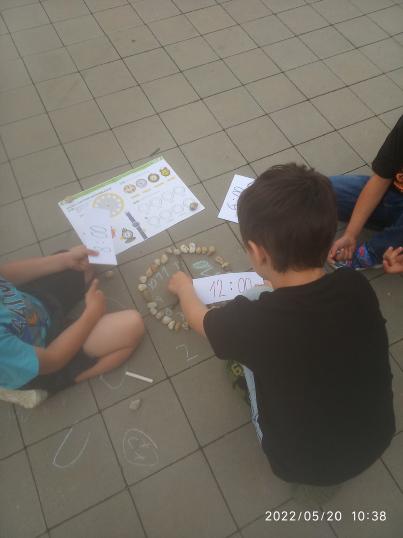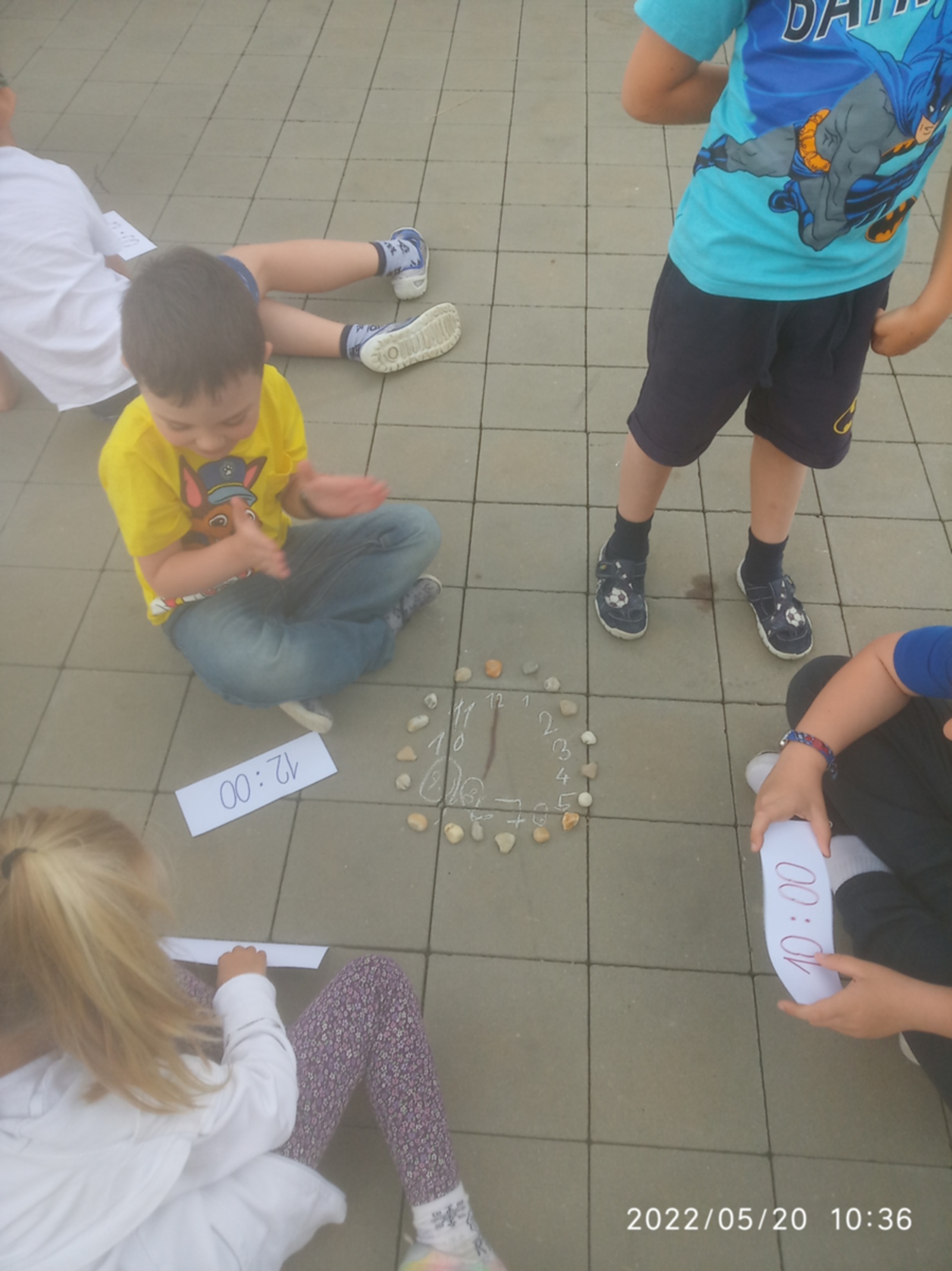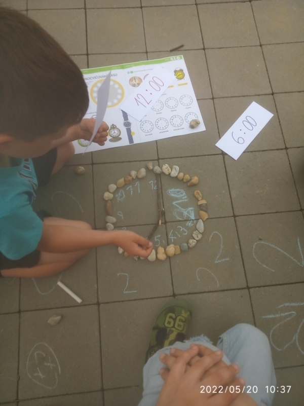 V prvouce se nyní prvňáčci učí o čase. Kolik má rok měsíců, jaké části má den a také určování času na hodinách. A tak jsme si je šli vytvořit ven. Určovali jsme čas podle zadání a povídali si o tom, co vše můžeme hodinami, hodinkami či stopkami změřit. Známe různé druhy hodin a víme, k čemu slouží.