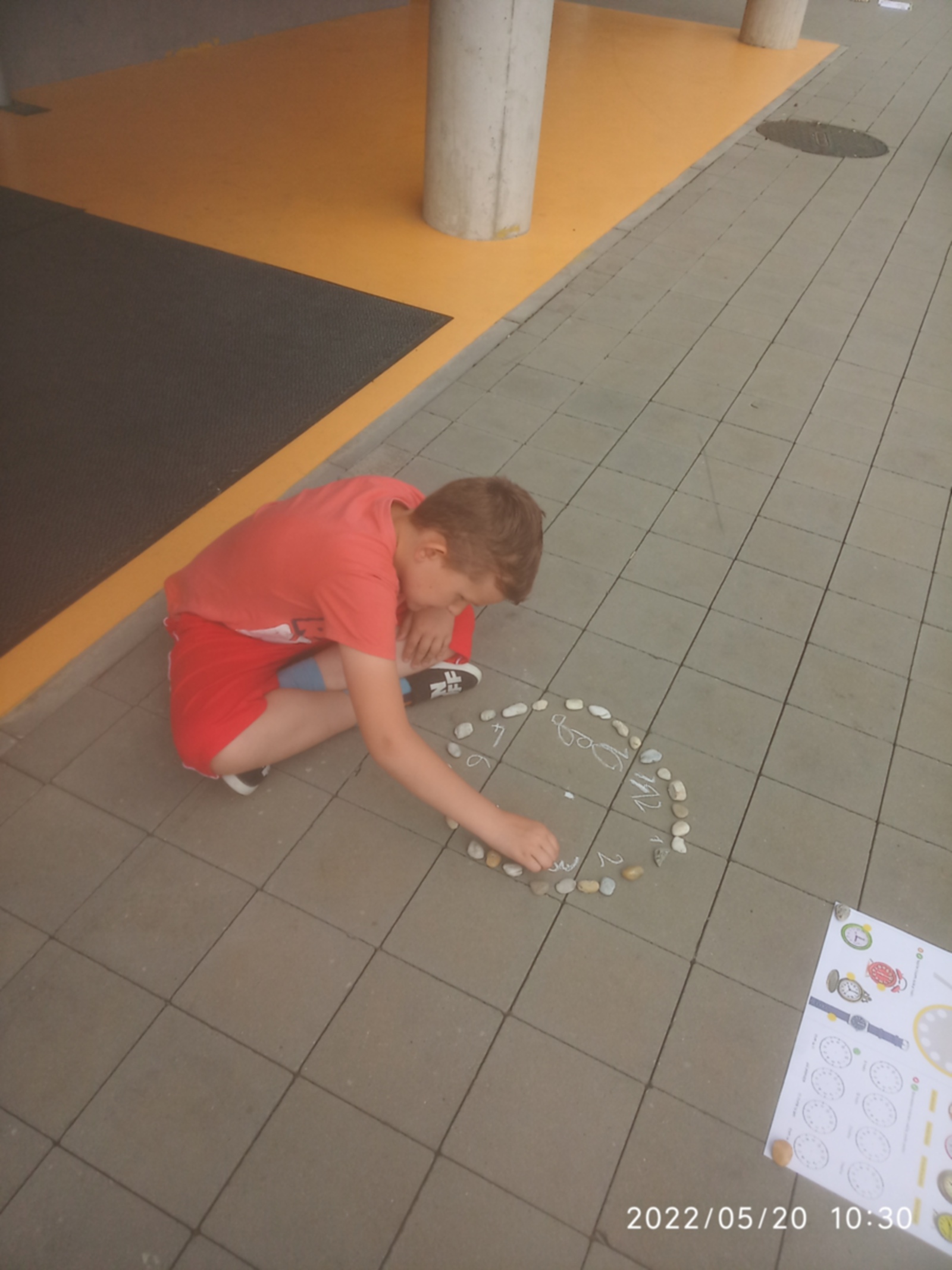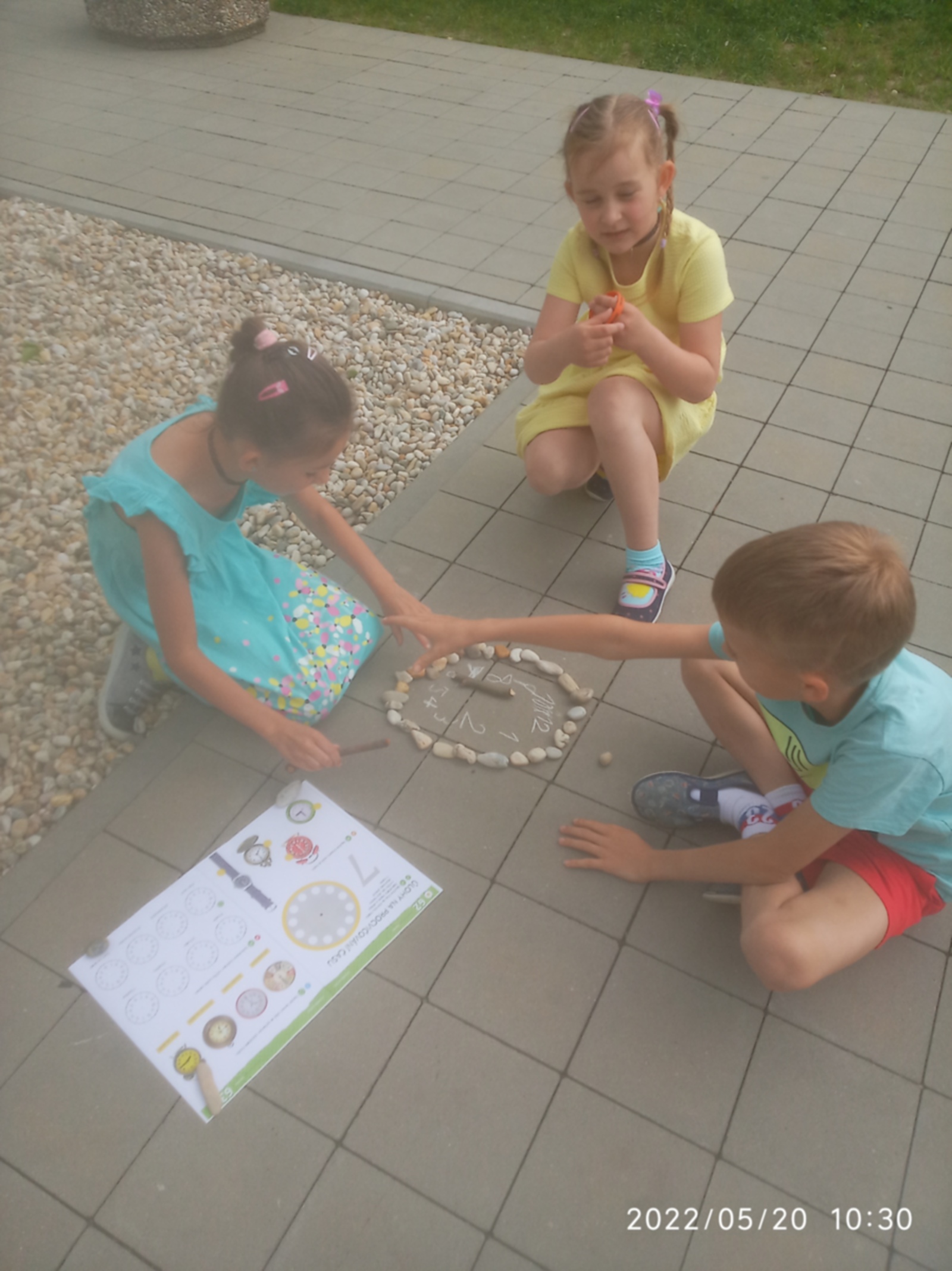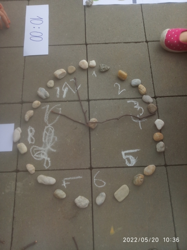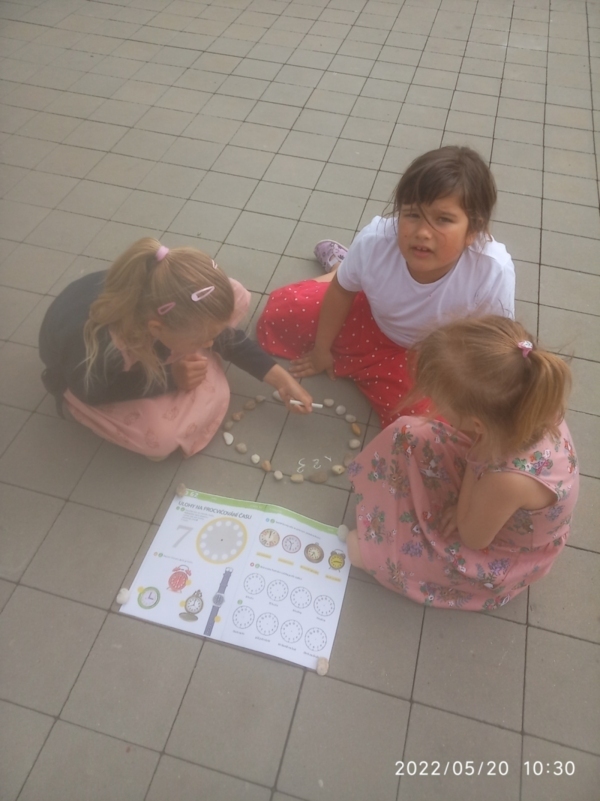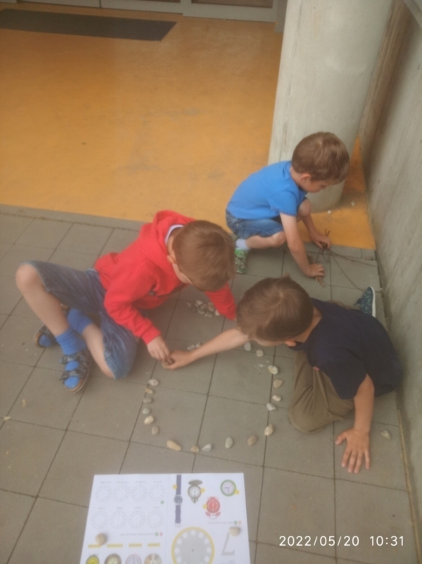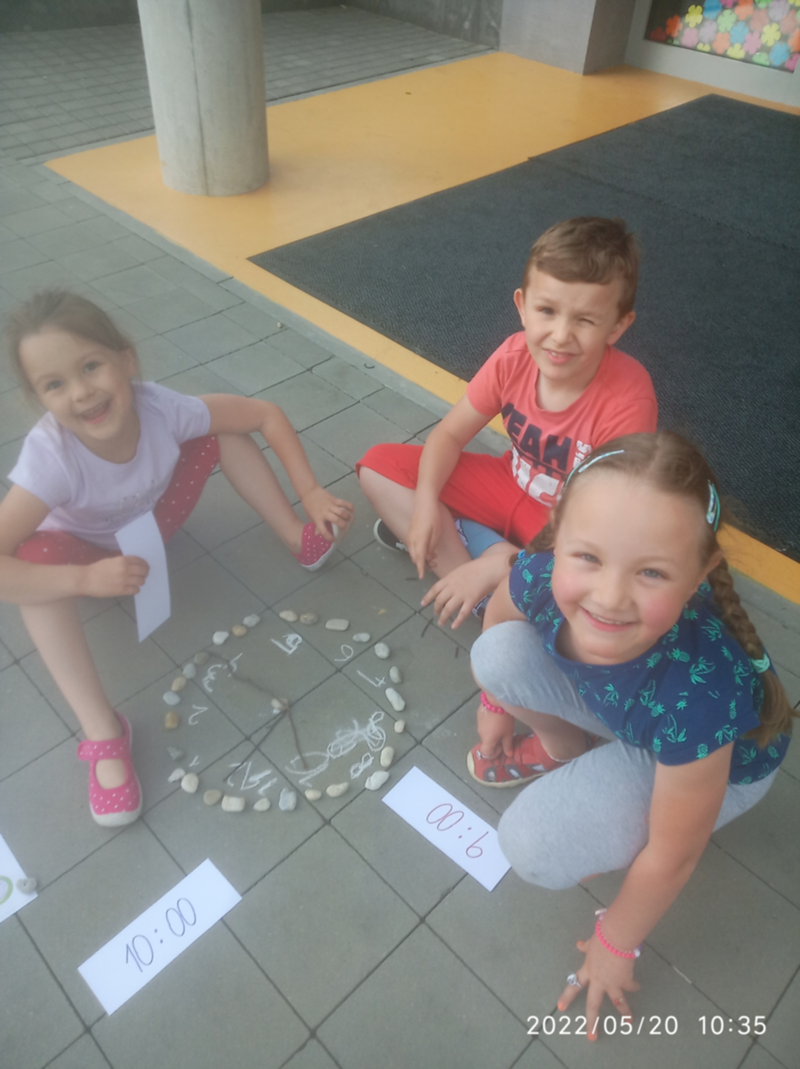 V prvouce se nyní prvňáčci učí o čase. Kolik má rok měsíců, jaké části má den a také určování času na hodinách. A tak jsme si je šli vytvořit ven. Určovali jsme čas podle zadání a povídali si o tom, co vše můžeme hodinami, hodinkami či stopkami změřit. Známe různé druhy hodin a víme, k čemu slouží.