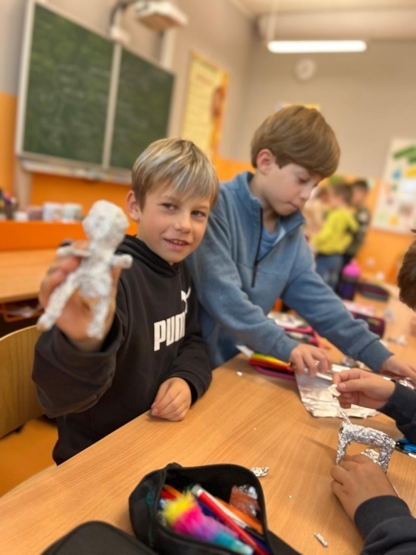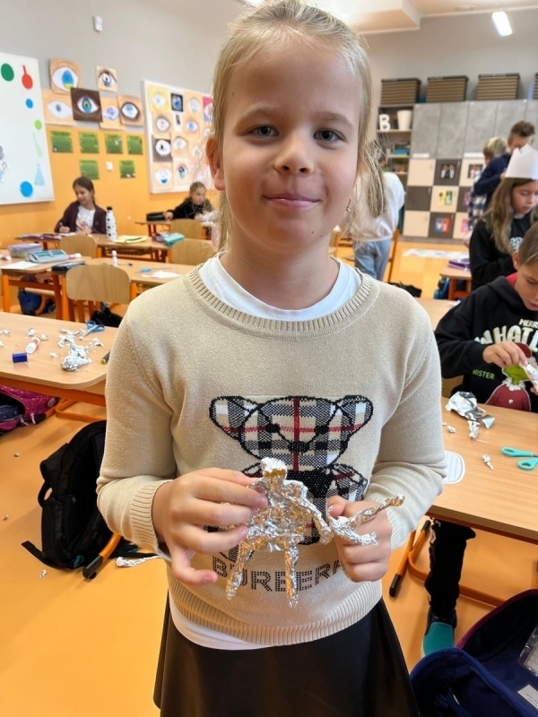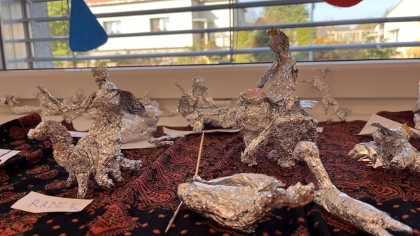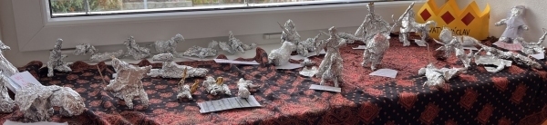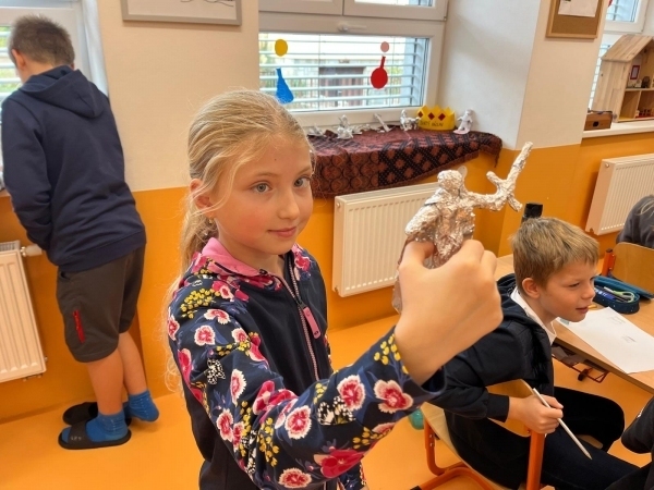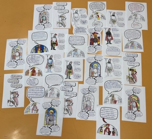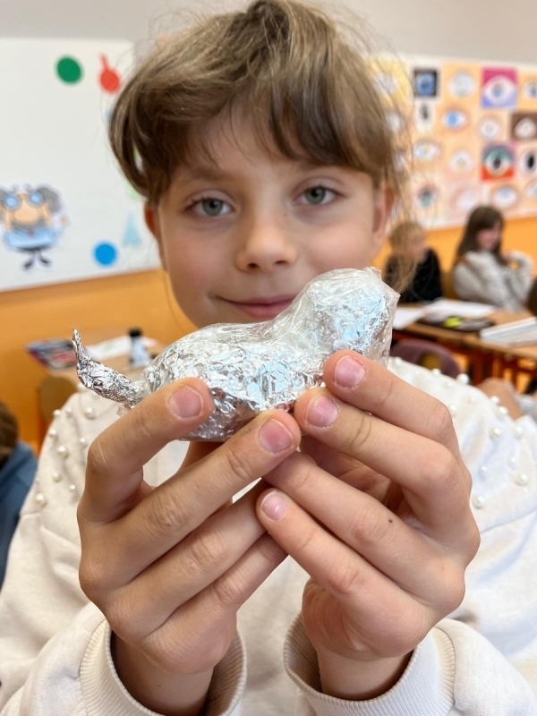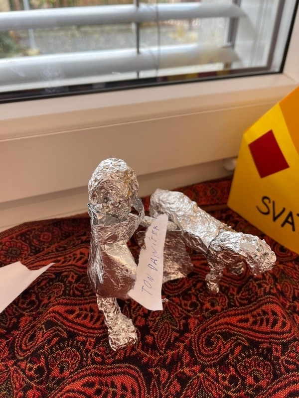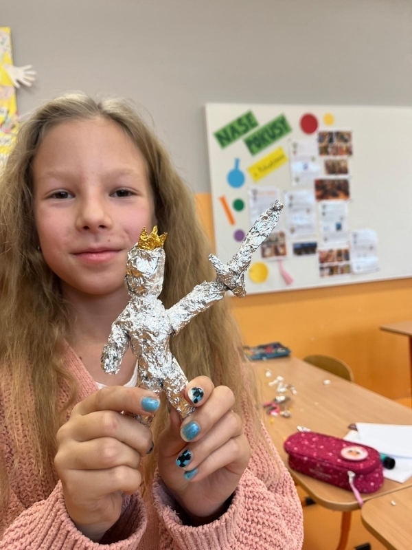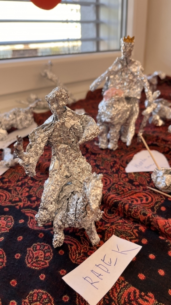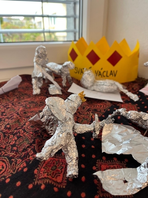 V dílnách psaní jsme se pak proměnili na Václava a představovali se ostatním, vše pak i sepsali a prezentovali ostatním. Velkou výzvou a pomyslnou tečkou za nabitým dnem byla tvorba sochy Václava a jeho koně z alobalu. Dílo se vydařilo a dělá nám radost.