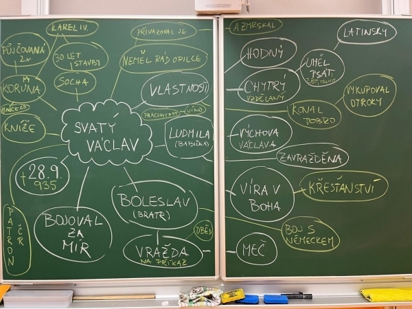 Ve čtvrtek jsme si udělali projektový den a společnost nám dělal svatý Václav. Vytvořili jsme pojmovou mapu, nejprve z informací, které jsme věděli, a pak jsme doplnily mapu o informace získané v průběhu hodiny českého jazyka i během řešení slovních úloh o Václavovi.